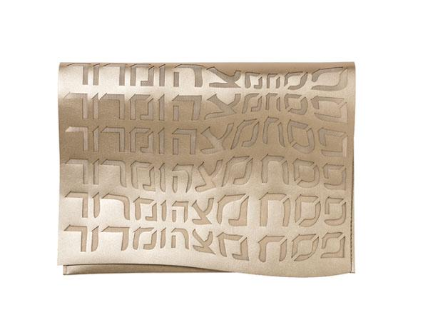 For this contemporary bag, we created an elegant look using a laser cut technique to write the hebrew words in a modern font "Pesach", "Matzah" and "Maror" repeated all across the lid of the bag, to have the three most important words that need to be discussed in Passover present at the table.