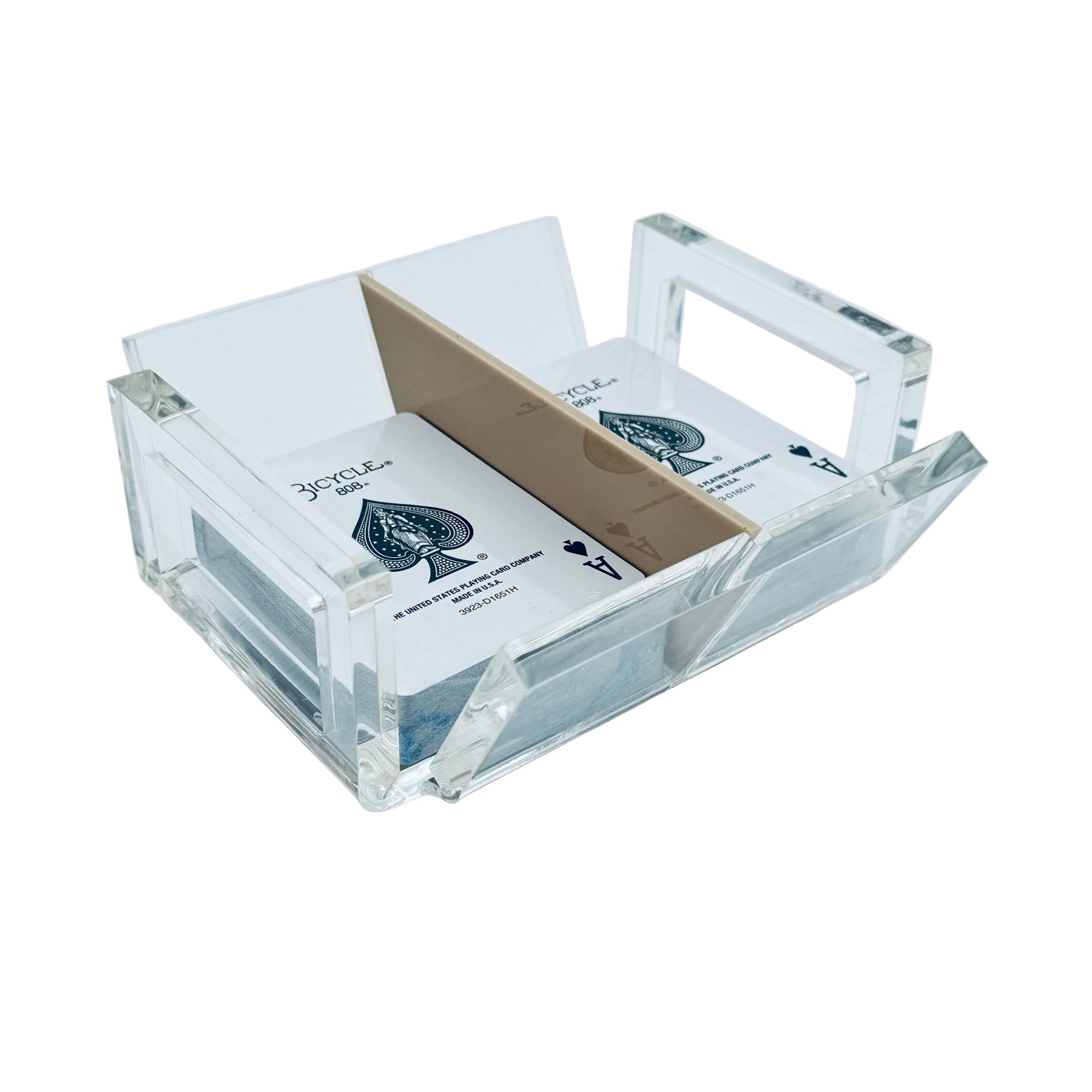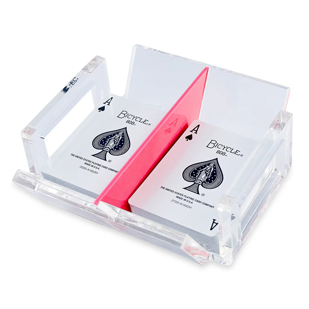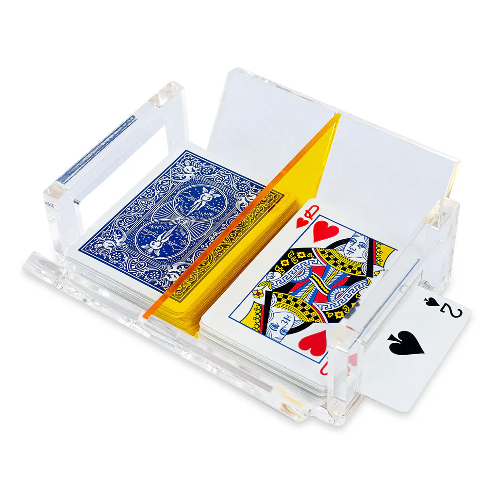 This open canasta tray has 2 sides to pull from, an opening for turn cards and a spinner. Great for play with 2 or 3 decks at a time. It comes with 2 decks of playing cards.