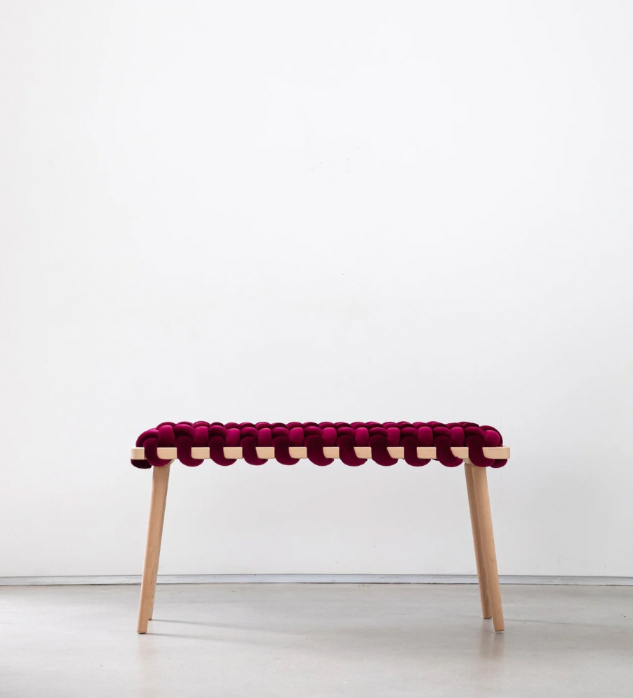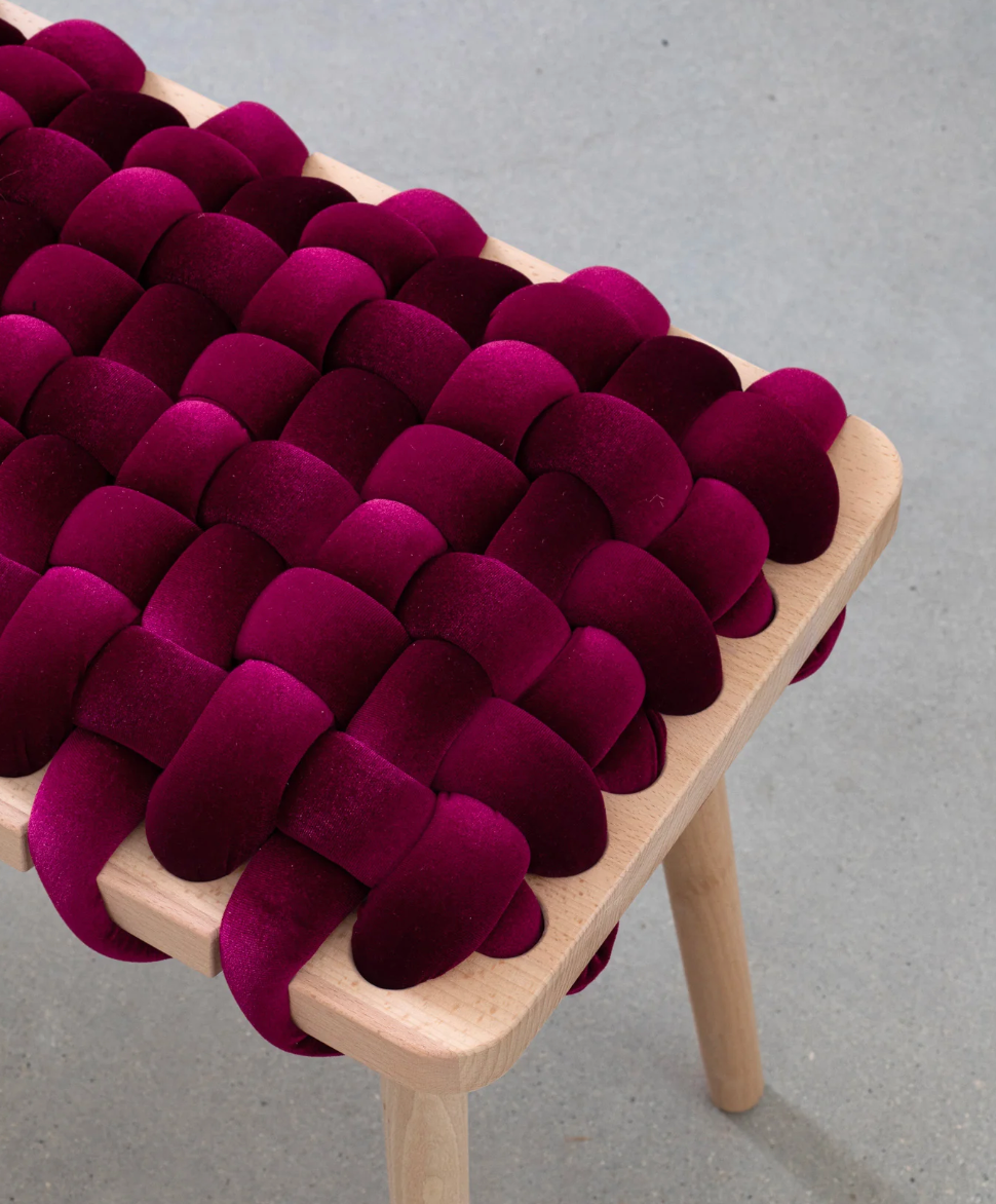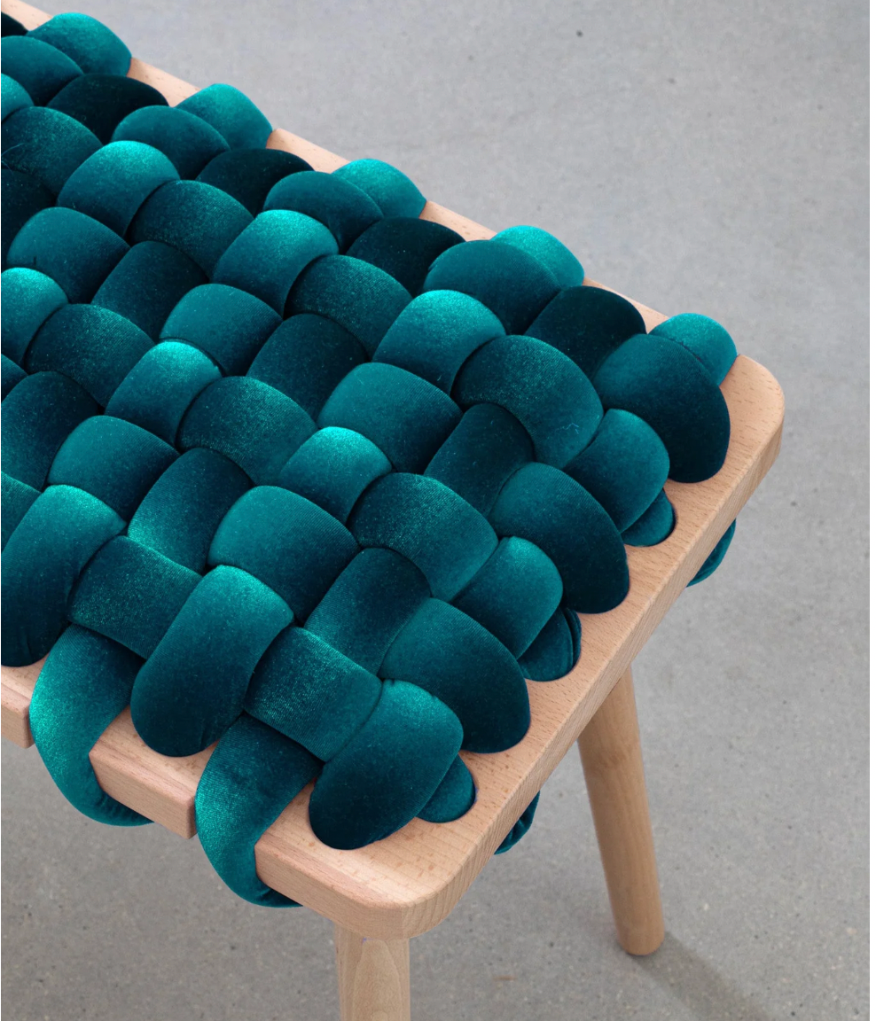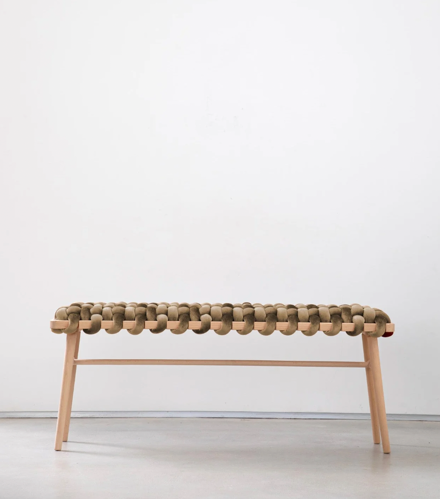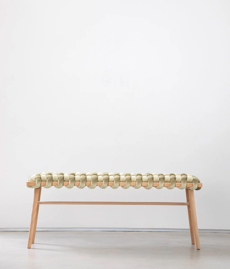 The woven bench is a meticulously crafted piece that adds a playful yet sophisticated touch to any entryway or living area. Using a unique weaving technique, this handmade bench combines soft velvet fabric and durable Beechwood for both aesthetic and functional value that will endure for years to come.