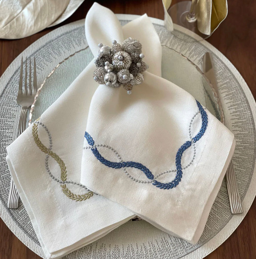 Introducing our Ribbon Twirl Napkins! Ideal for both casual brunches and formal dinner parties, these napkins add a pop of color and personality to any occasion. Featuring scalloped edges and vibrant hues, they elevate your dining experience with their playful elegance. Mix and match with our coordinating placemats for a cohesive look, or let the napkins shine as statement pieces on their own.