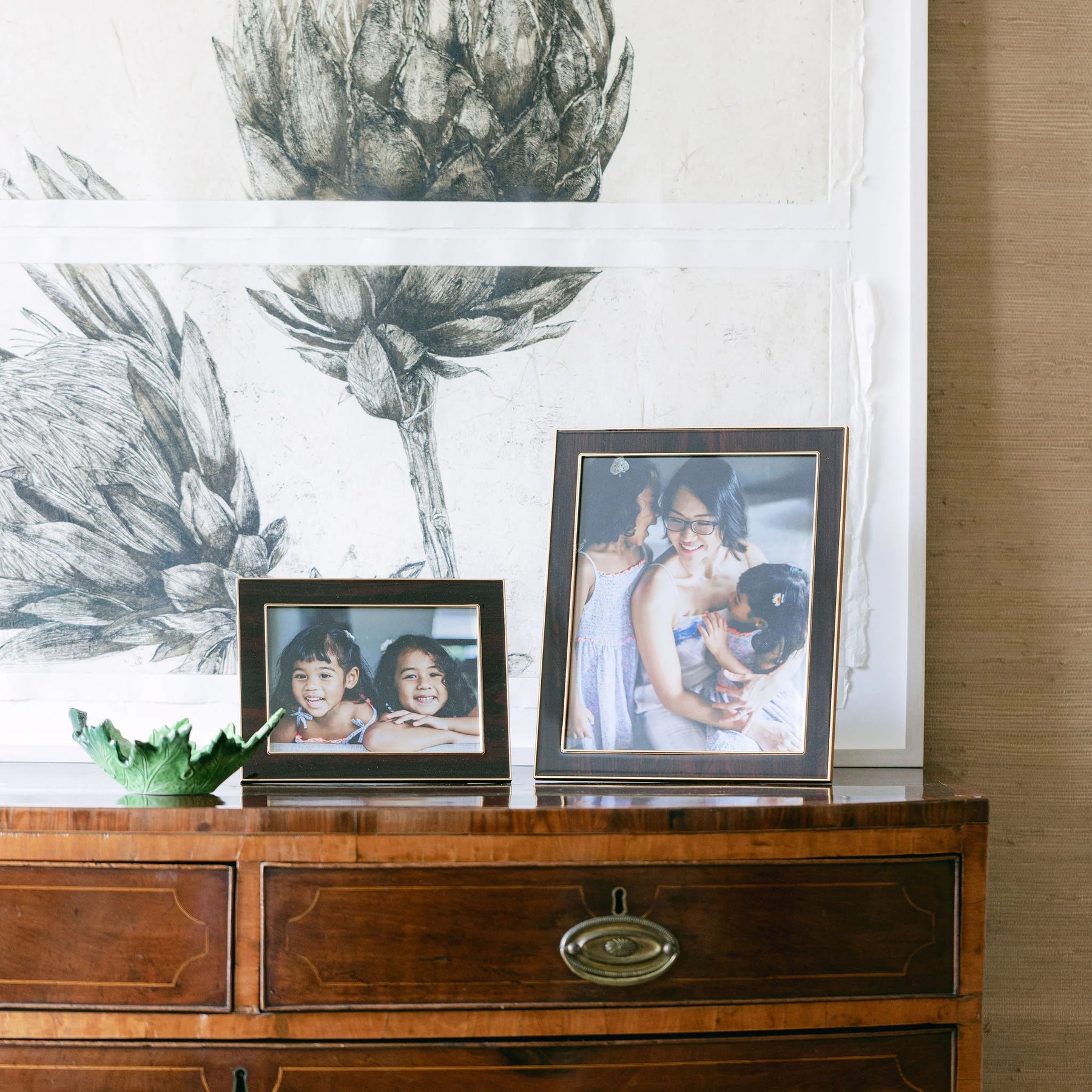 Our exclusive Toscana collection combines the enameled rich wood grain in a gold plated frame backed with luxurious grey velvet. This stunning frame is in a dark rich ebony shade. Beautifully tissue wrapped and gift boxed in our stunning branded packaging.