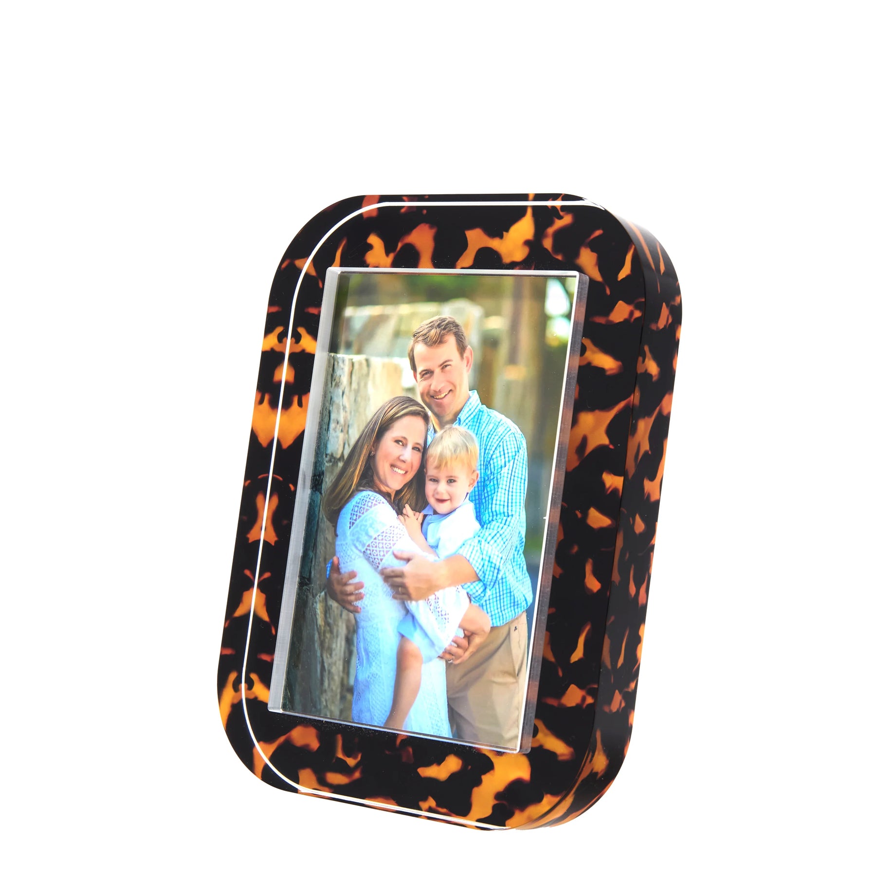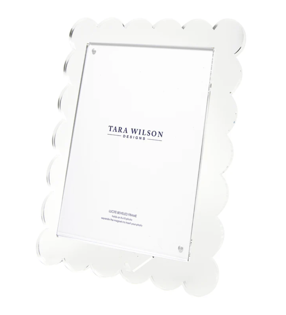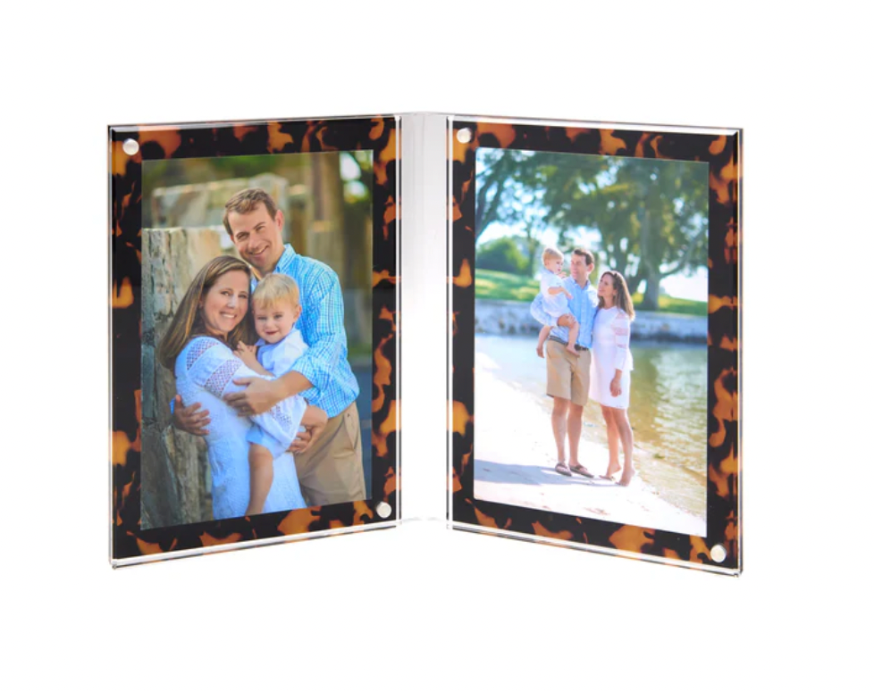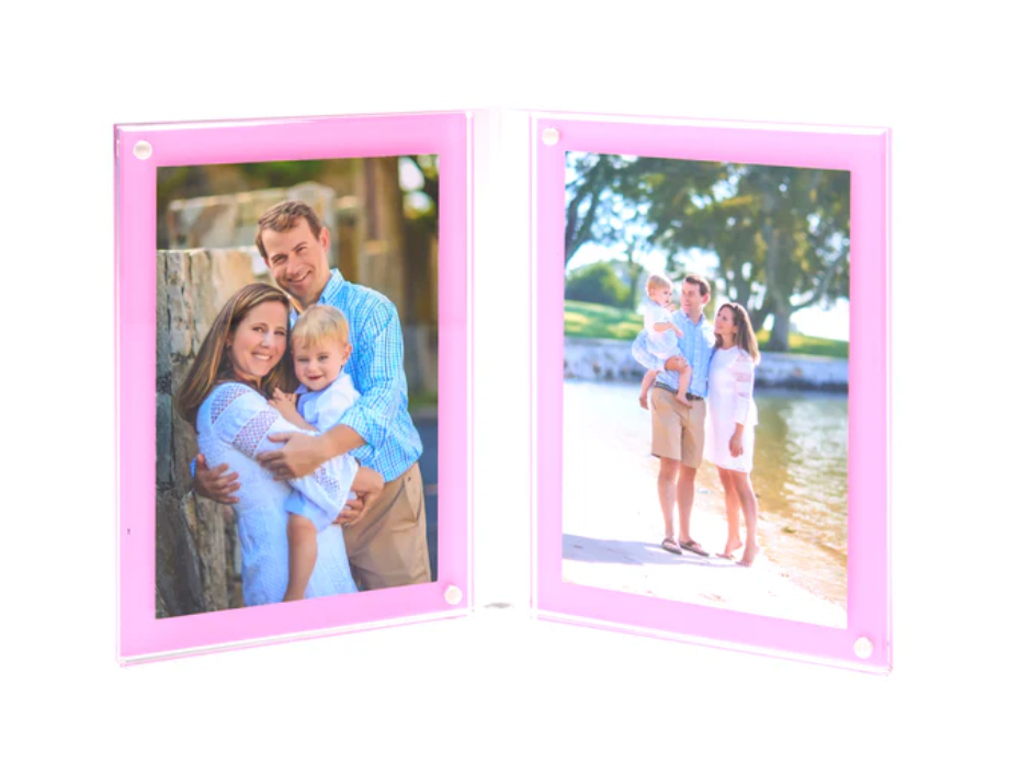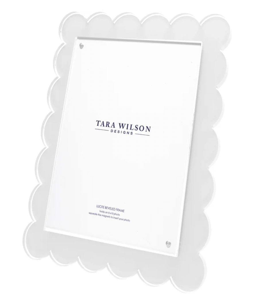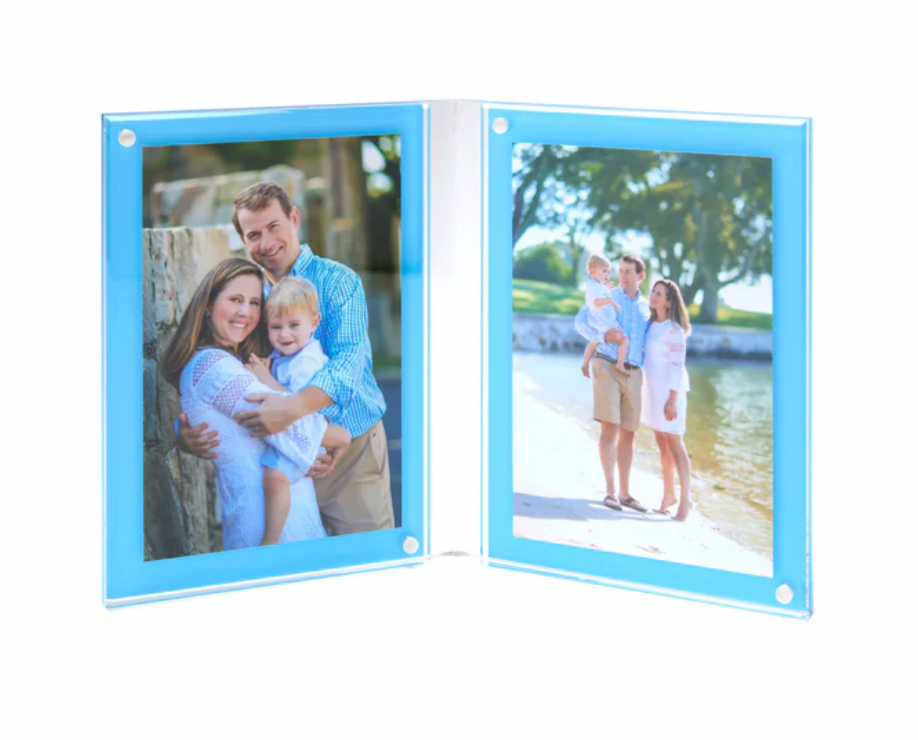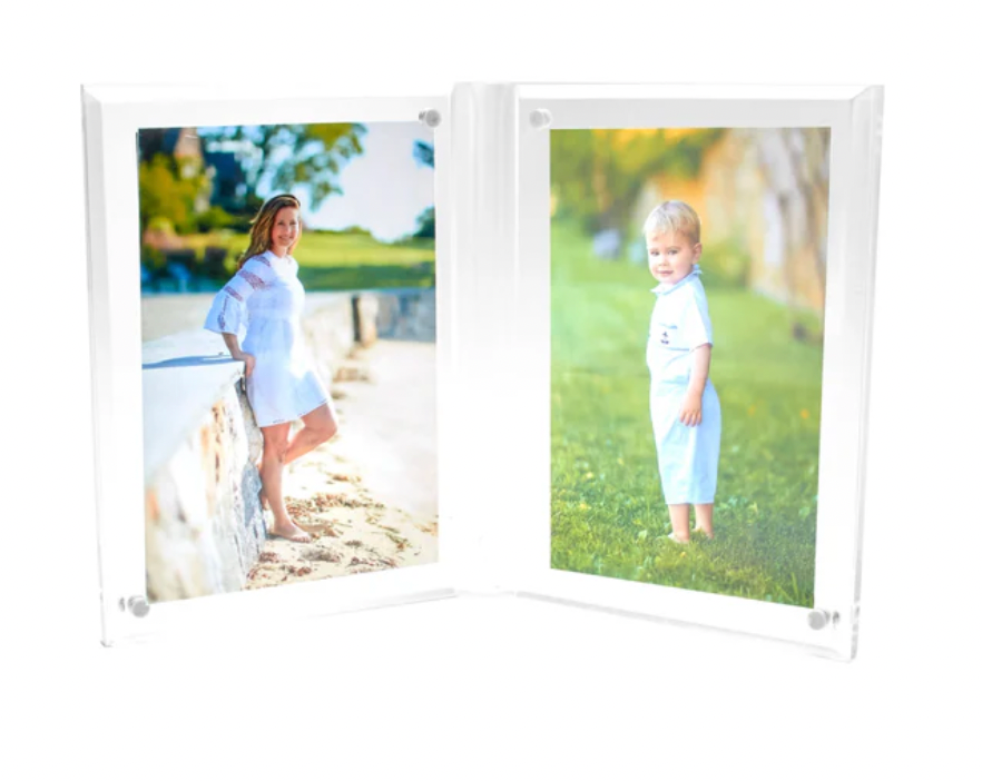 Details: clear lucite, built in magnets for easy assembly, frame stands landscape or portrait.