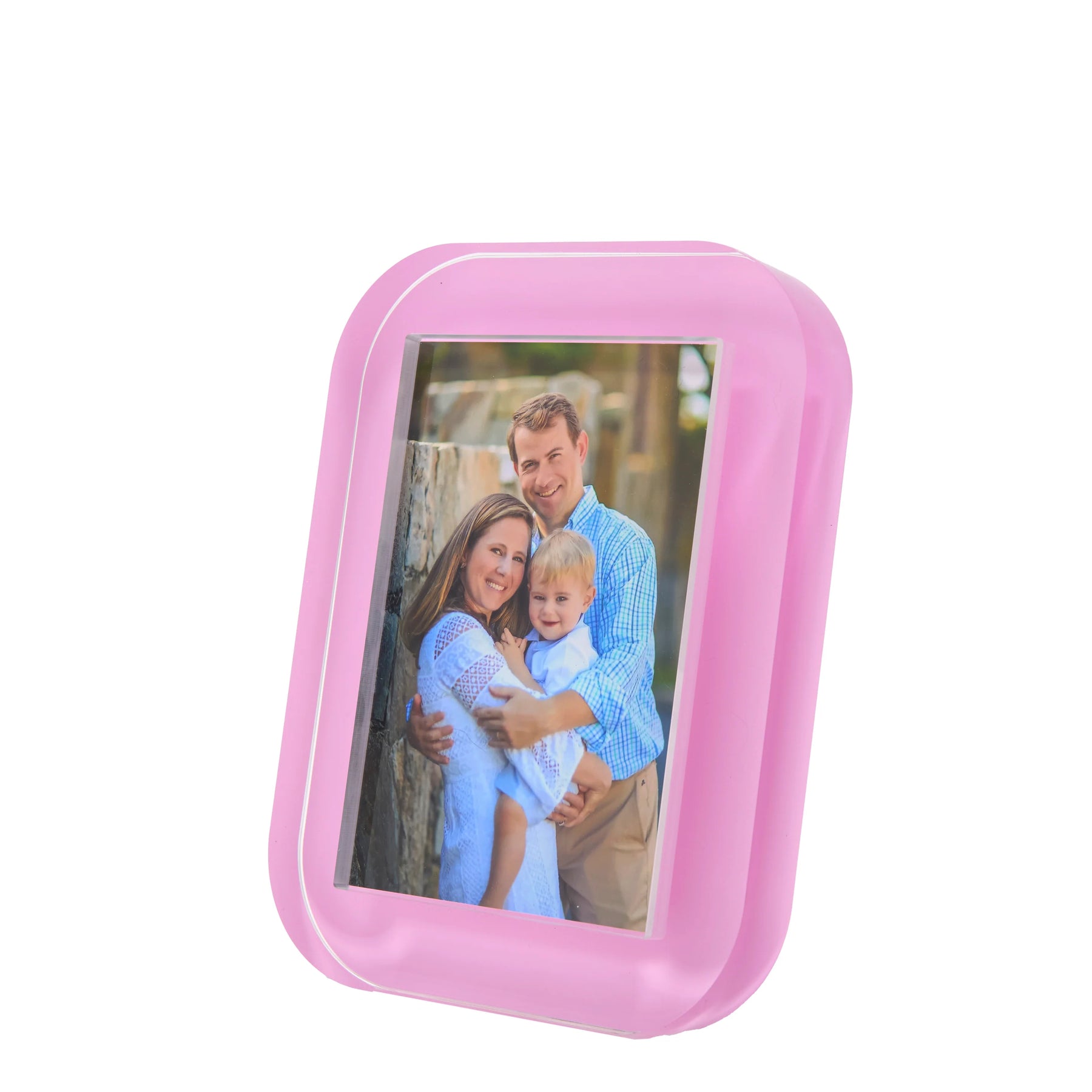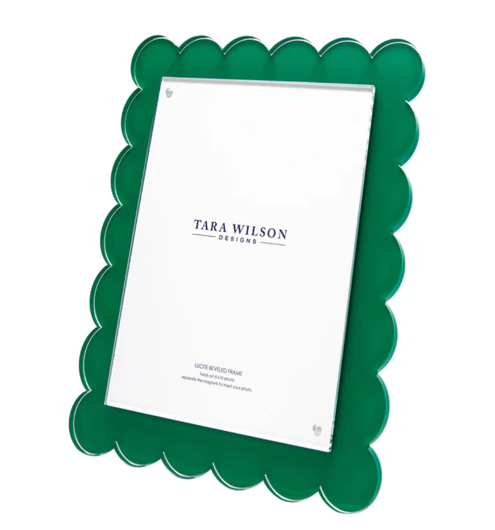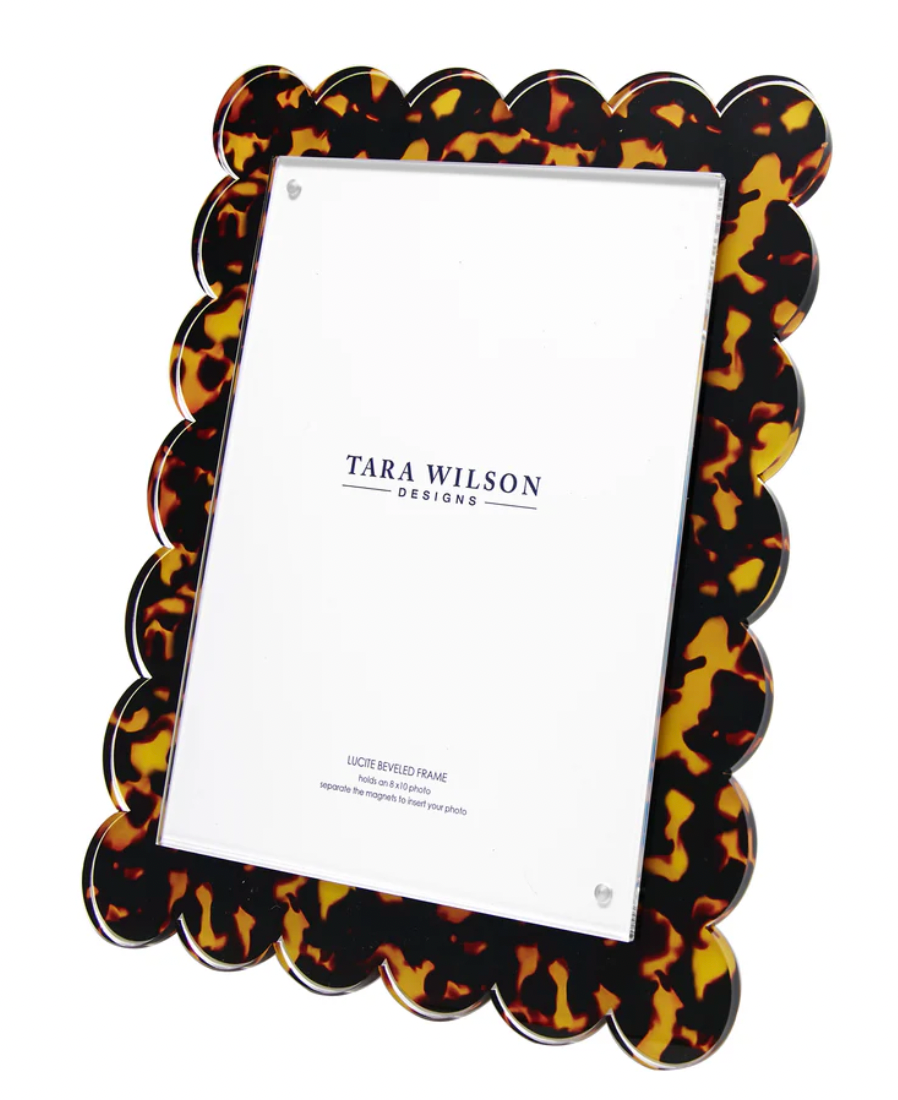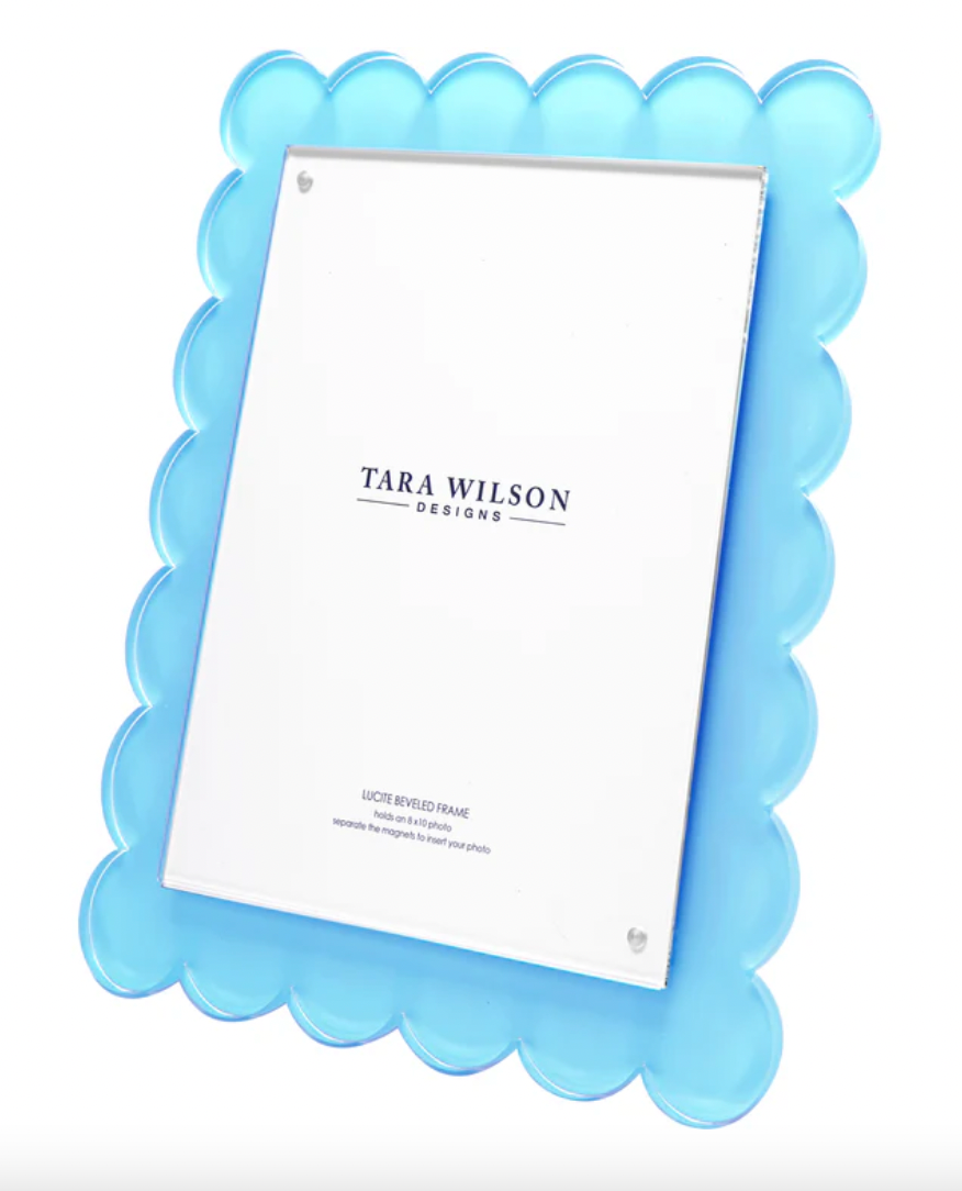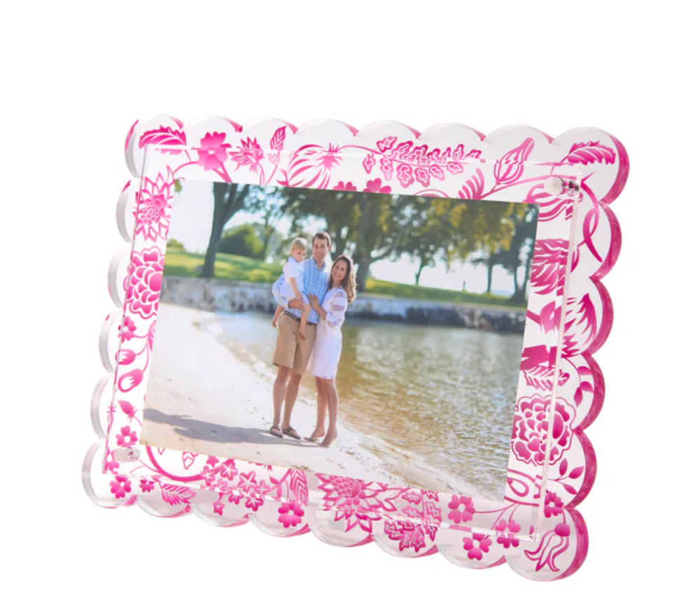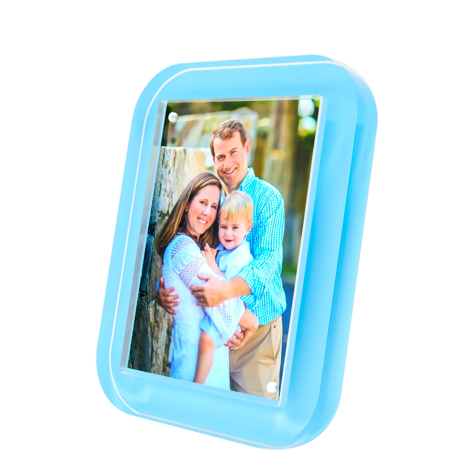 Details: clear lucite, built in magnets for easy assembly, frame stands landscape or portrait.