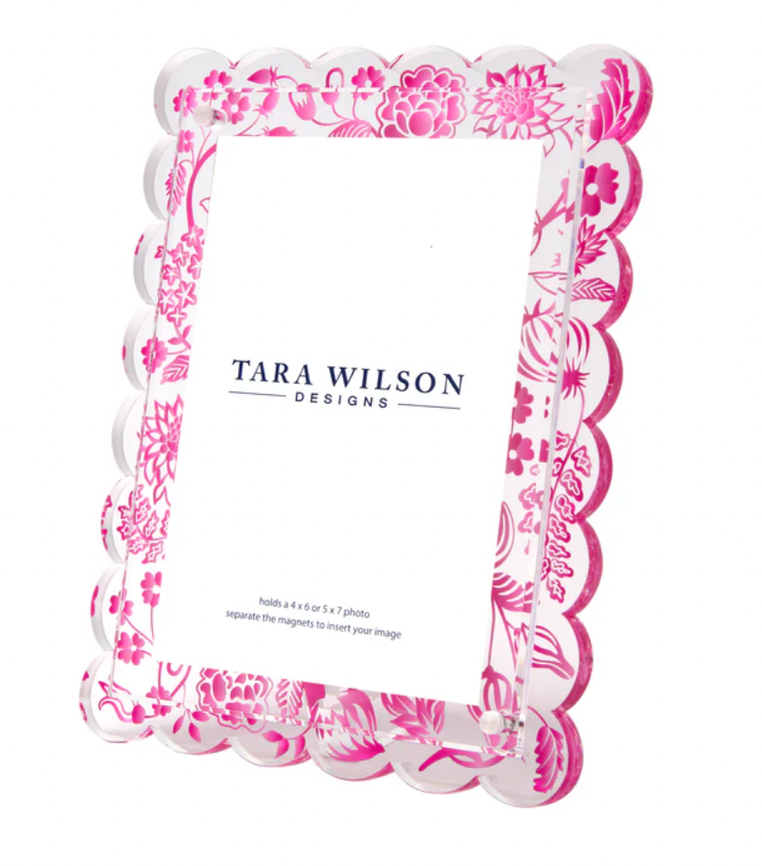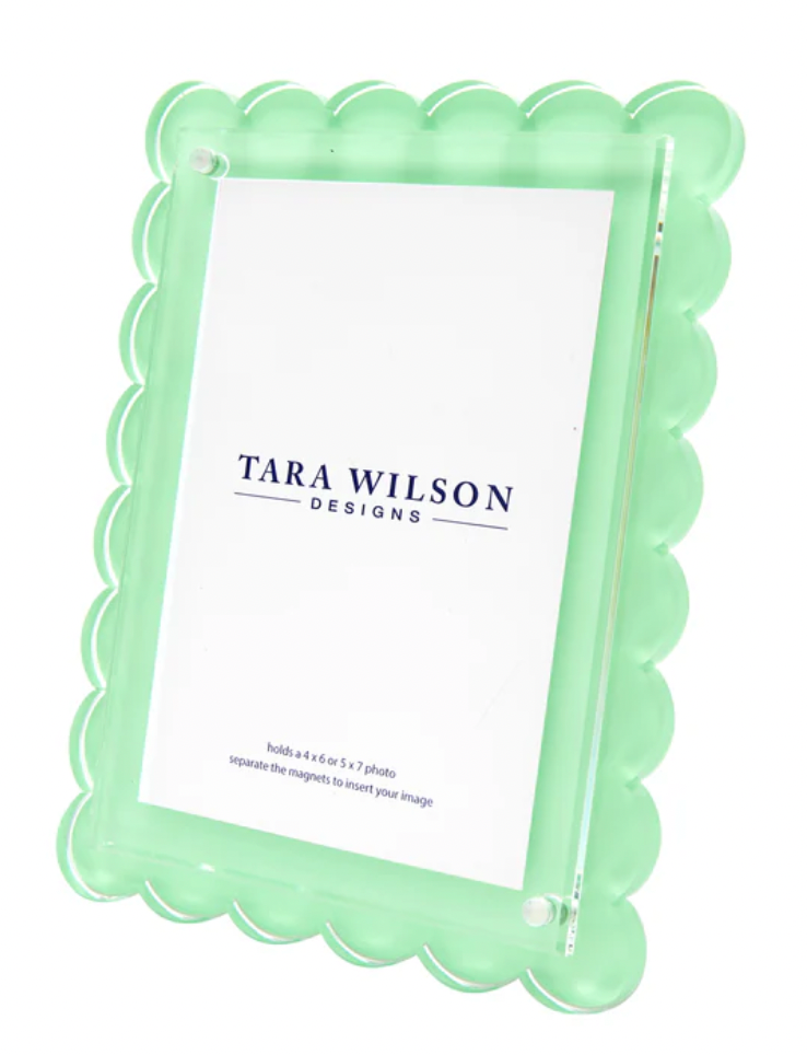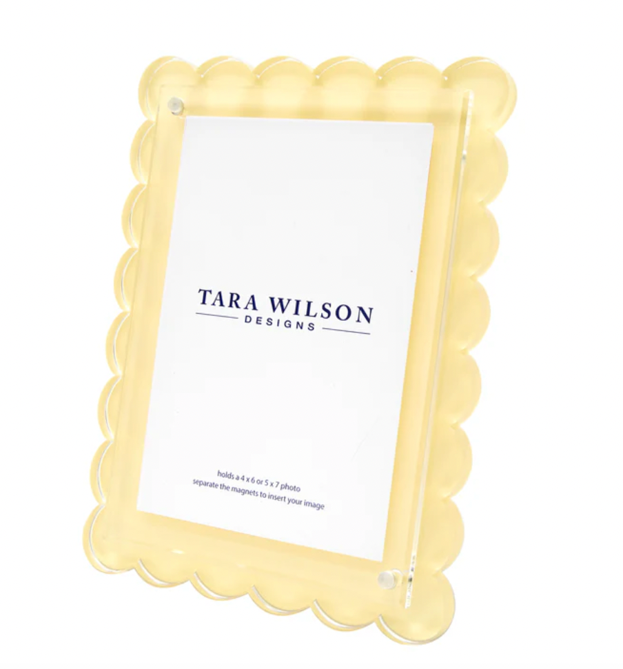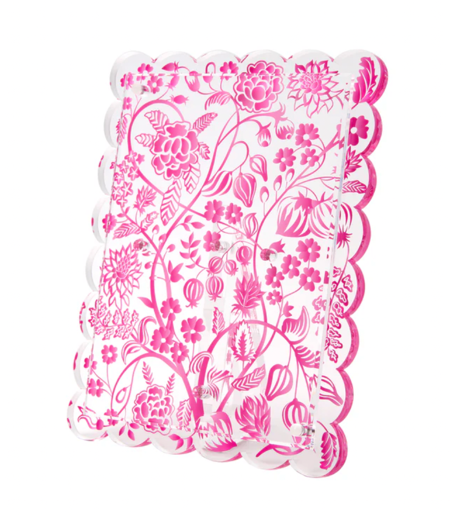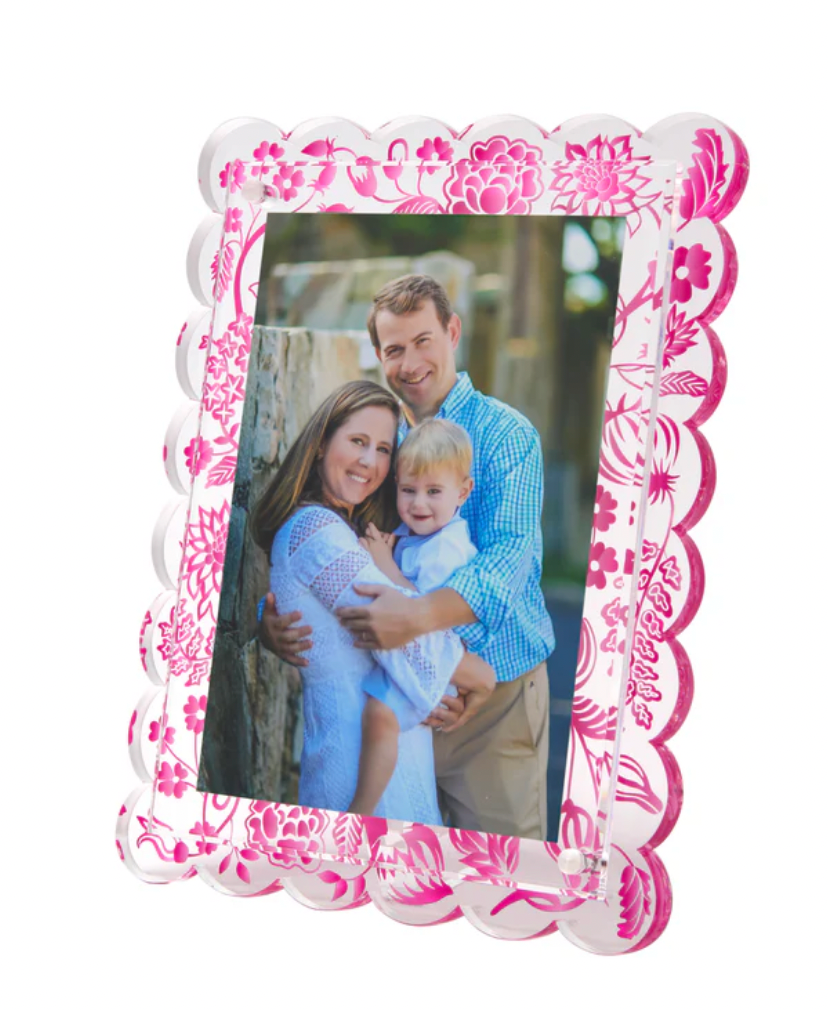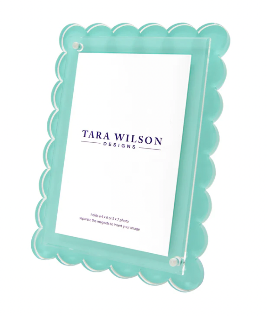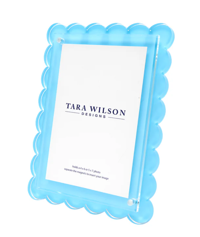 Details: clear lucite, built in magnets for easy assembly, frame stands landscape or portrait.