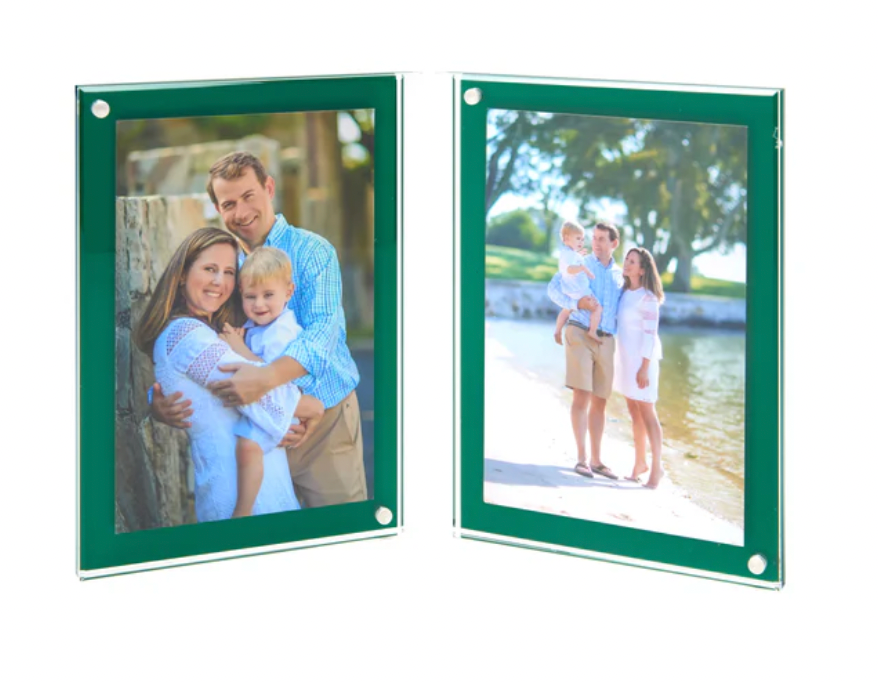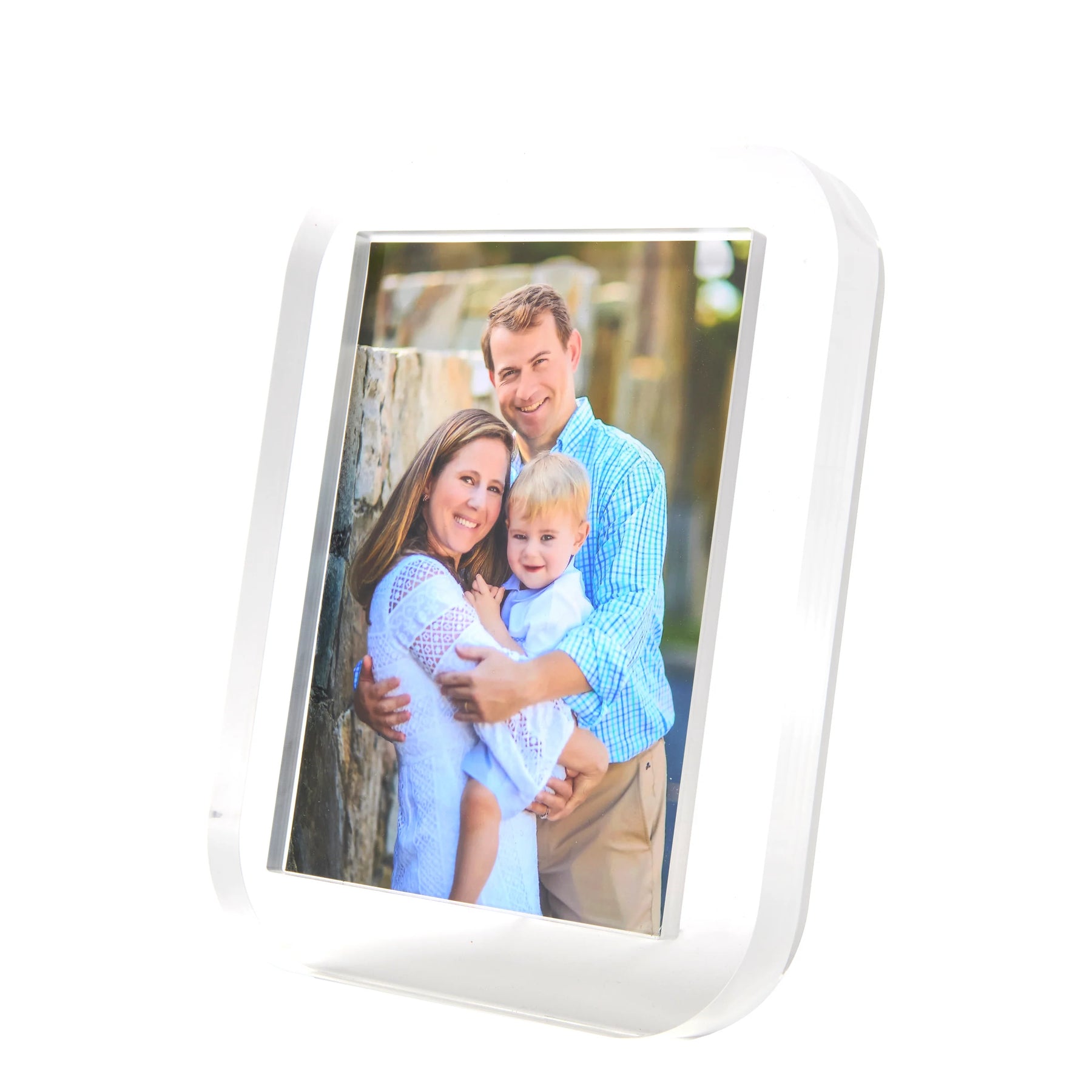 Our pristine double-sided frame stands as a super thick, clear block. Perfect for an office desk, bedside table, bookshelves and make amazing gifts for family, friends, clients on any occasion. Display photos, art, fabrics, messages...