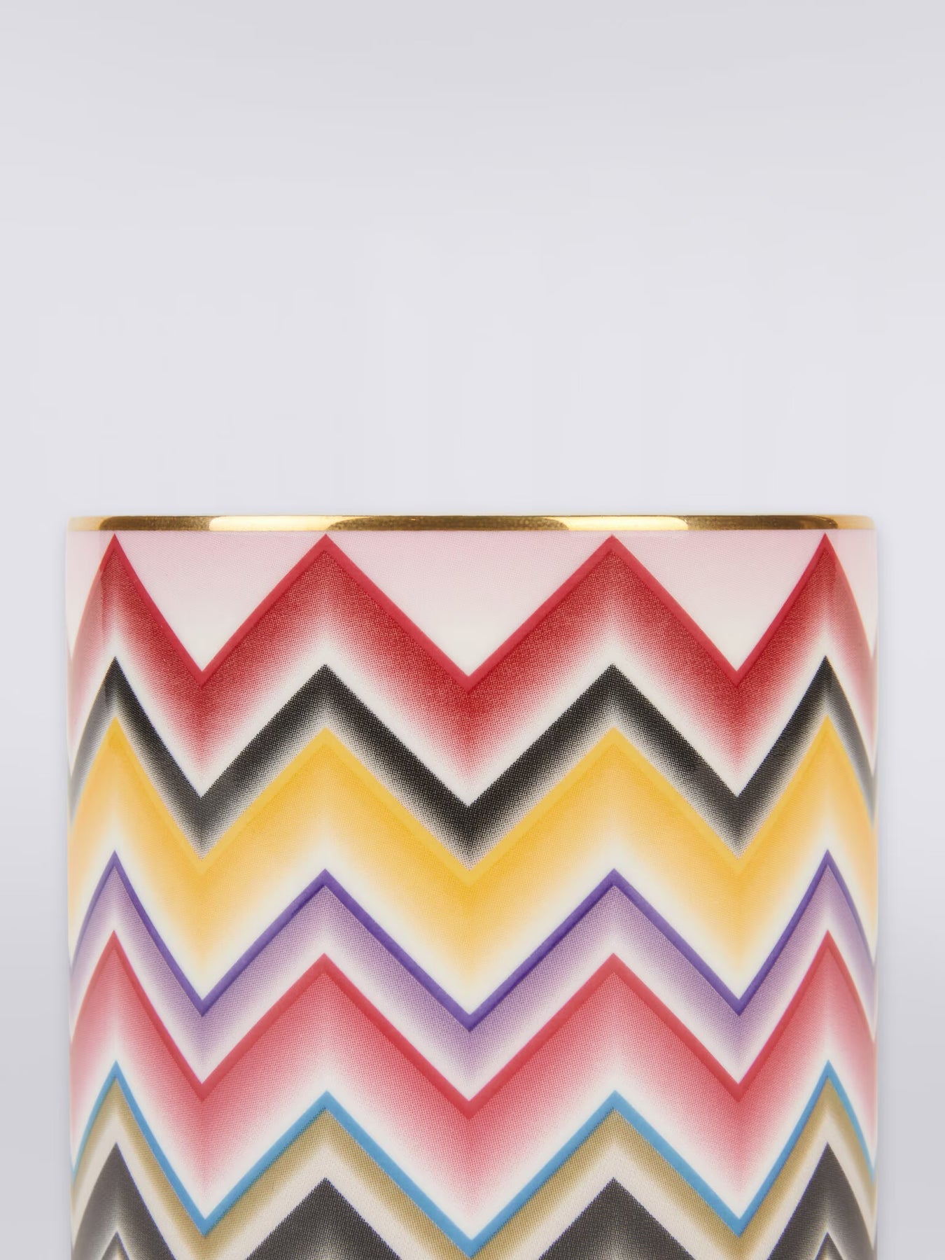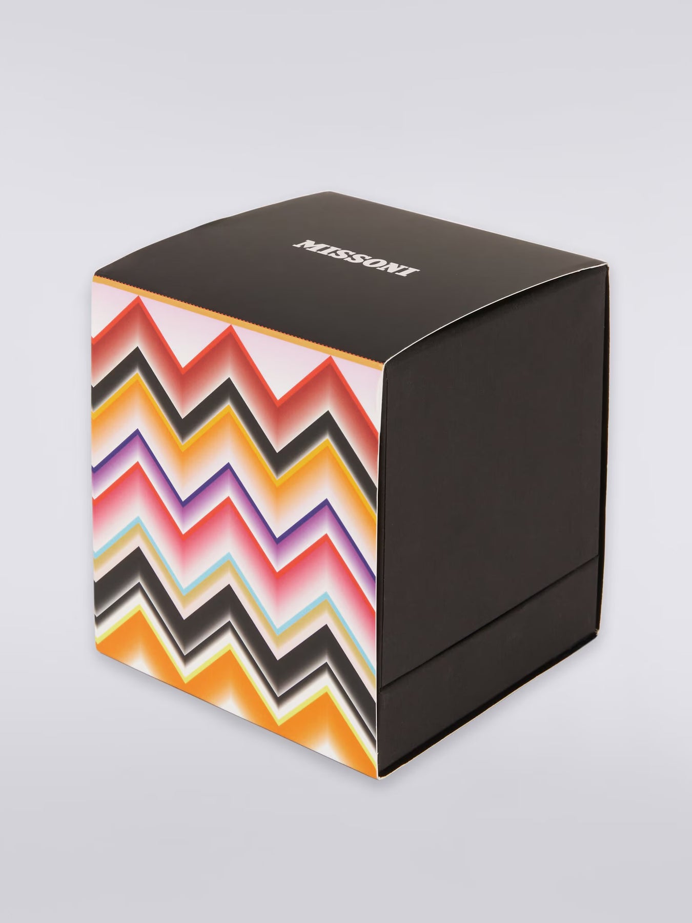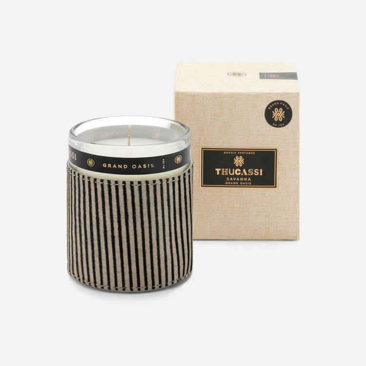 The glass decoration on the Cocody scented candle, featuring a design of yellow baobabs on a grey background, was created in Italy using a glass sublimation method. The design is printed with natural pigments and then delicately placed around the glass, which fuses to the material. The richness of the design then comes to life with the flame, subtly revealed via its transparency.