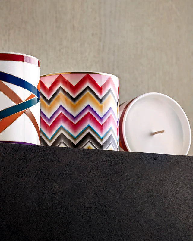 The Kilan scented candle is made in a glass with a shiny effect that allows the flame to shine through. The graphic pattern that covers the glass, whose texture is similar to parchment, is a delicate blend of blue-gray and celadon green.