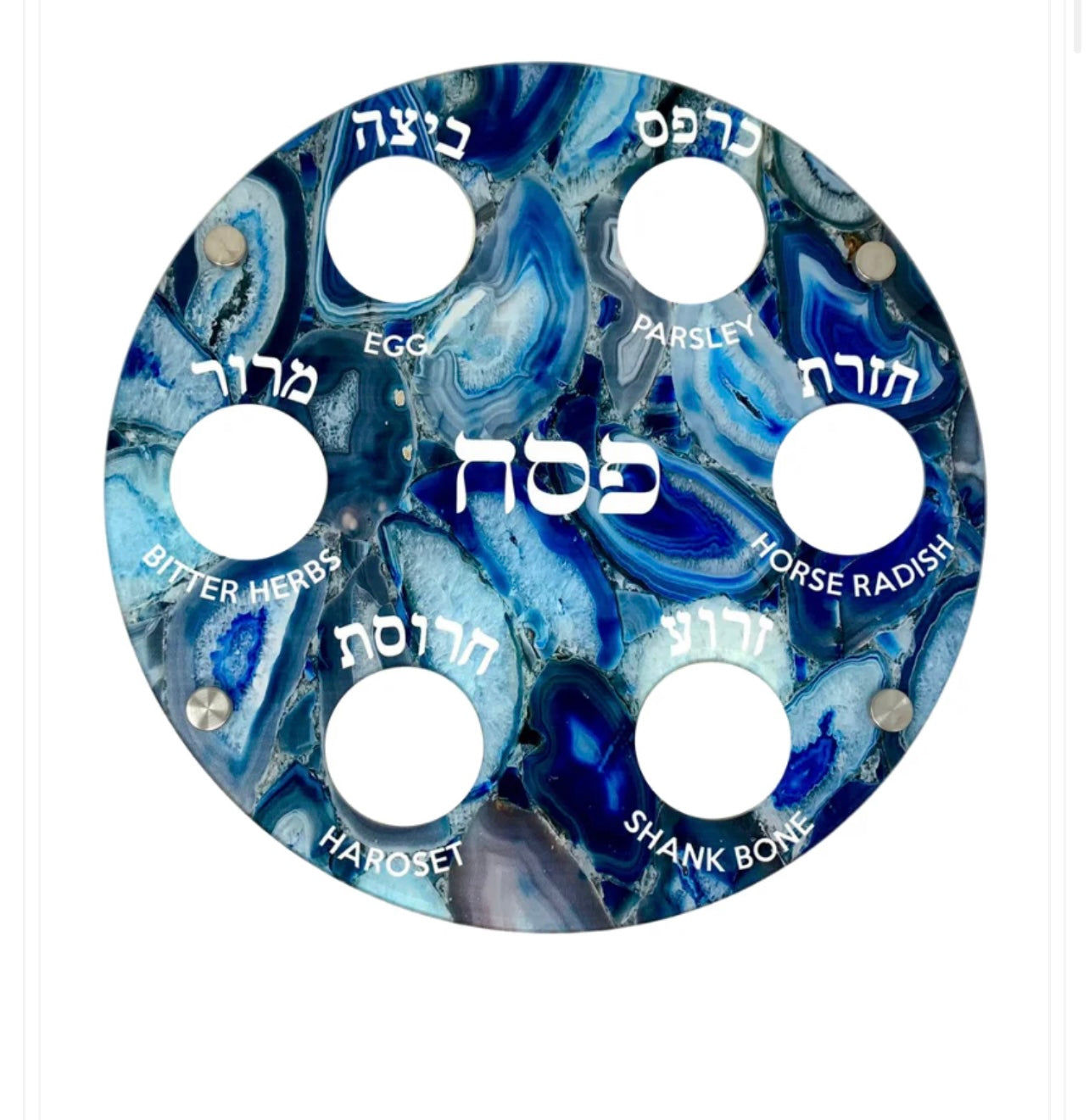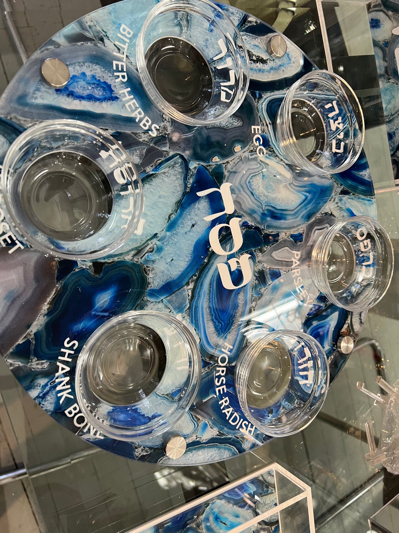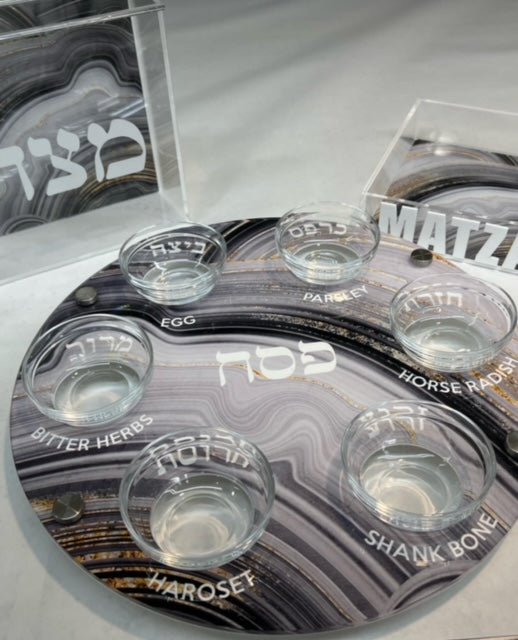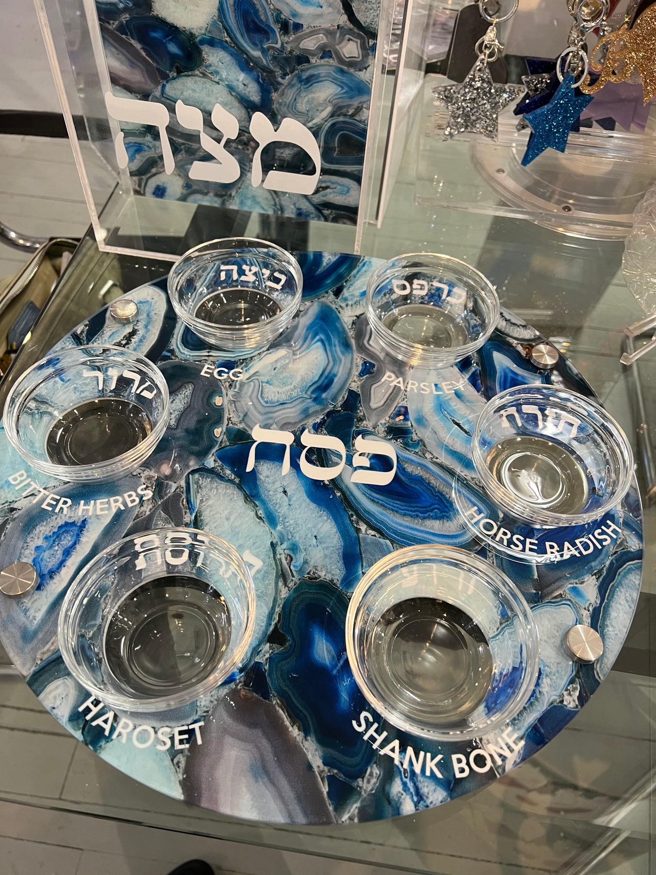 Lucite Agate Seder Plate with 6 glass liners with the names of the Seder symbols. Add charm & a pop of color to your Passover table.
