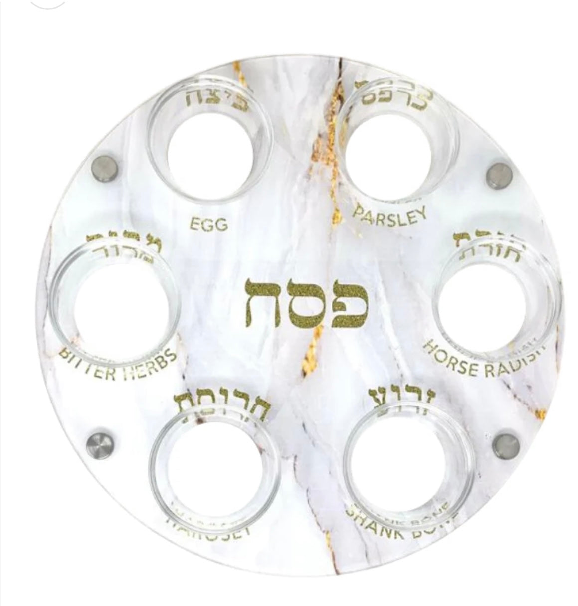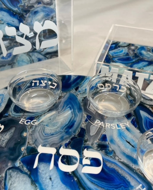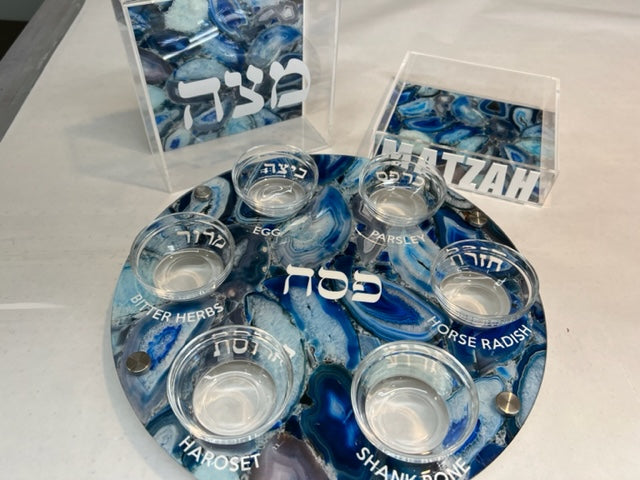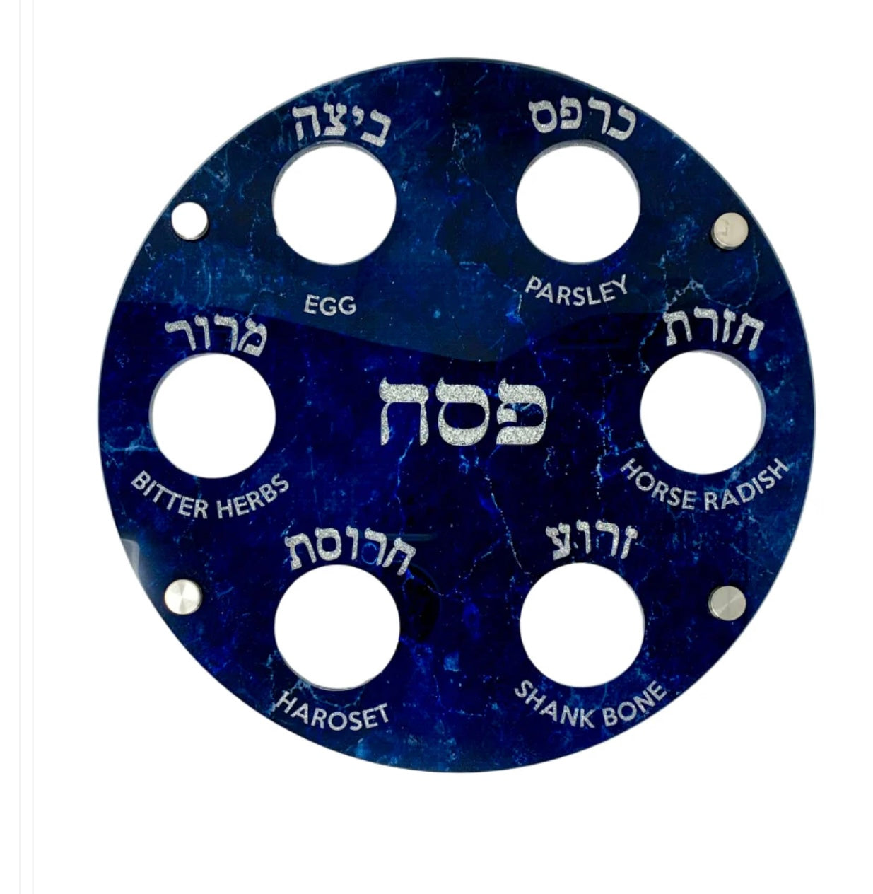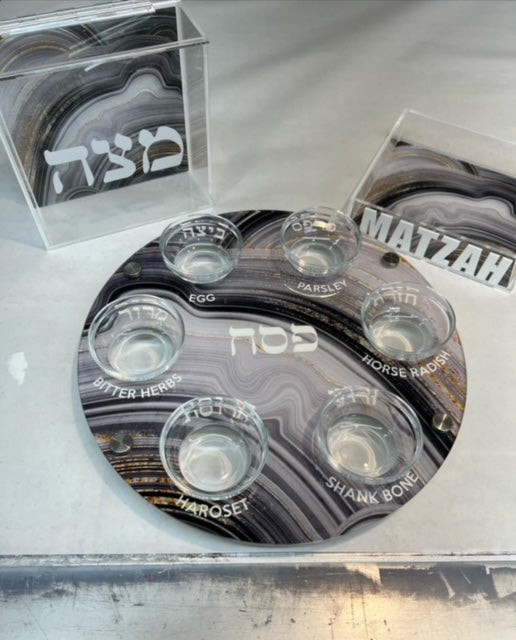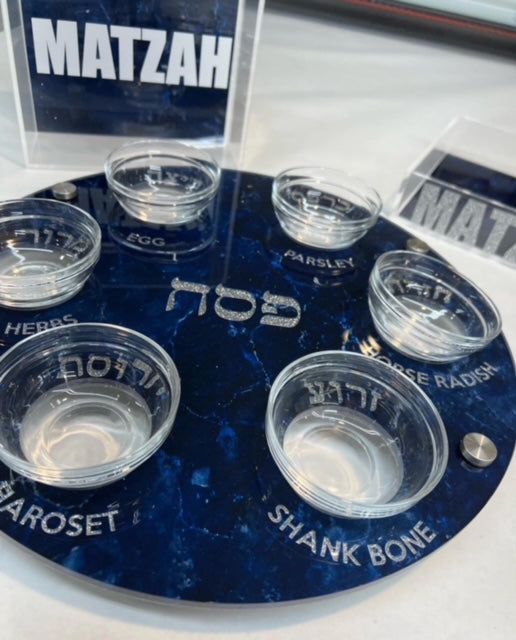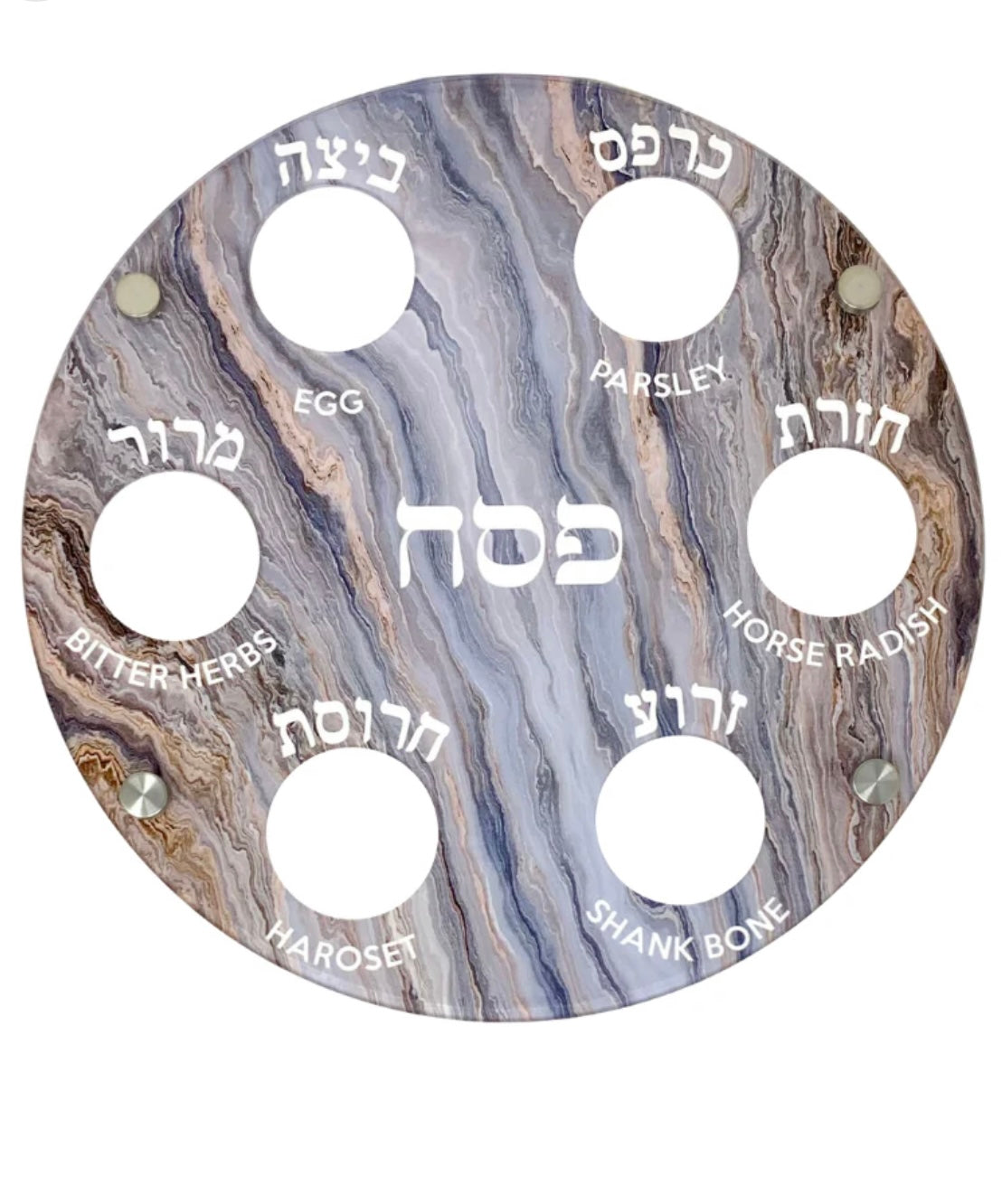 Lucite Agate Seder Plate with 6 glass liners with the names of the Seder symbols. Add charm & a pop of color to your Passover table.