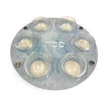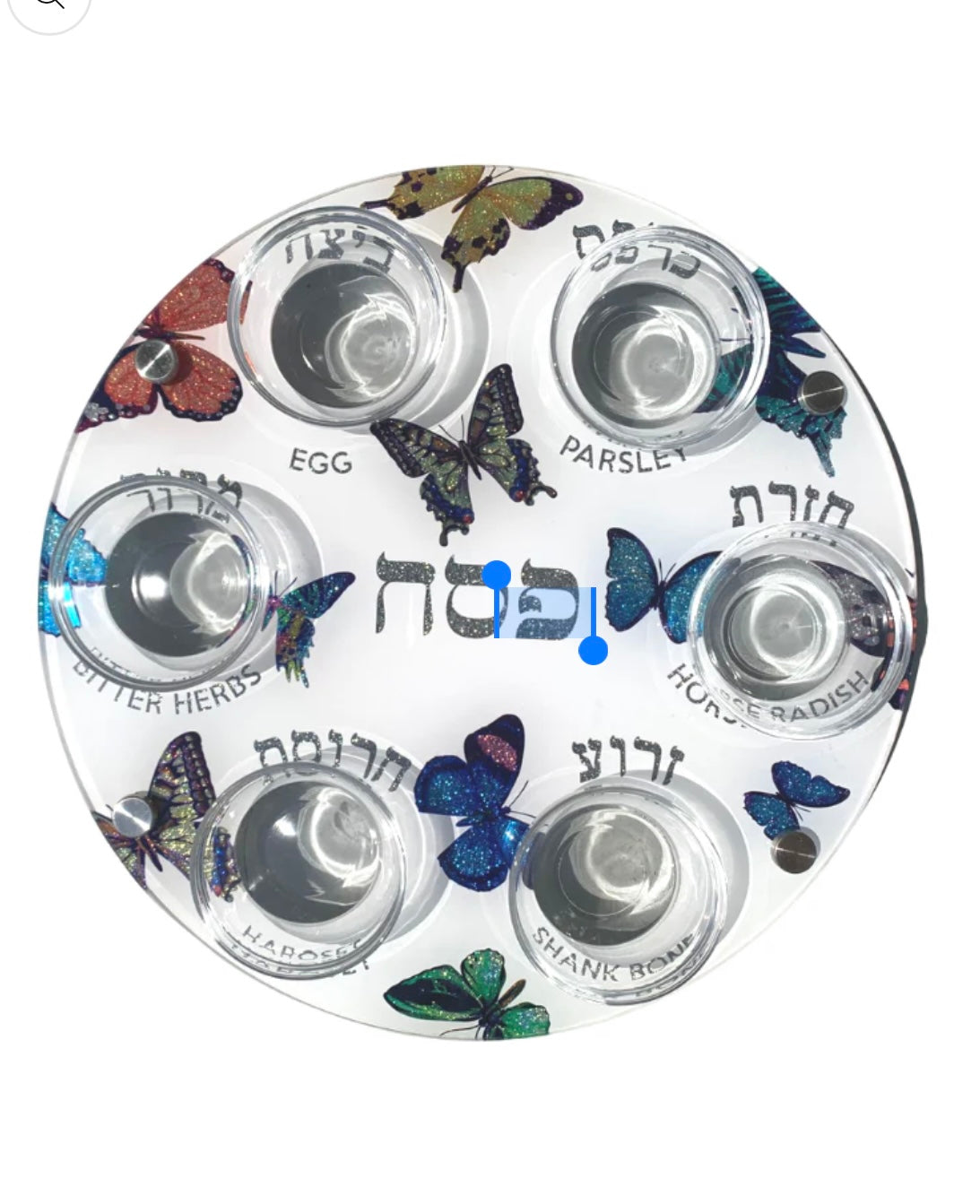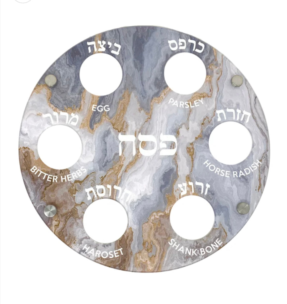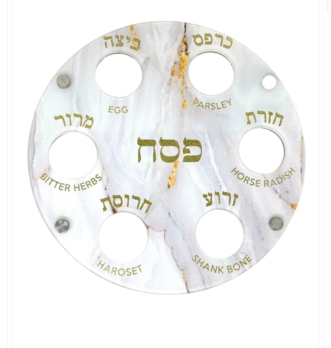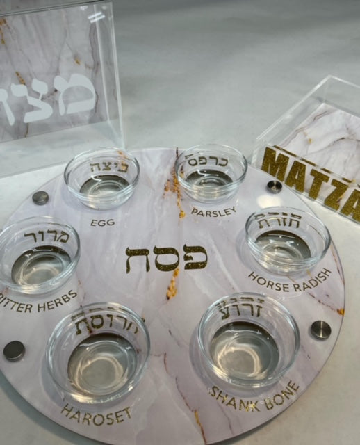 Lucite Agate Seder Plate with 6 glass liners with the names of the Seder symbols. Add charm & a pop of color to your Passover table.