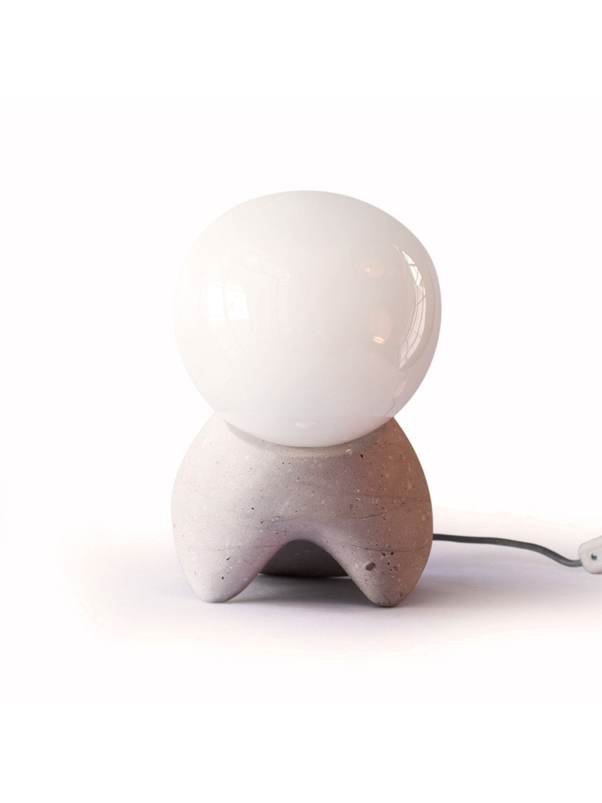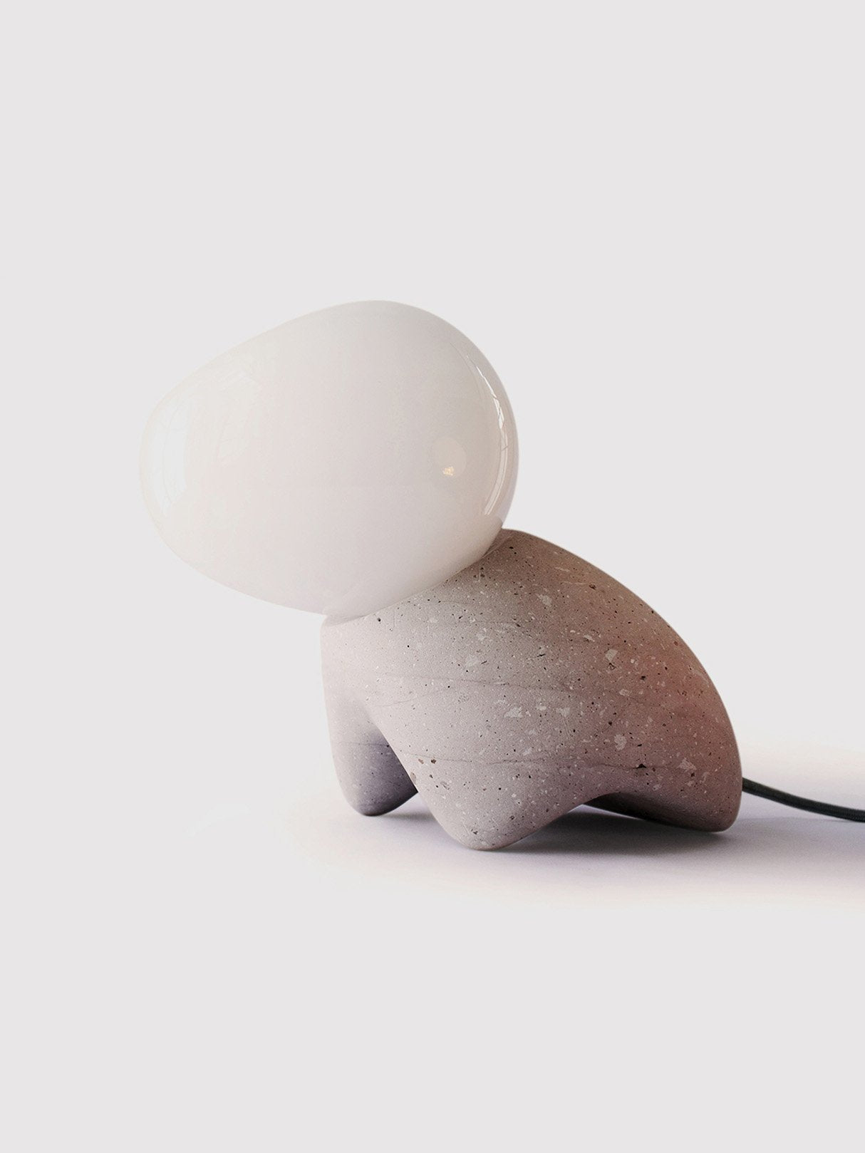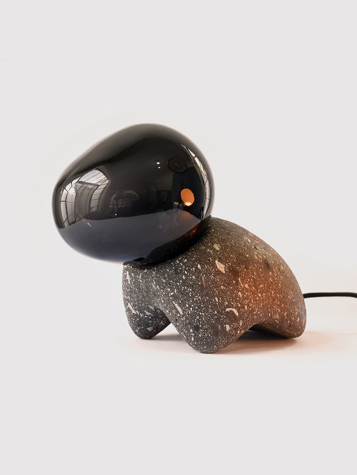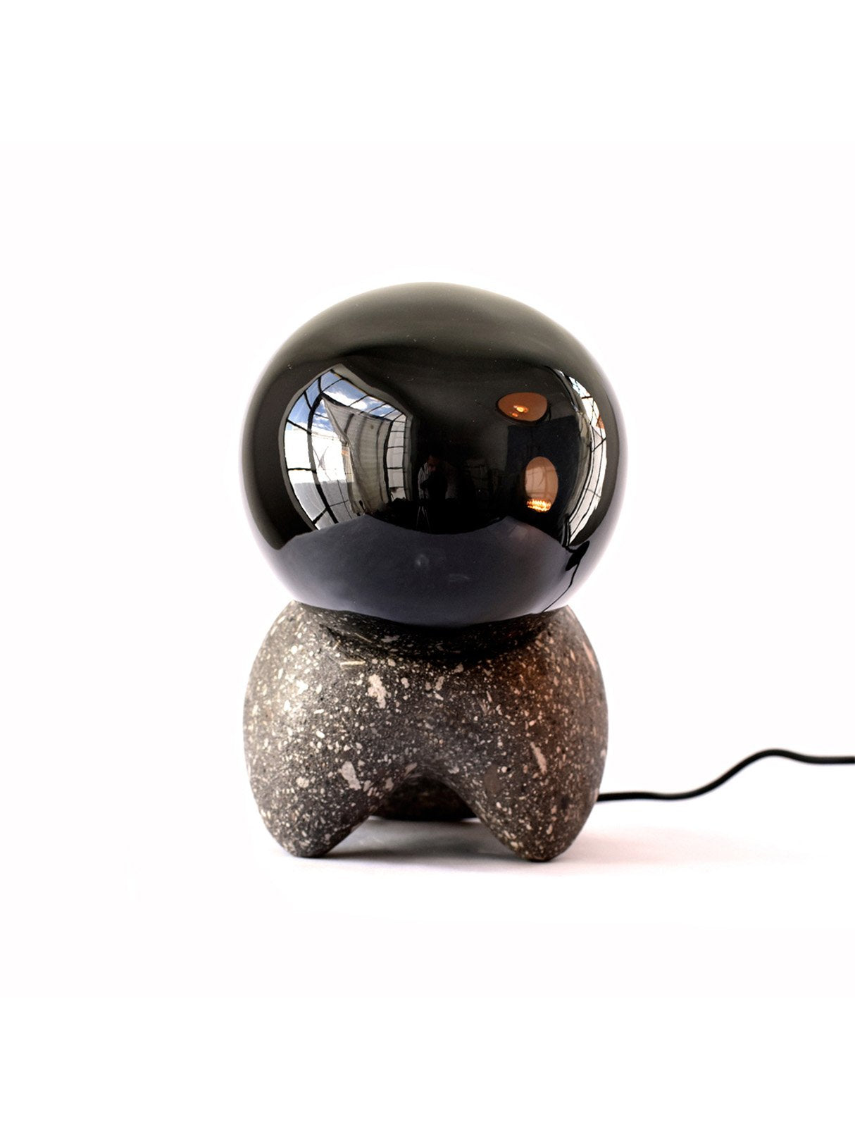 The Dogo table lamp, made of hand carved limestone and hand blown glass, is a charming and playful accent to any room.