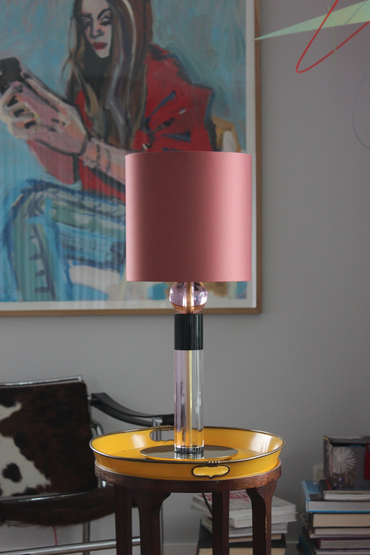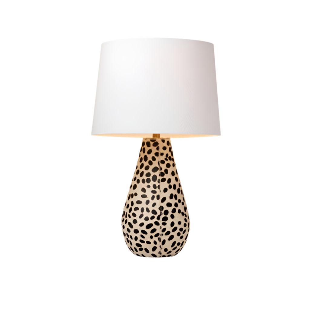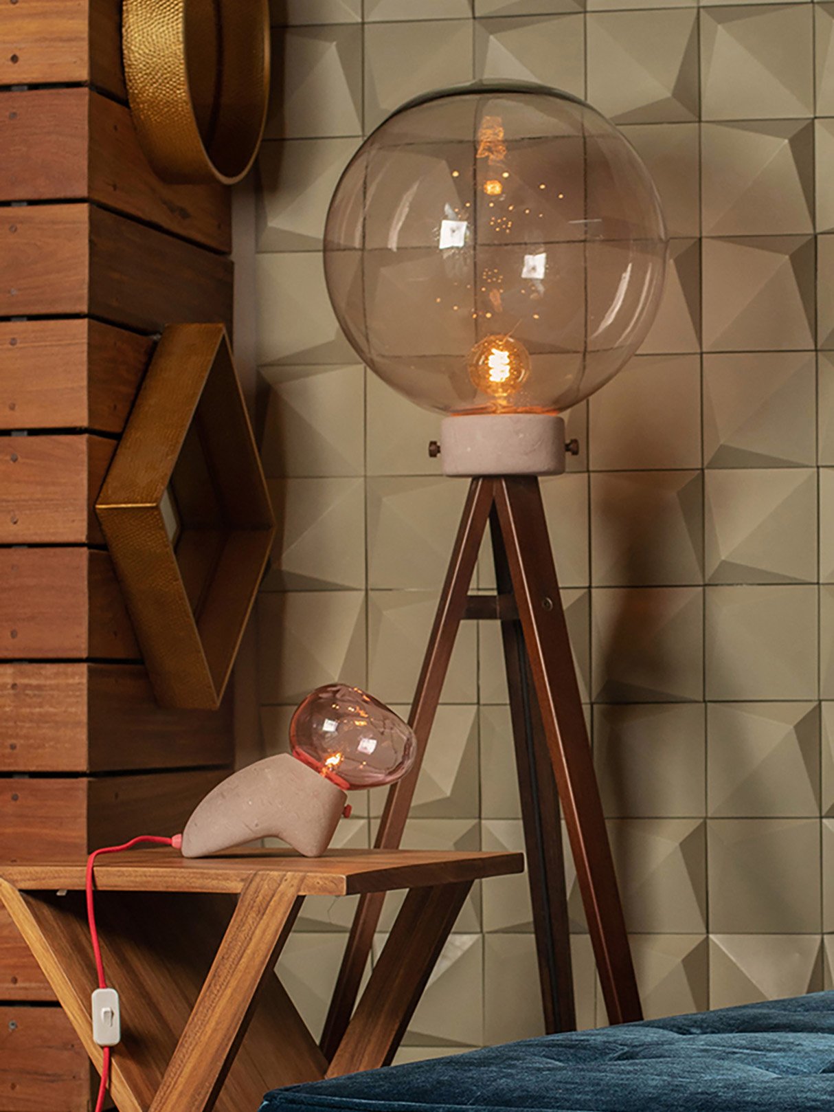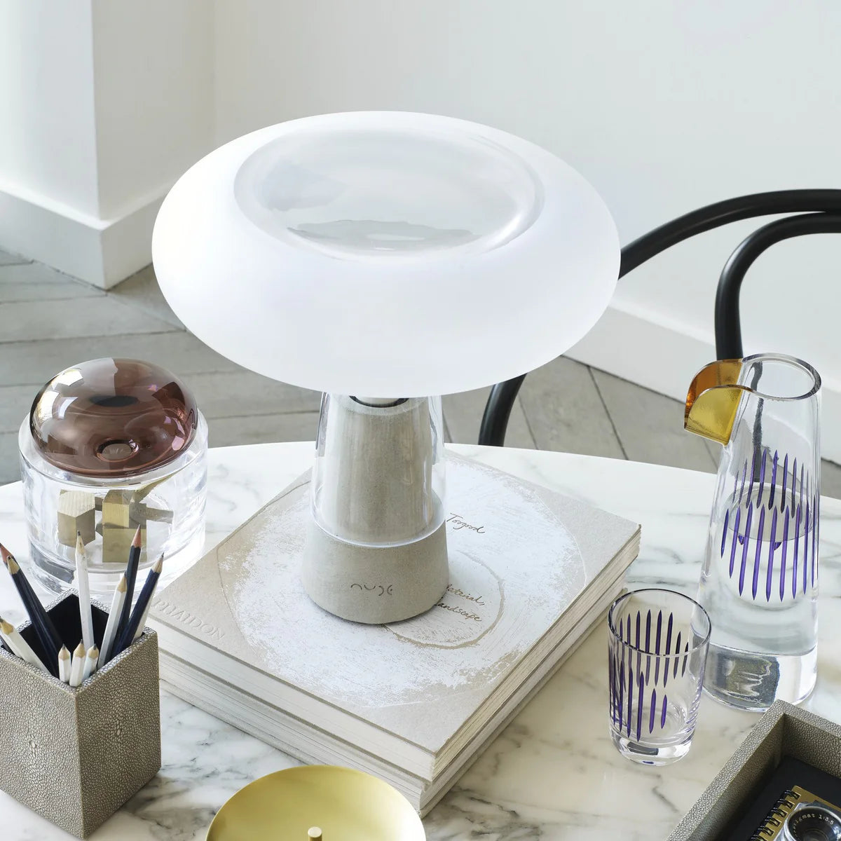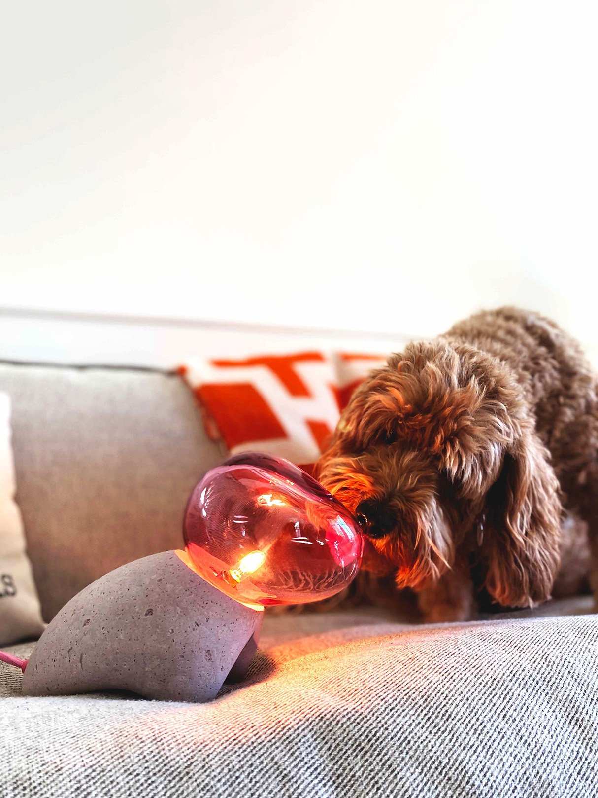 The Dogo table lamp, made of hand carved limestone and hand blown glass, is a charming and playful accent to any room.