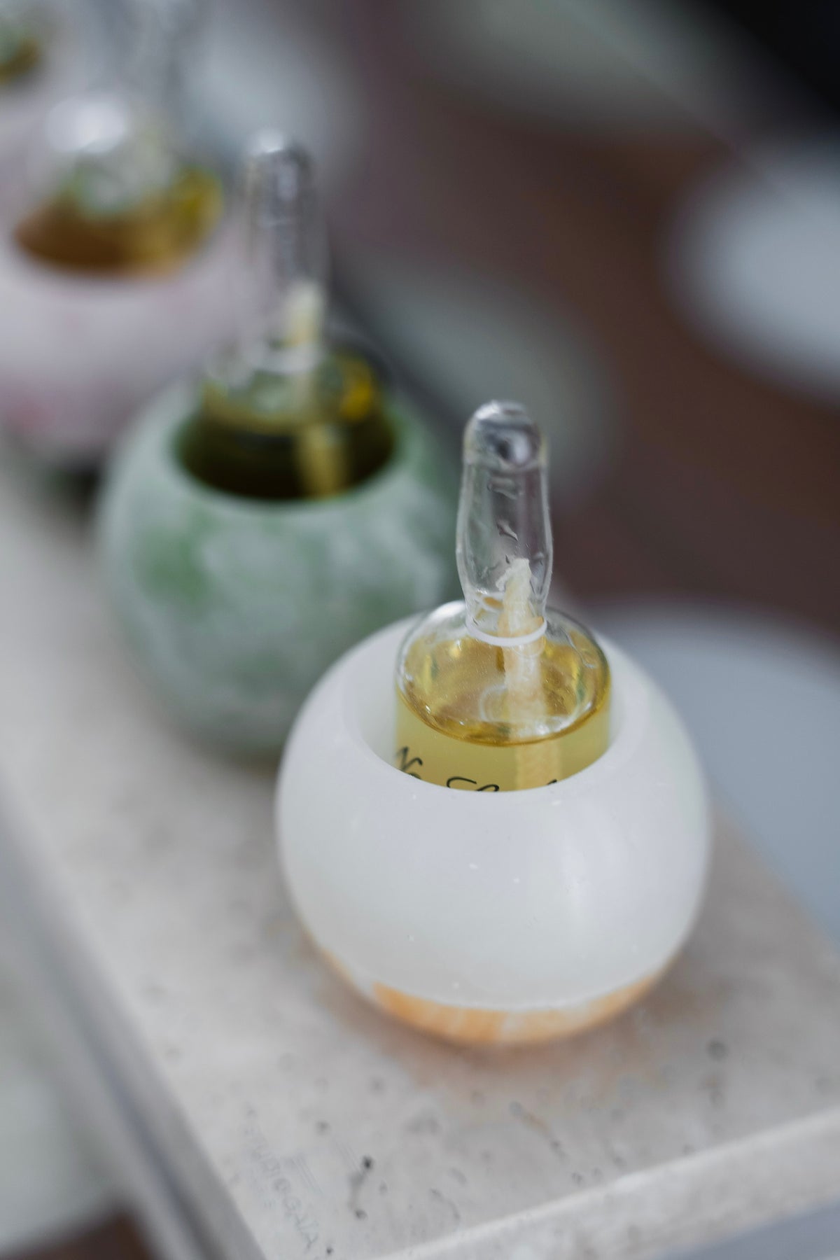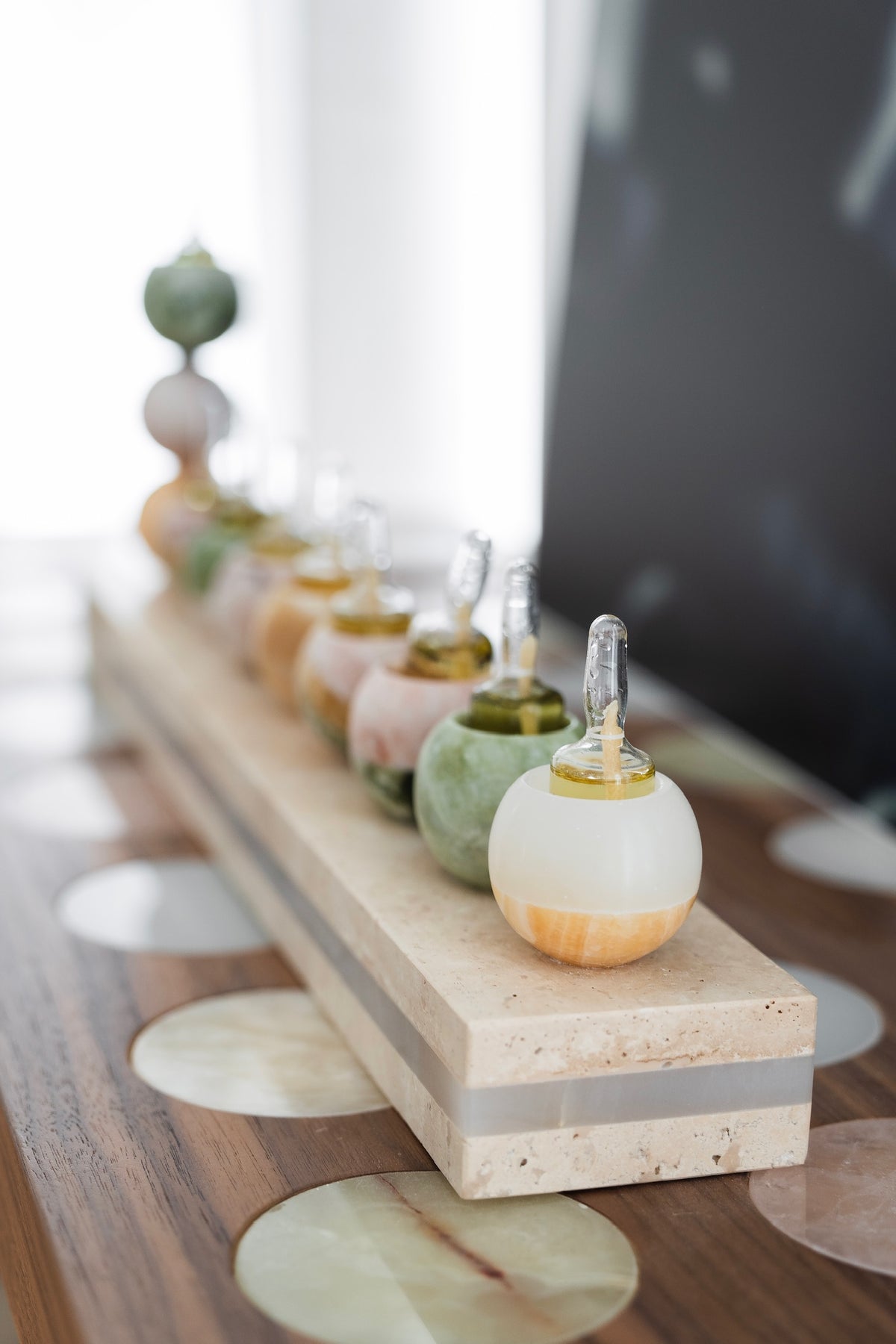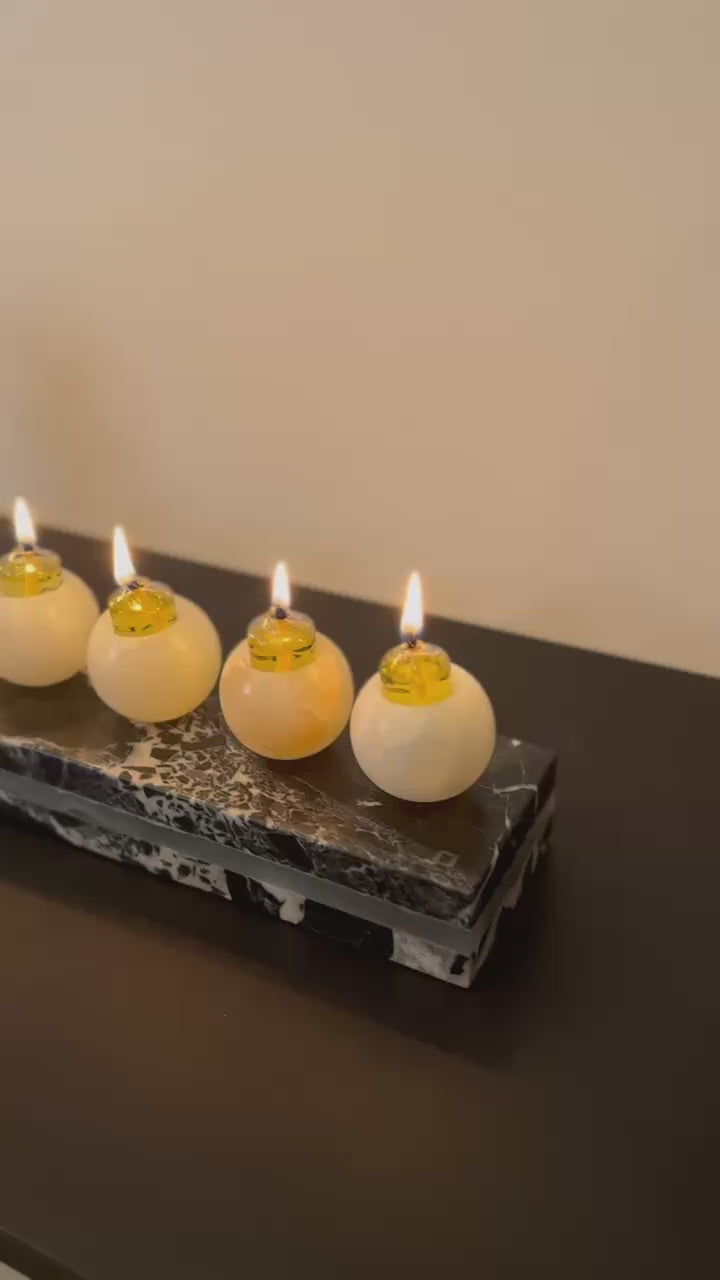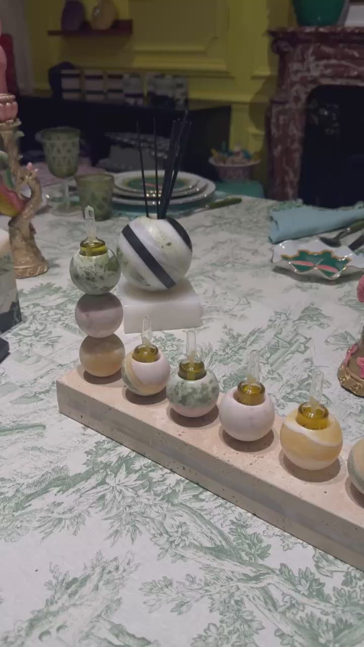 Dimensions: 19.68 x 3.15 x 6.69 inches (50x8x17cm) Materials: Antique marble and white onyx Tray/Base: Antique marble with a white onyx line Candle Holders: White onyx spheres, compatible with oil vials Finish: Polished and matte Unique piece with natural variations in the stones