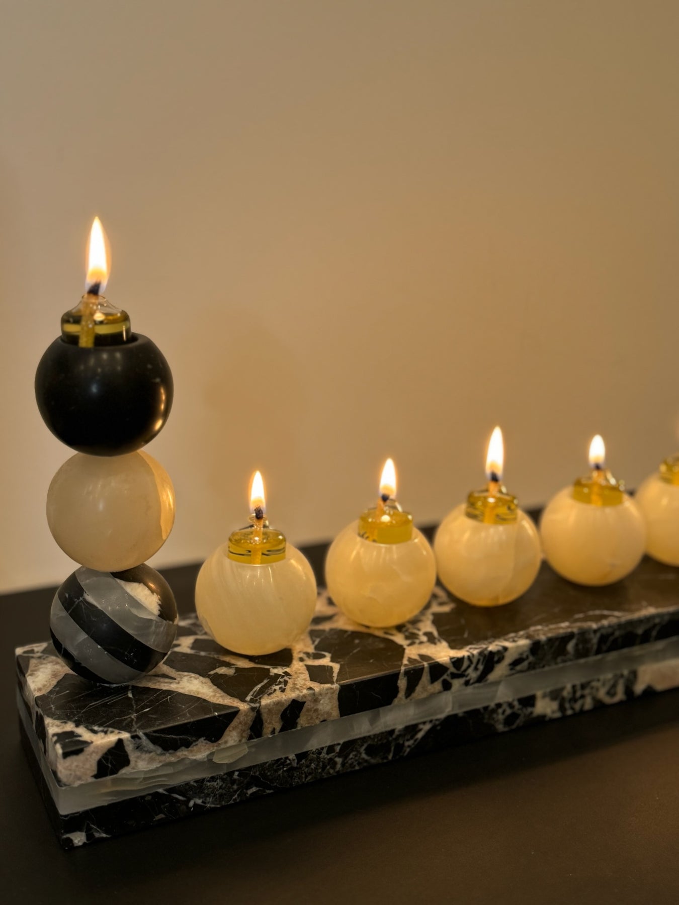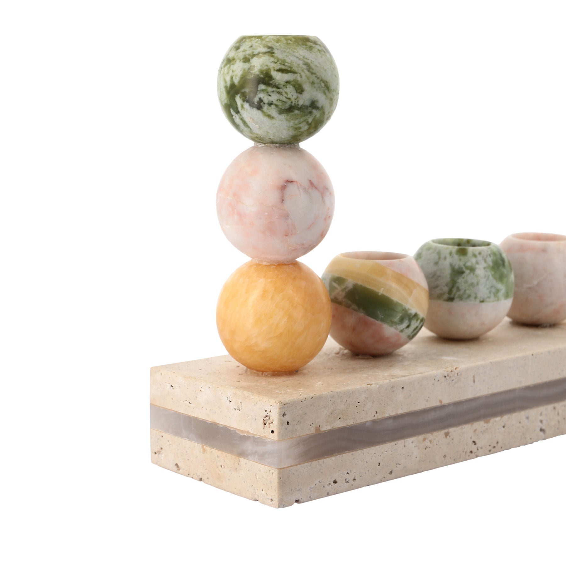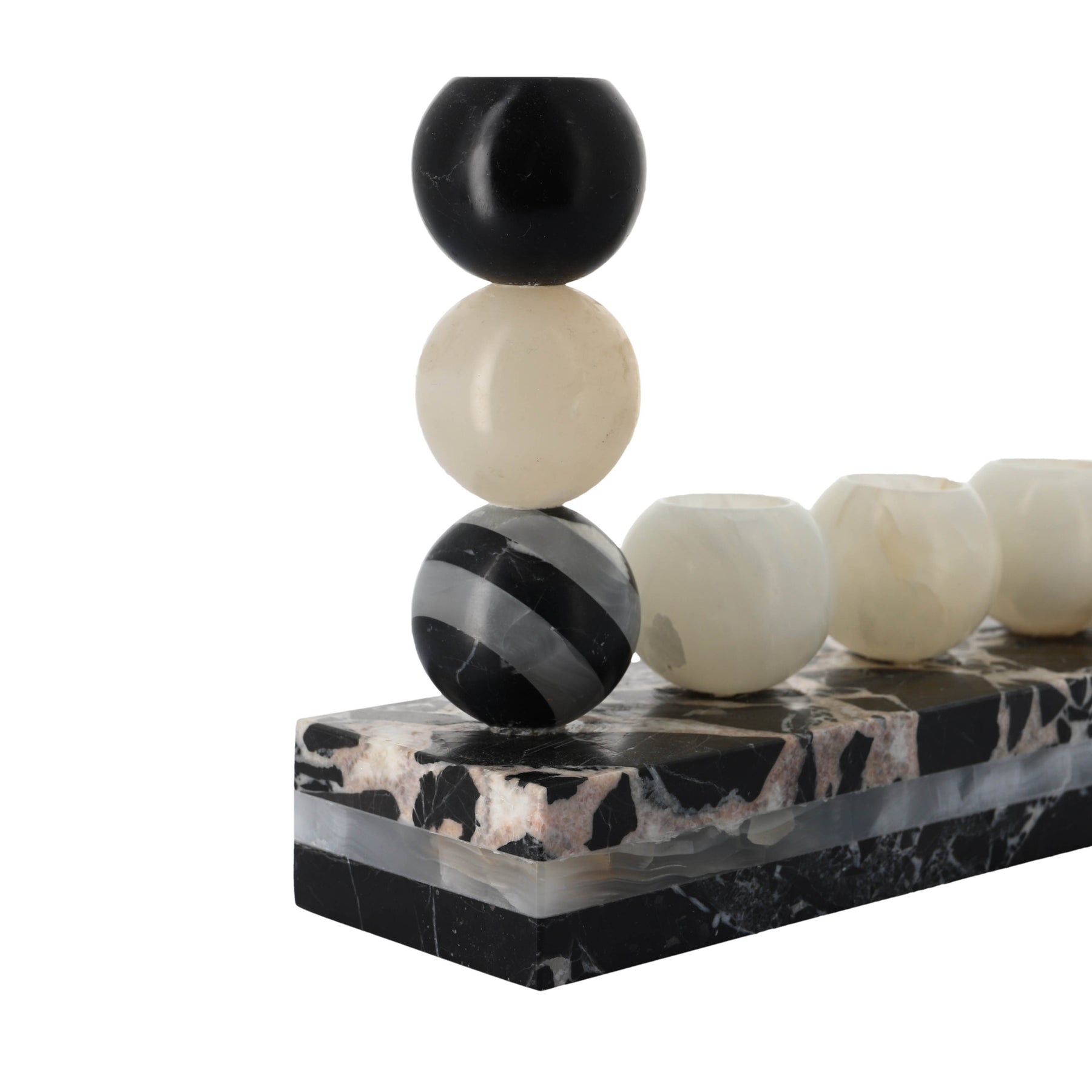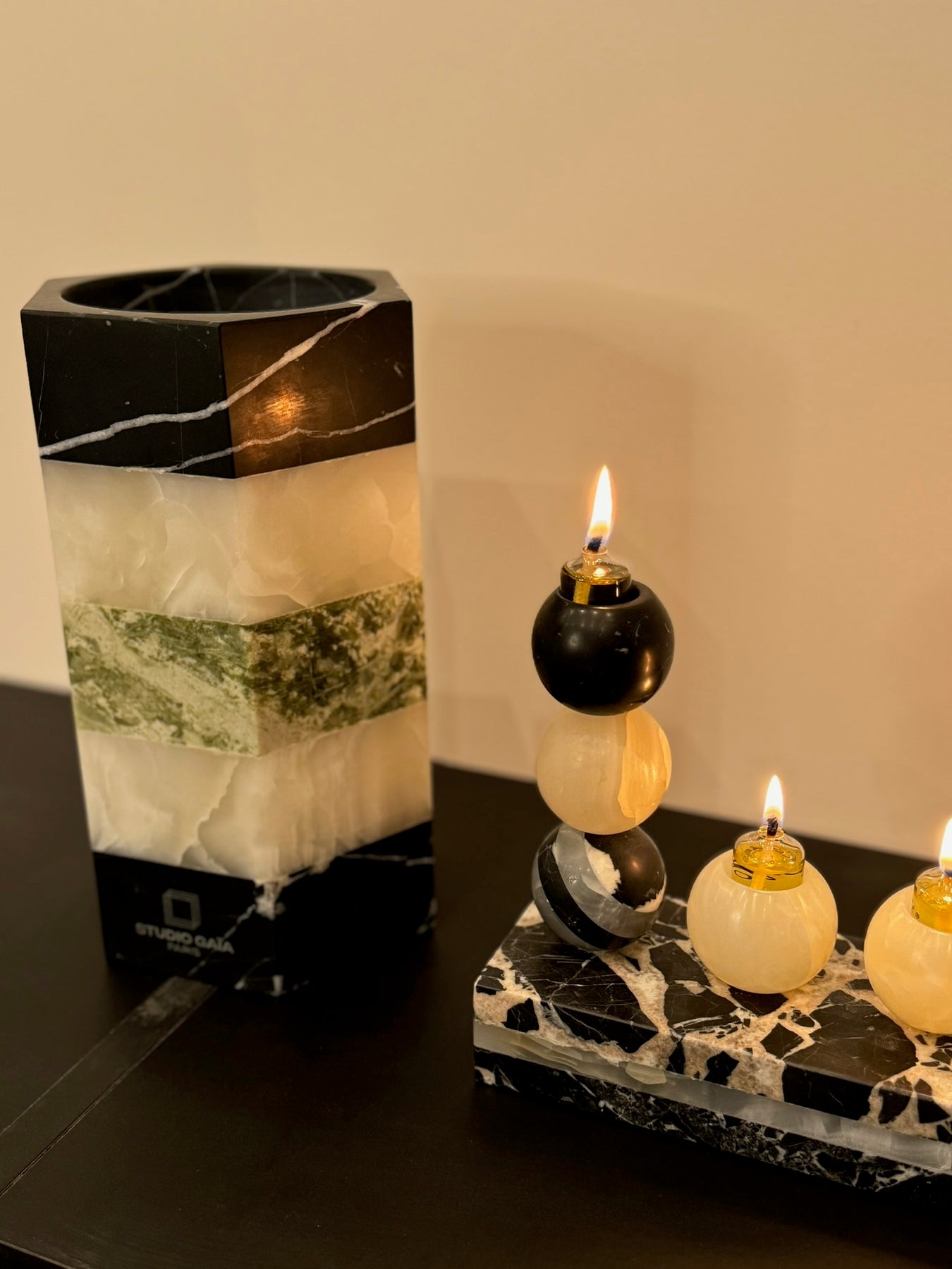 Each candle holder, delicately sculpted in the shape of a sphere, is crafted from white onyx, bringing a touch of purity and elegance to the piece. The base, fashioned from marble with deep veining, is enhanced with a border of white onyx, creating a refined and luminous contrast.