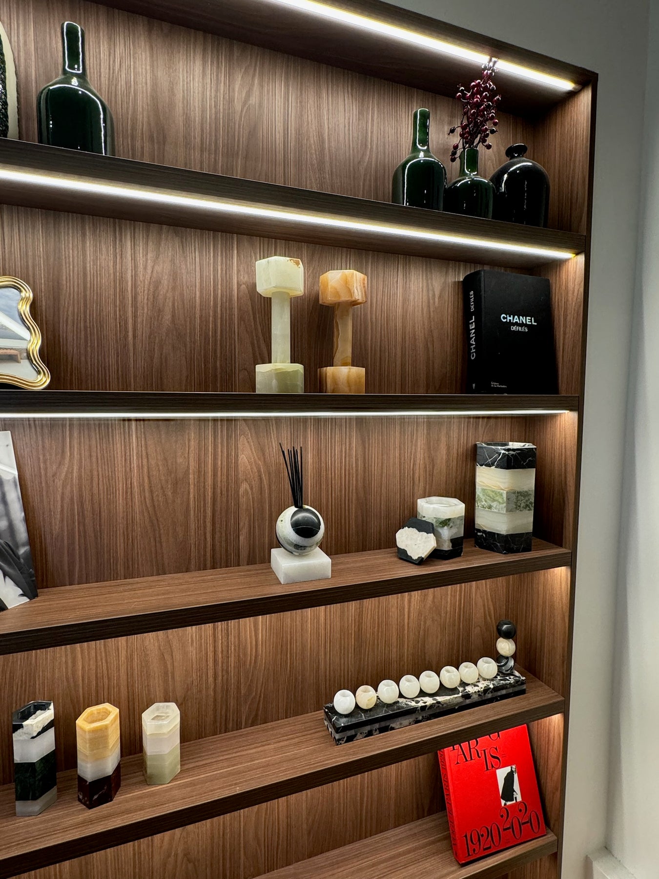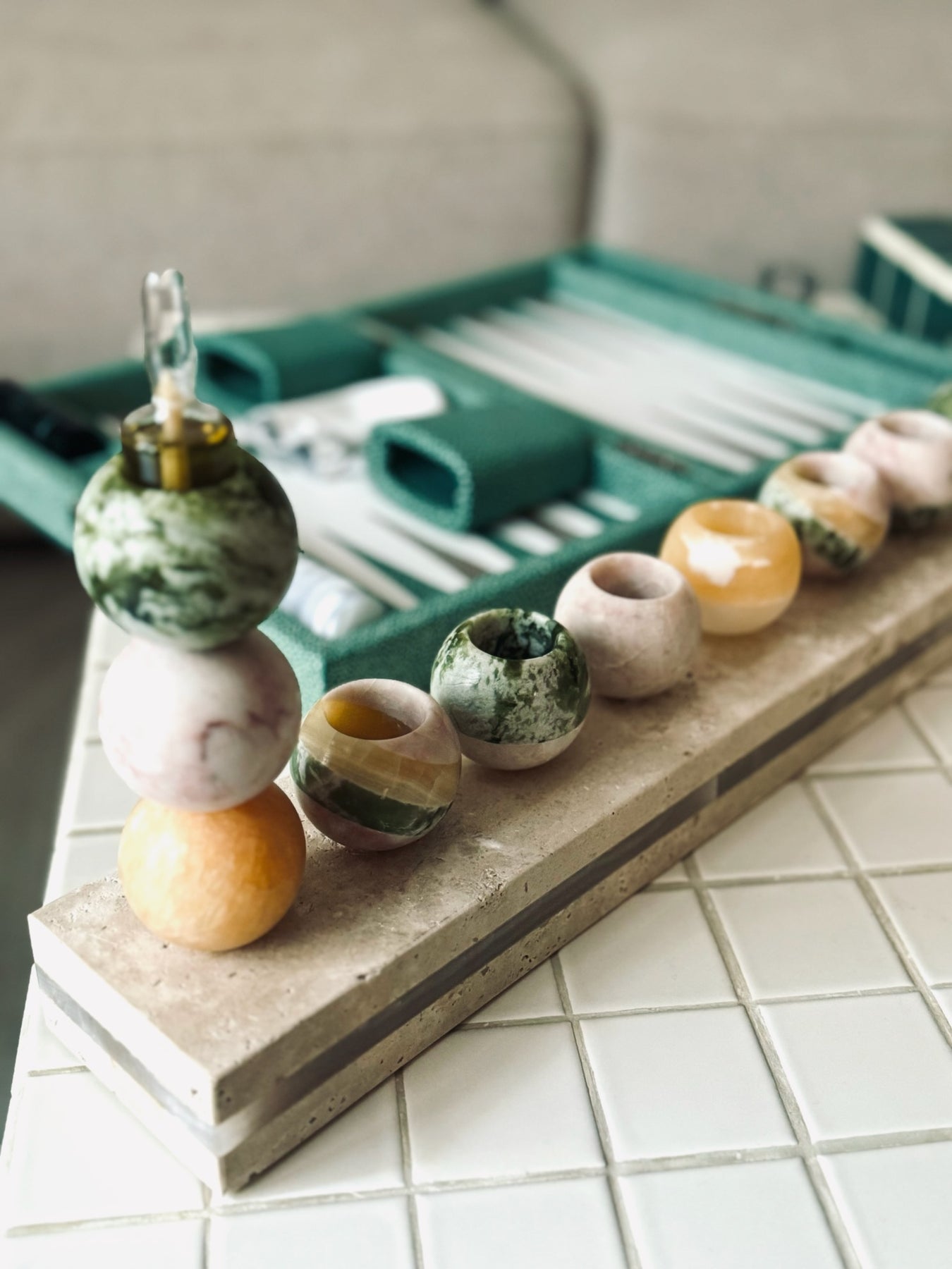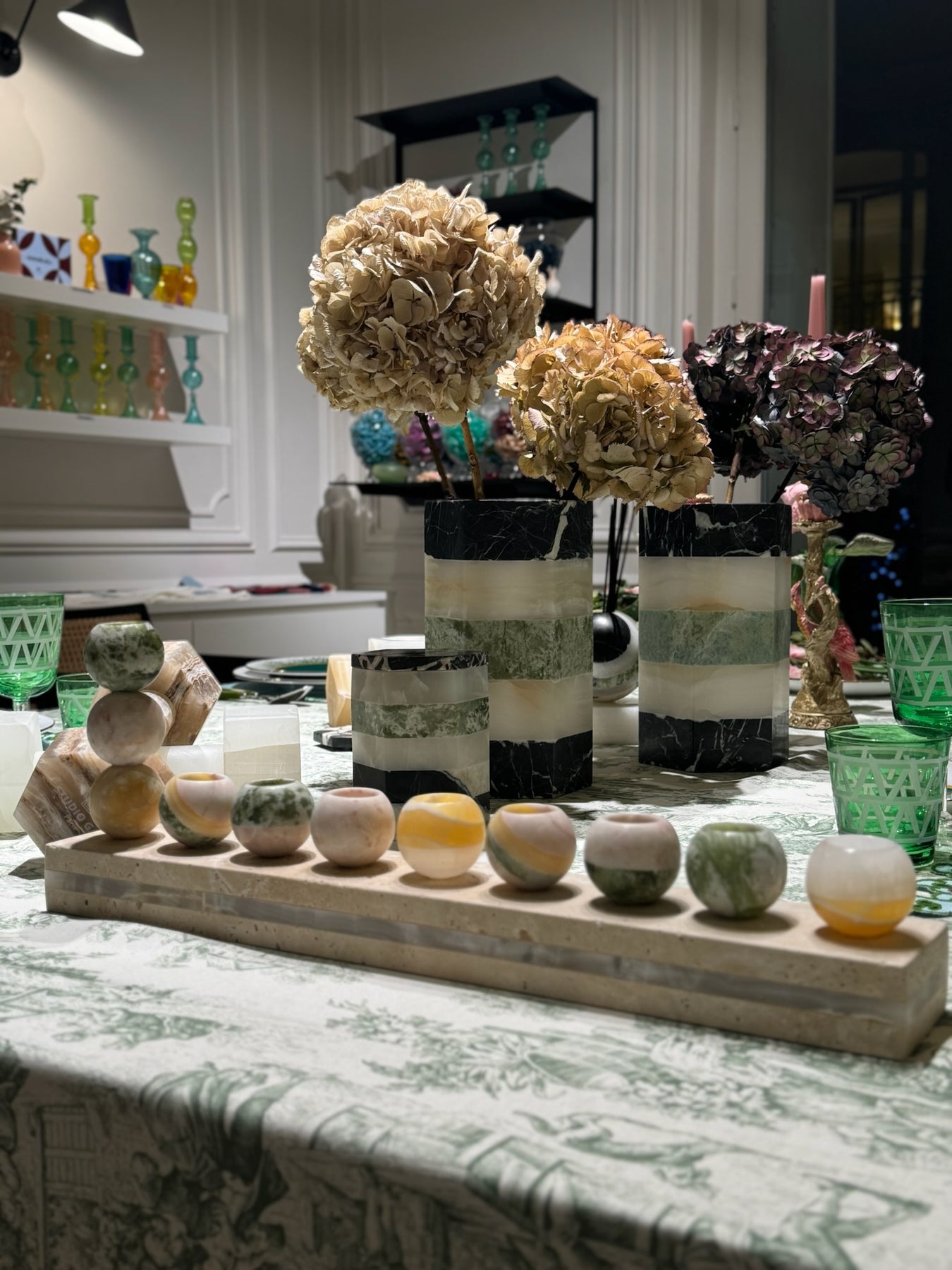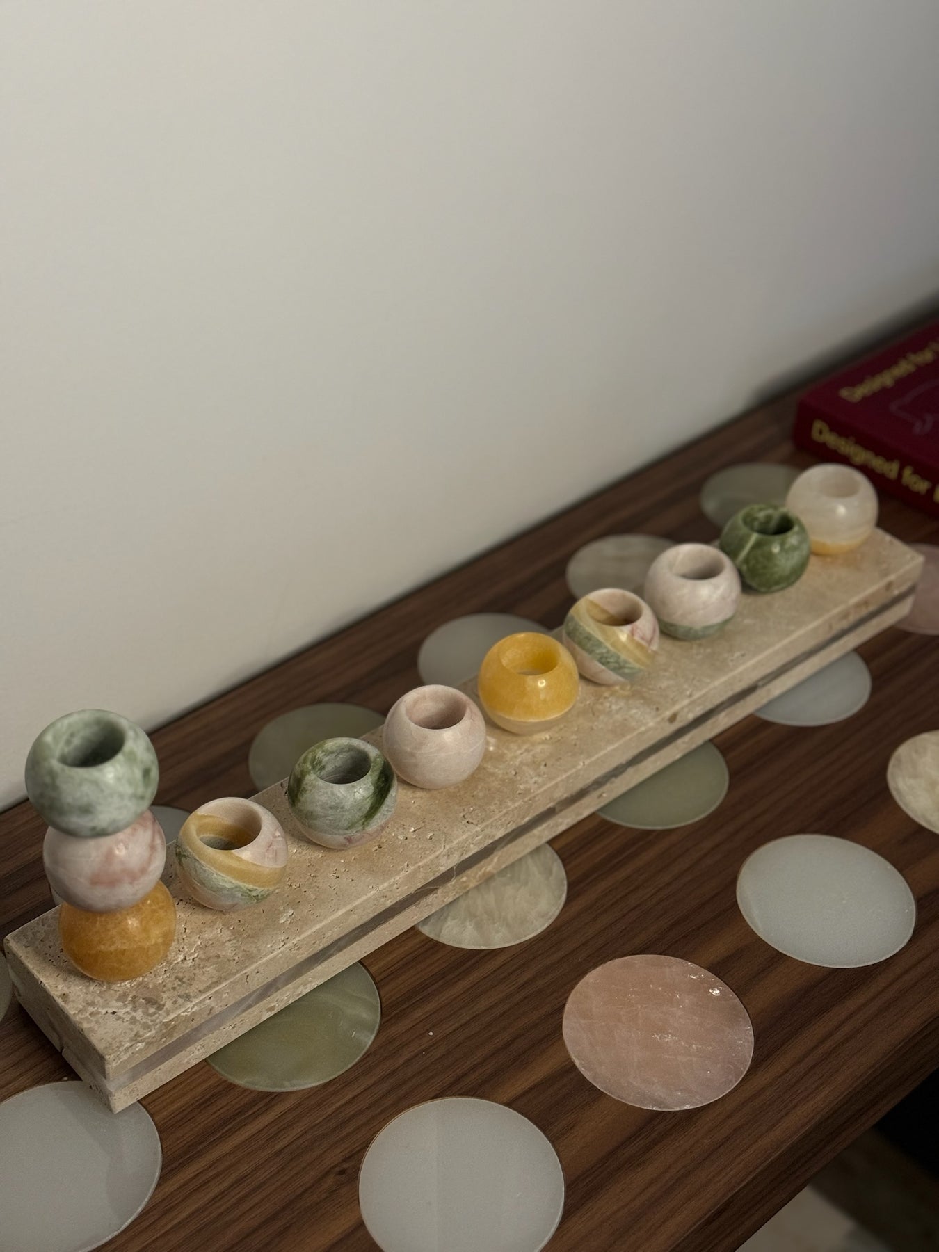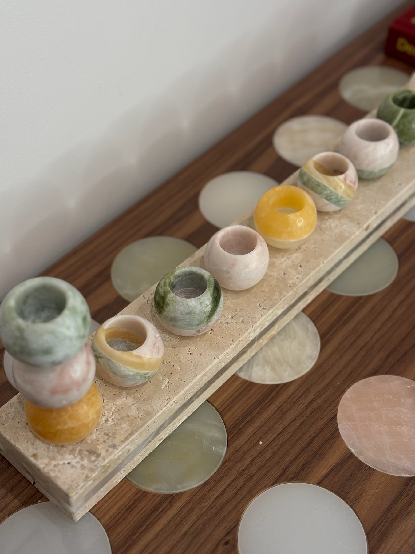 Each candle holder, delicately sculpted in the shape of a sphere, is crafted from white onyx, bringing a touch of purity and elegance to the piece. The base, fashioned from marble with deep veining, is enhanced with a border of white onyx, creating a refined and luminous contrast.
