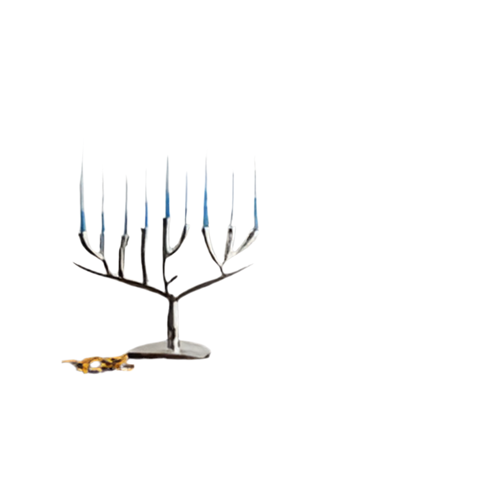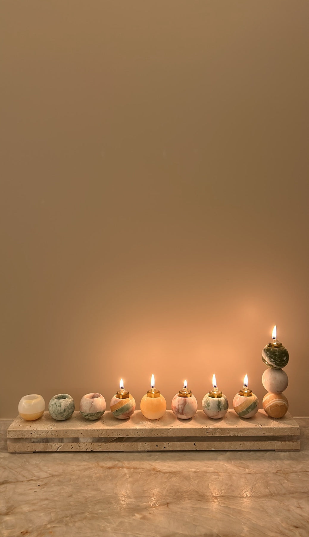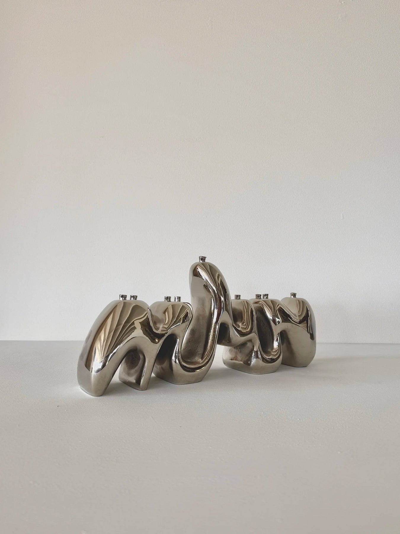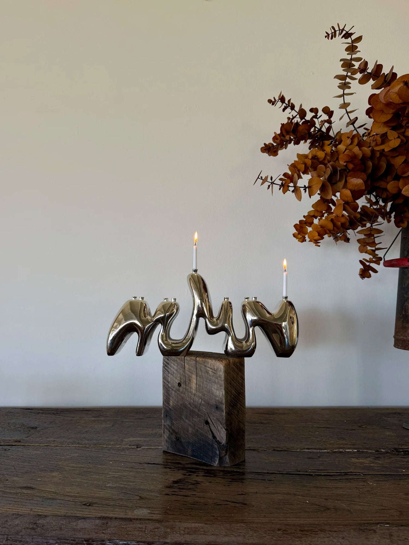 Designed to accommodate oil vials, this Hanukkiah can also be used as a centerpiece on a table, a shelf, or a mantelpiece.