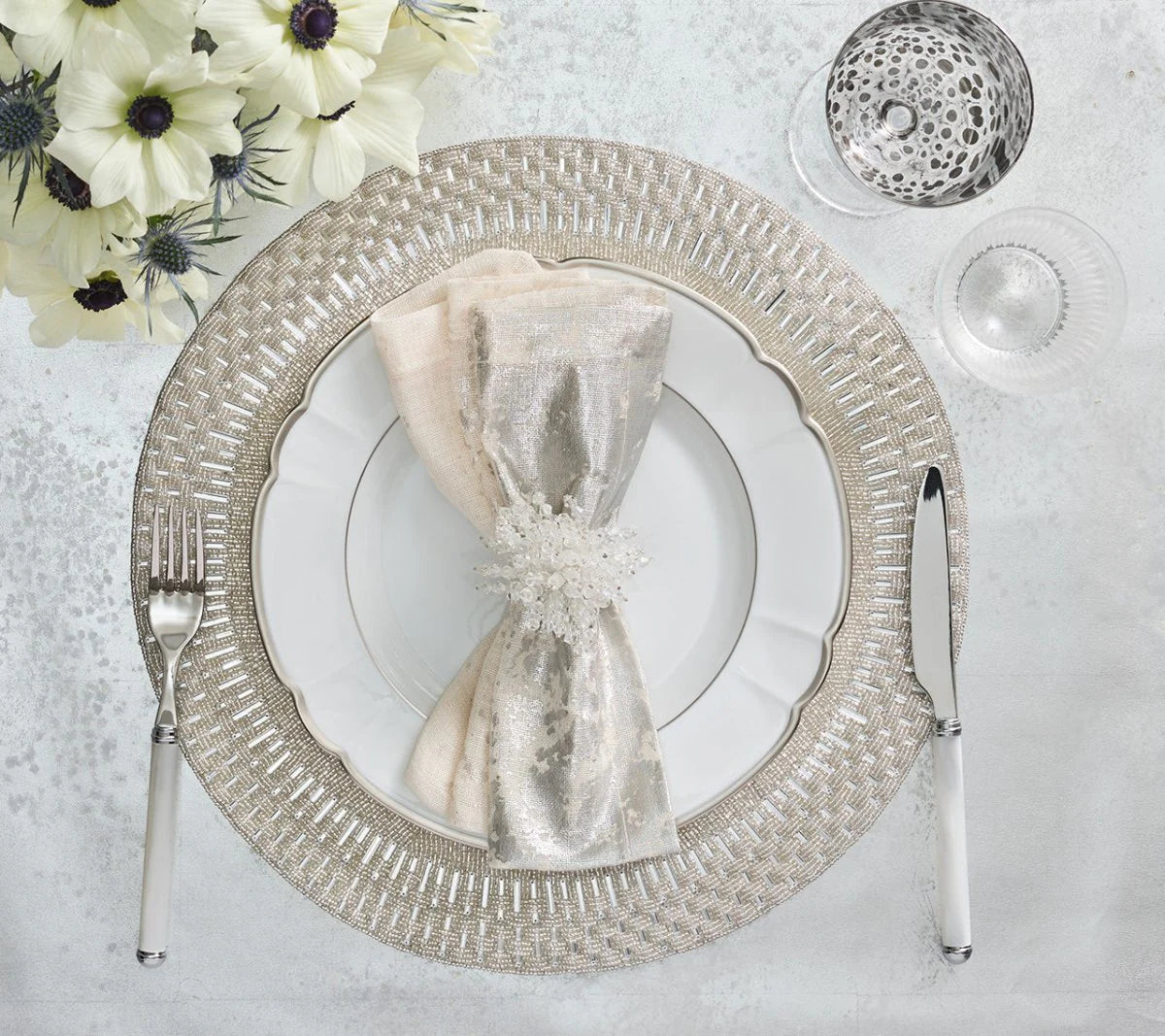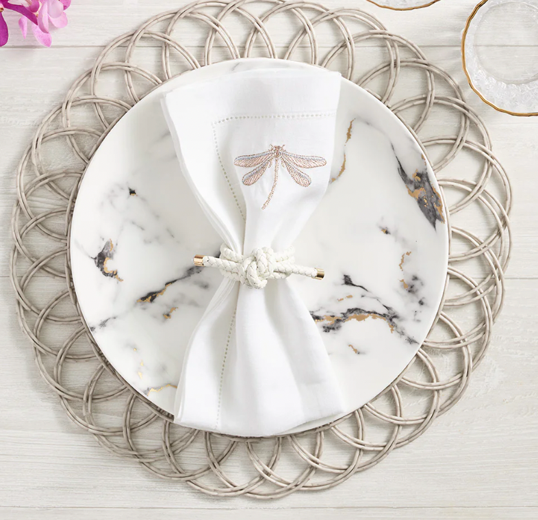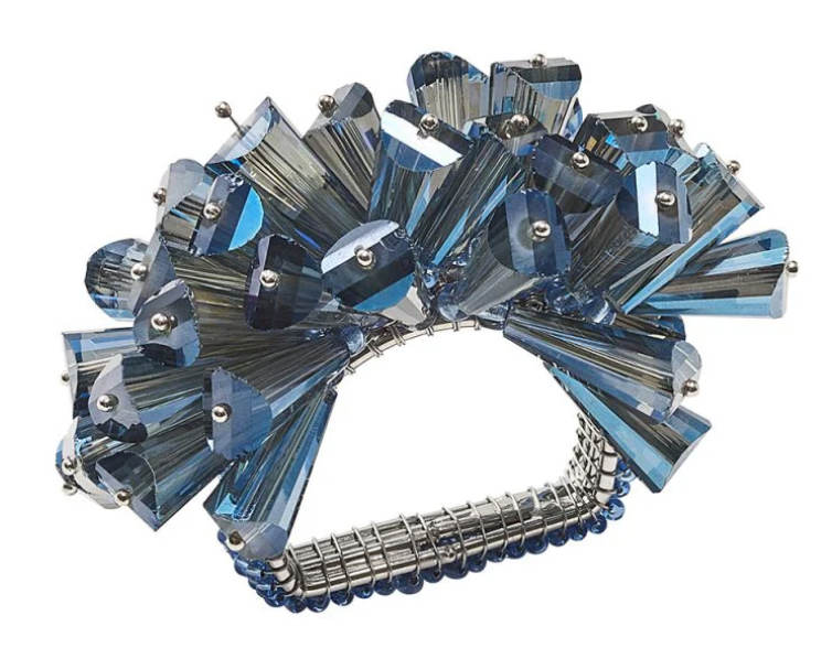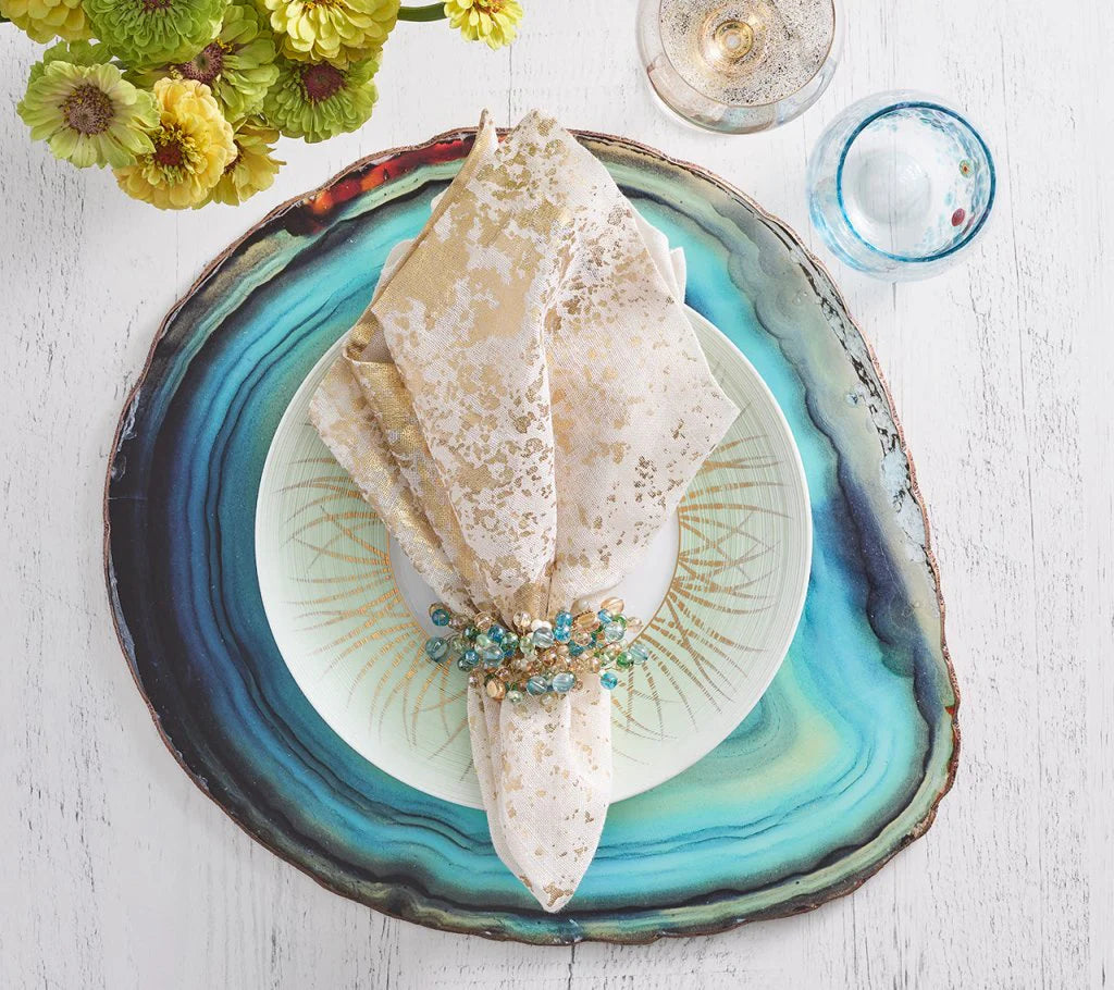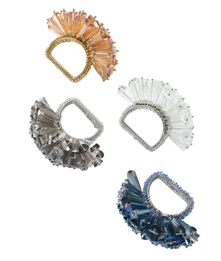 Our collection includes napkin rings made of natural gemstones, including agate, rock crystal, and pyrite. As naturally occurring stones, no two napkin rings will be alike, even within a set of four.