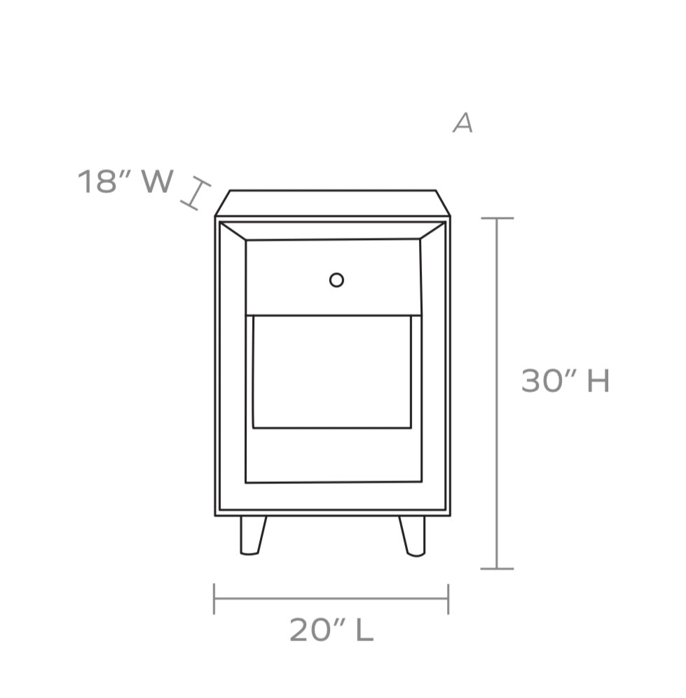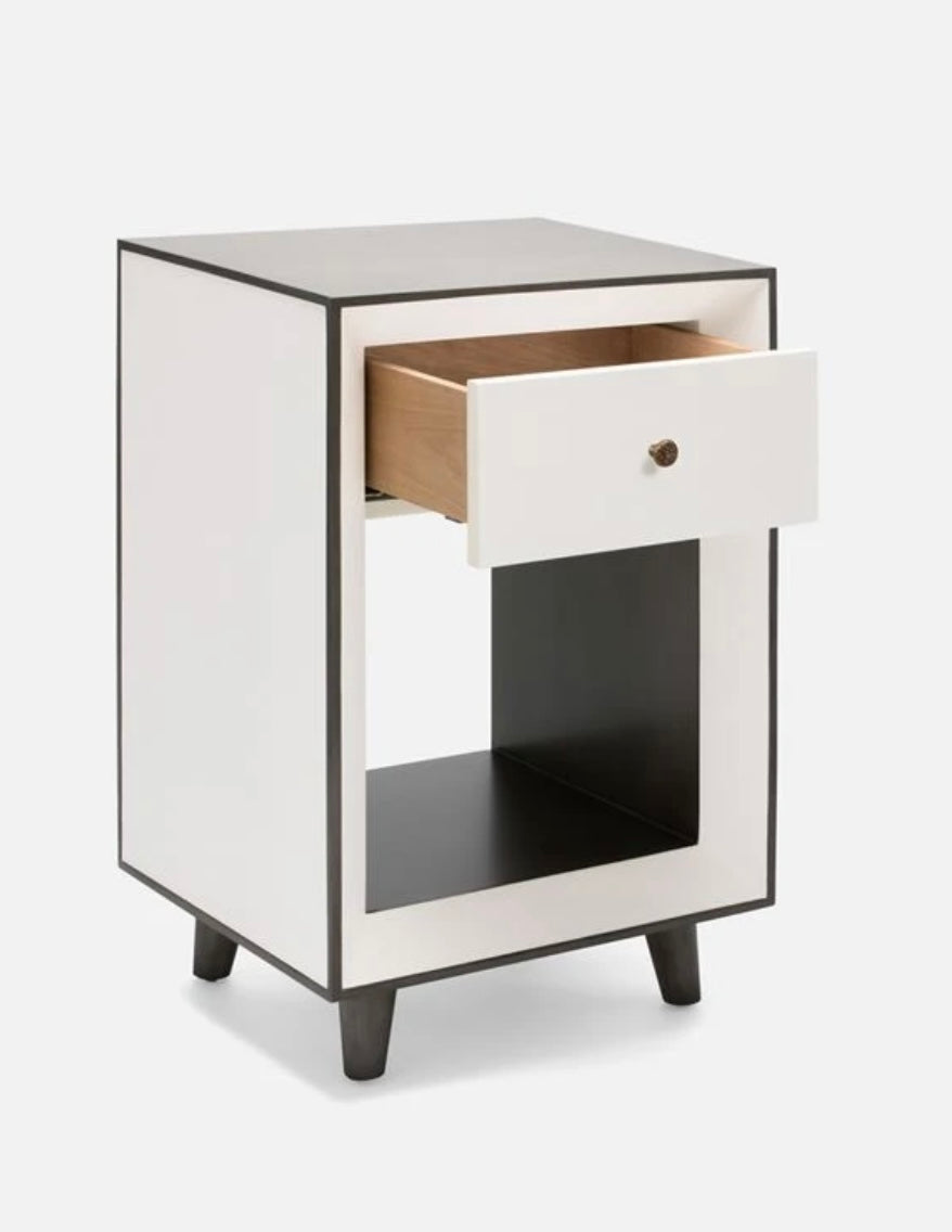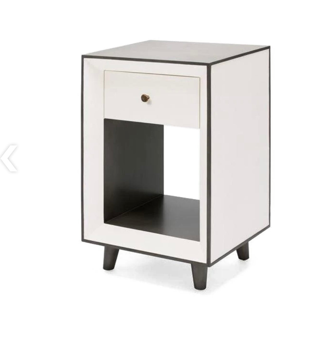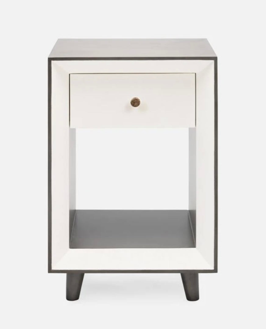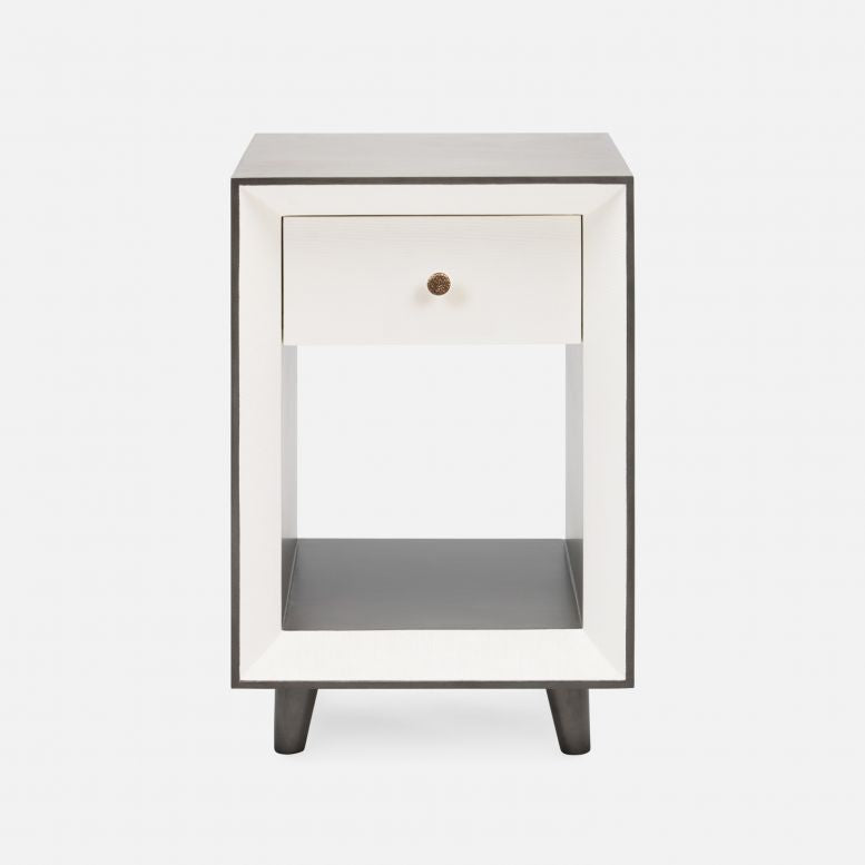 The Made Goods Blaine Single Nightstand in Pristine Faux Canvas showcases a contemporary multi-dimensional frame design in luxurious faux canvas and gray-stained wood. This one drawer side table offers functional storage, in a contemporary shape. *This item is handcrafted and may show a slight variation in size from one piece to another.