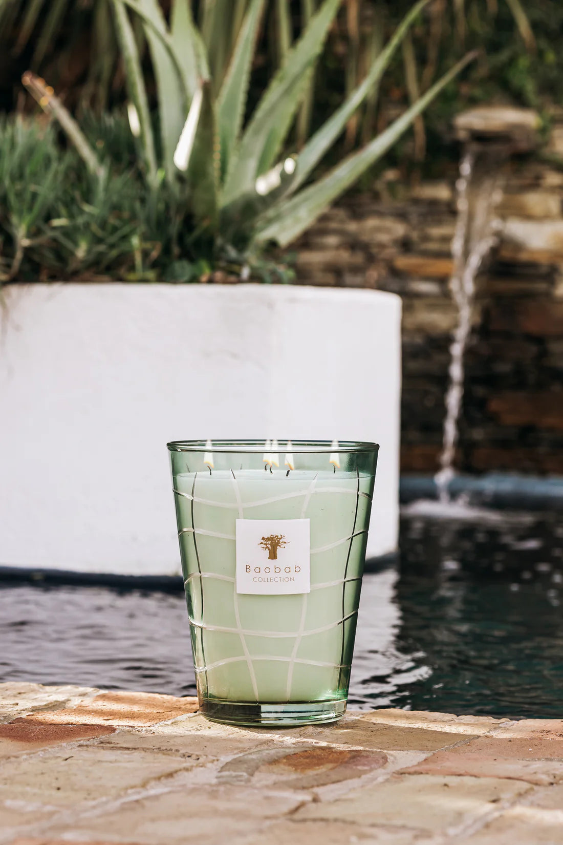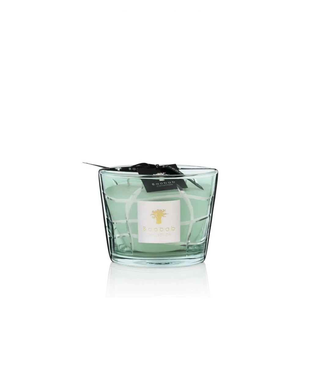The Missoni scented candles with their perfumed wax is contained in a vessel made of fine glass on which colorful ribbons and patterns intertwine on a white background.