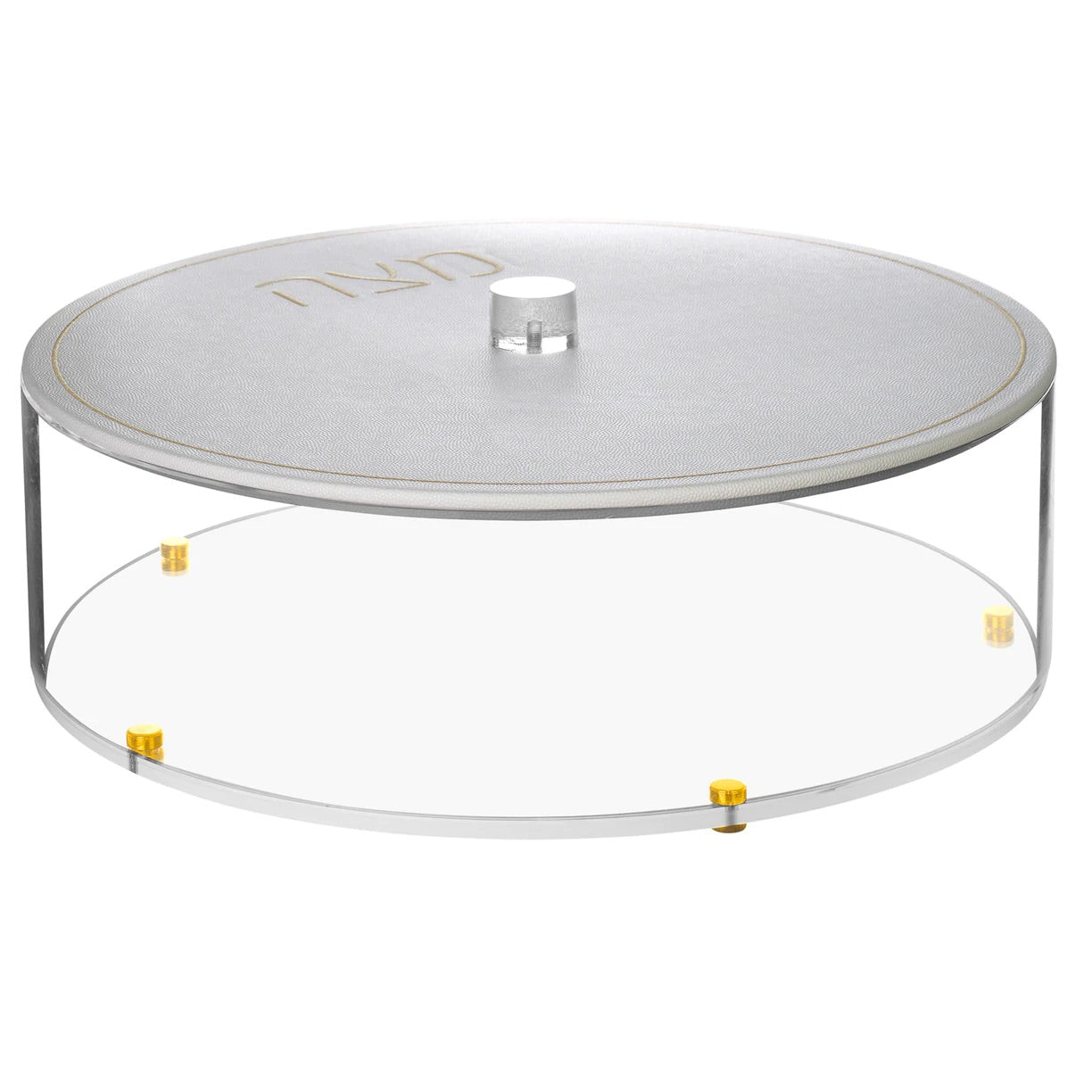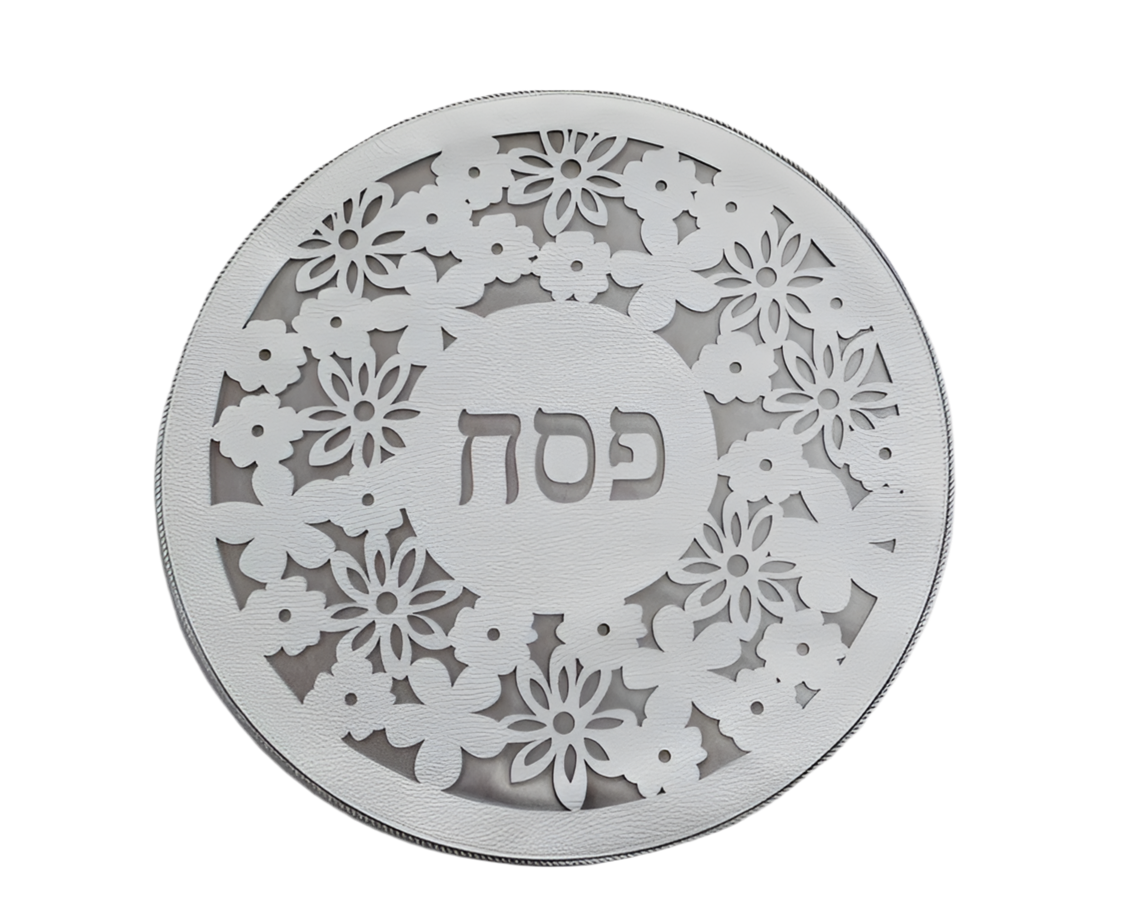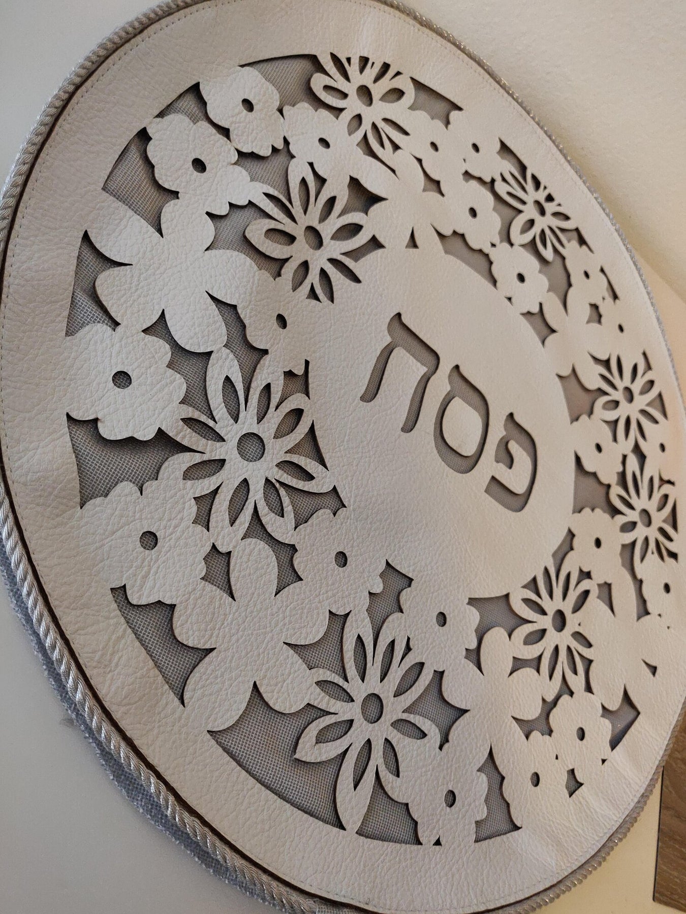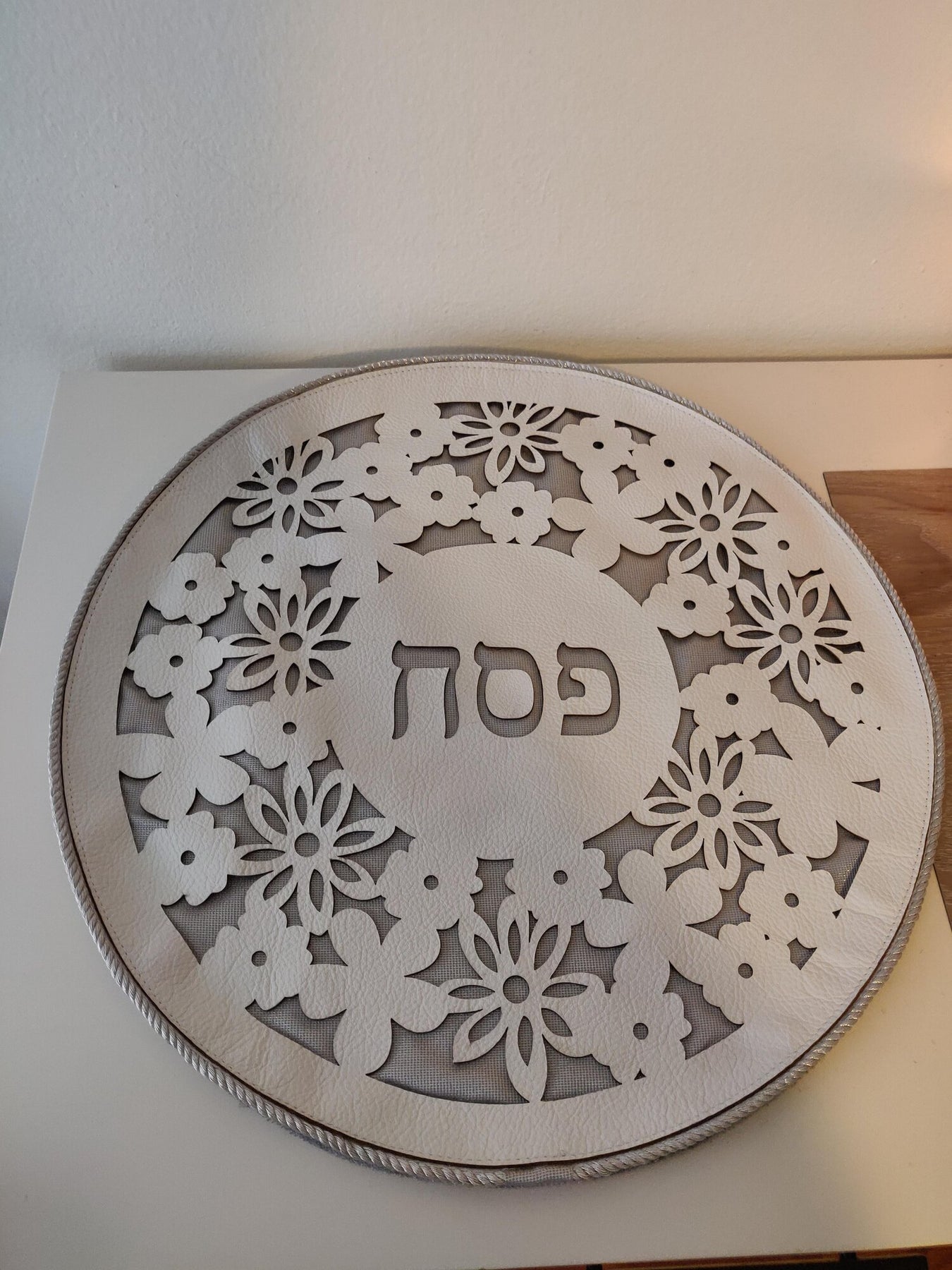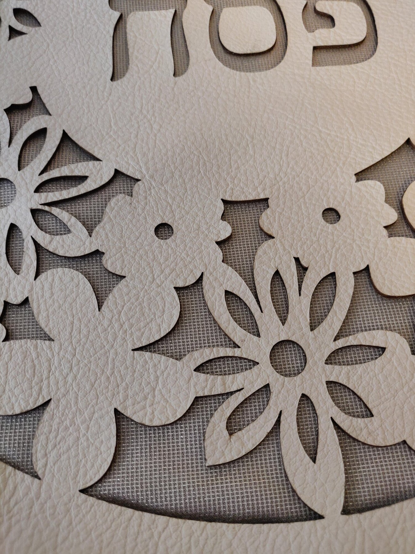For this contemporary bag, we created an elegant look using a laser cut technique to write the hebrew words in a modern font "Pesach", "Matzah" and "Maror" repeated all across the lid of the bag, to have the three most important words that need to be discussed in Passover present at the table.