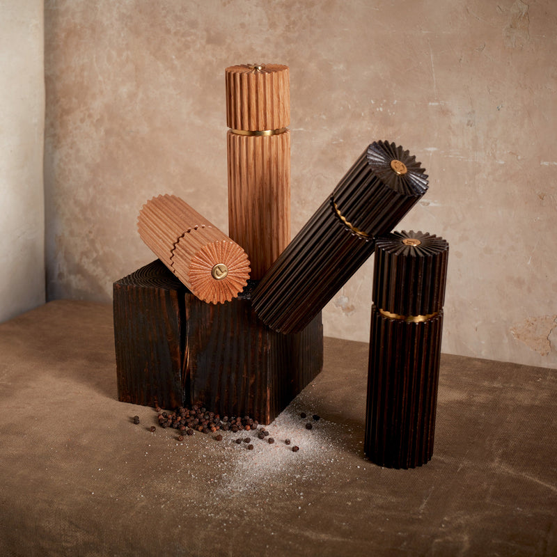 Complement to the Ionic porcelain objects, these salt and pepper mills are hand carved in natural European oak and smoked oak, adorned with handsome brass details, and expertly outfitted with a high-quality metal grinding mechanism.