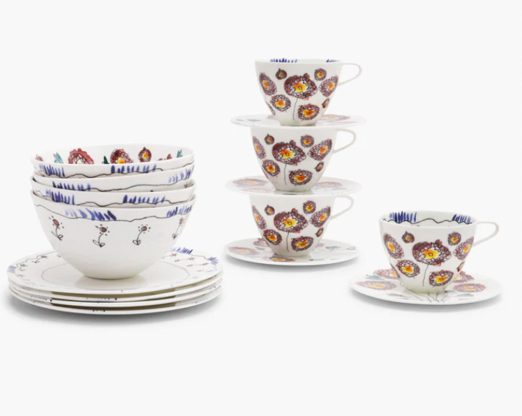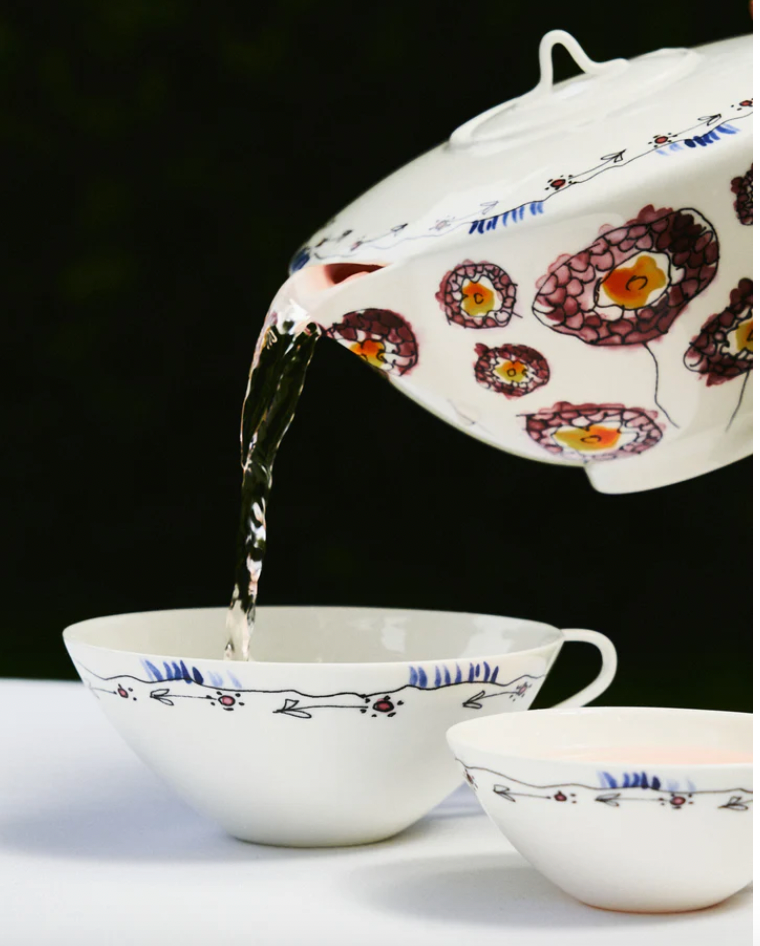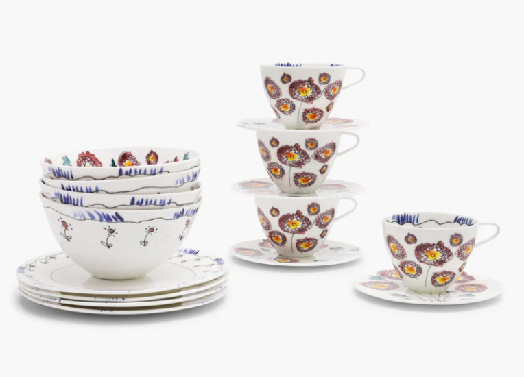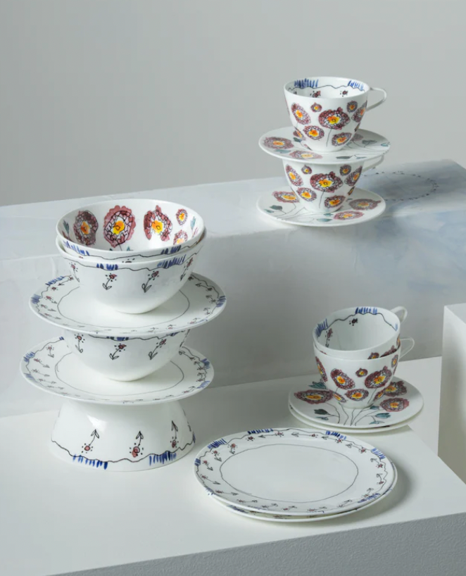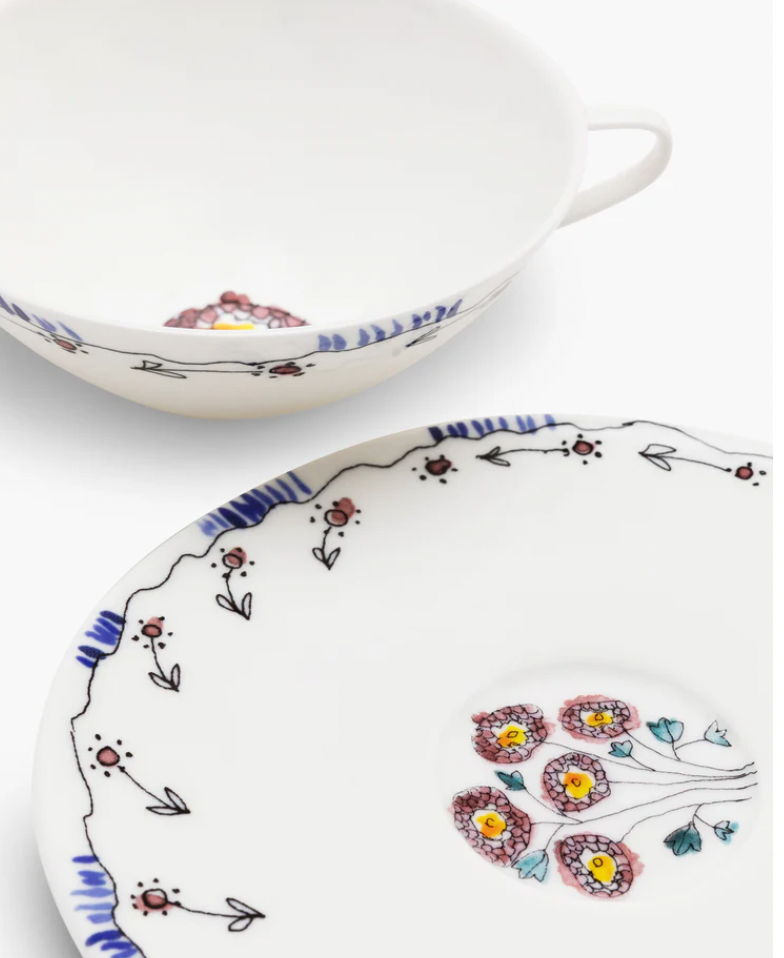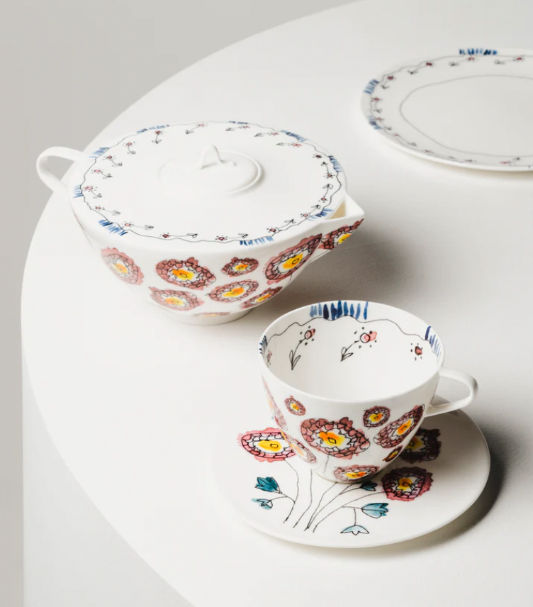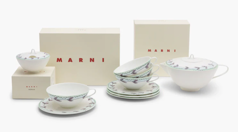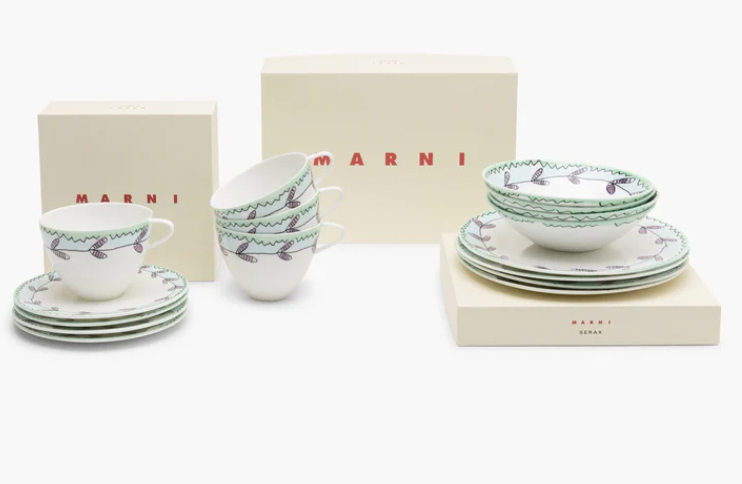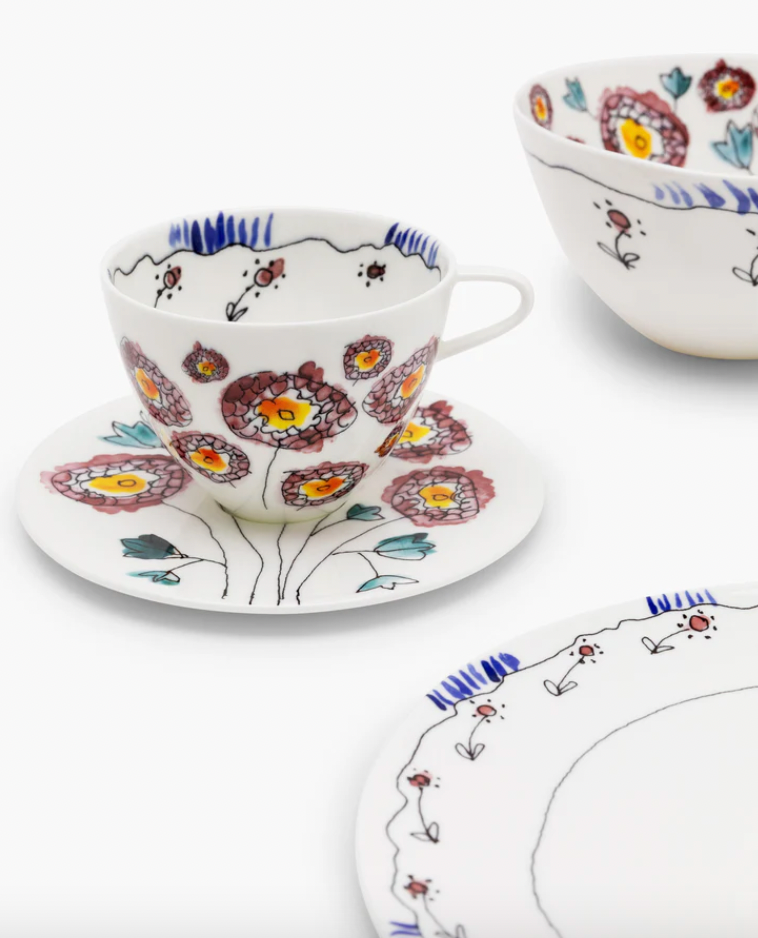 Serax and Marni created an elegant, 120-piece porcelain tableware set, which celebrates the Italian fashion house’s artistic vision. Marni’s Creative Director Francesco Risso designed the flower motif, which was inspired by nature. Decals are used to apply the pattern to the fine bone china, after which it is glazed, to make it more wear resistant. The slightly asymmetrical shapes of the plates, bowls, cups, saucers, and tea pots only serve to accentuate the hand-finished porcelain’s quality.