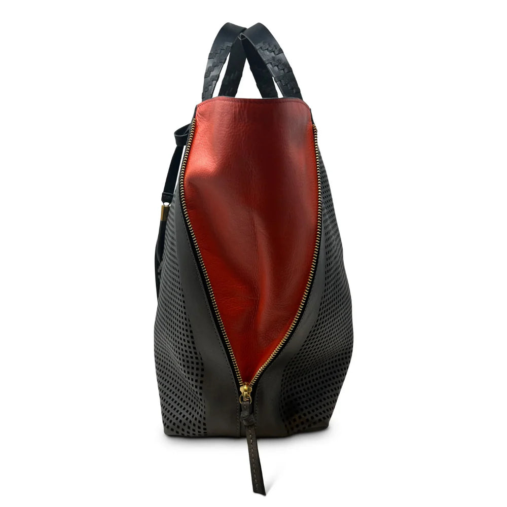 Want to turn heads? Simply unzip the sides to reveal bold, tiger lily–orange leather flaps that are impossible to miss. Add in the striking black-and-white Polo-inspired crossbody strap and our signature hand-carved toggle, and you have a tote that doesn’t just carry—it captivates.