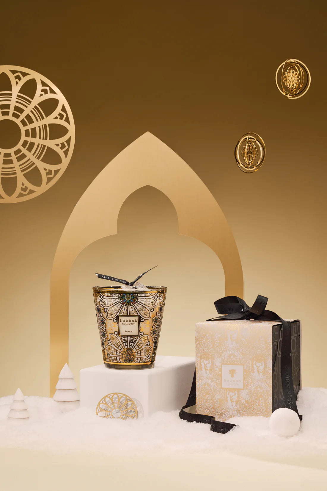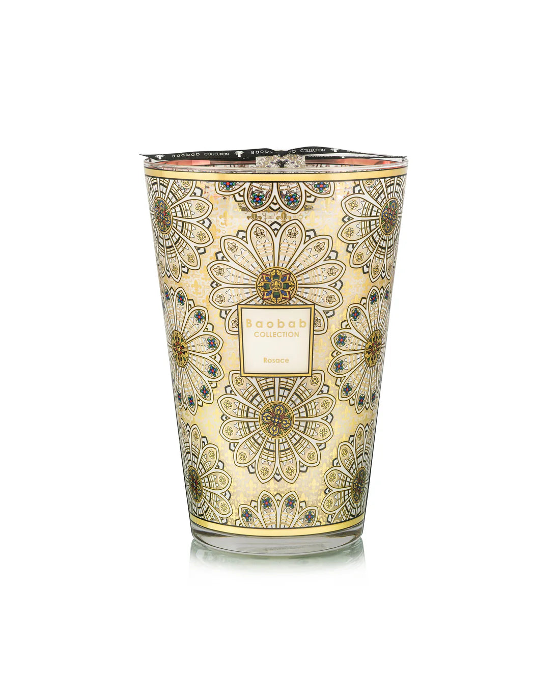 The Rosace candle pays tribute to Gothic architecture and the spiritual light of cathedrals. Its glass is covered with a precious silk-screen print, where gold and subtle colors draw motifs inspired by medieval rose windows. Like luminous lace, this refined décor is set against a background of fleur-de-lis, an emblem of nobility and purity.