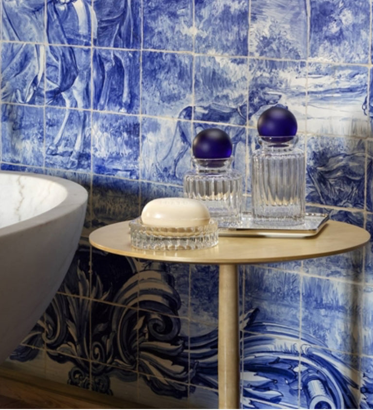 Avenue is inspired by the glamorous aesthetic of Hollywood in the 30s. The flask evokes the male suits of the time, baggy and square-cut. The cutting, simple and sophisticated, is inspired by the furniture that we know from so many American films. The base in porcelain Vista Alegre completes the vintage and refined character of the set.
