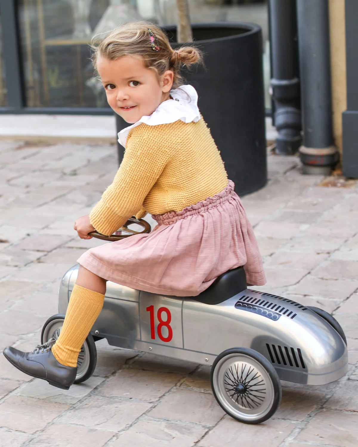 A tapered line, an aerodynamic design, this new ride-on is all metal and very robust. Long wheels for great stability. Well installed on their roadsters, hands on the wheel, feet on the ground, the little ones will quickly become aces at the wheel.