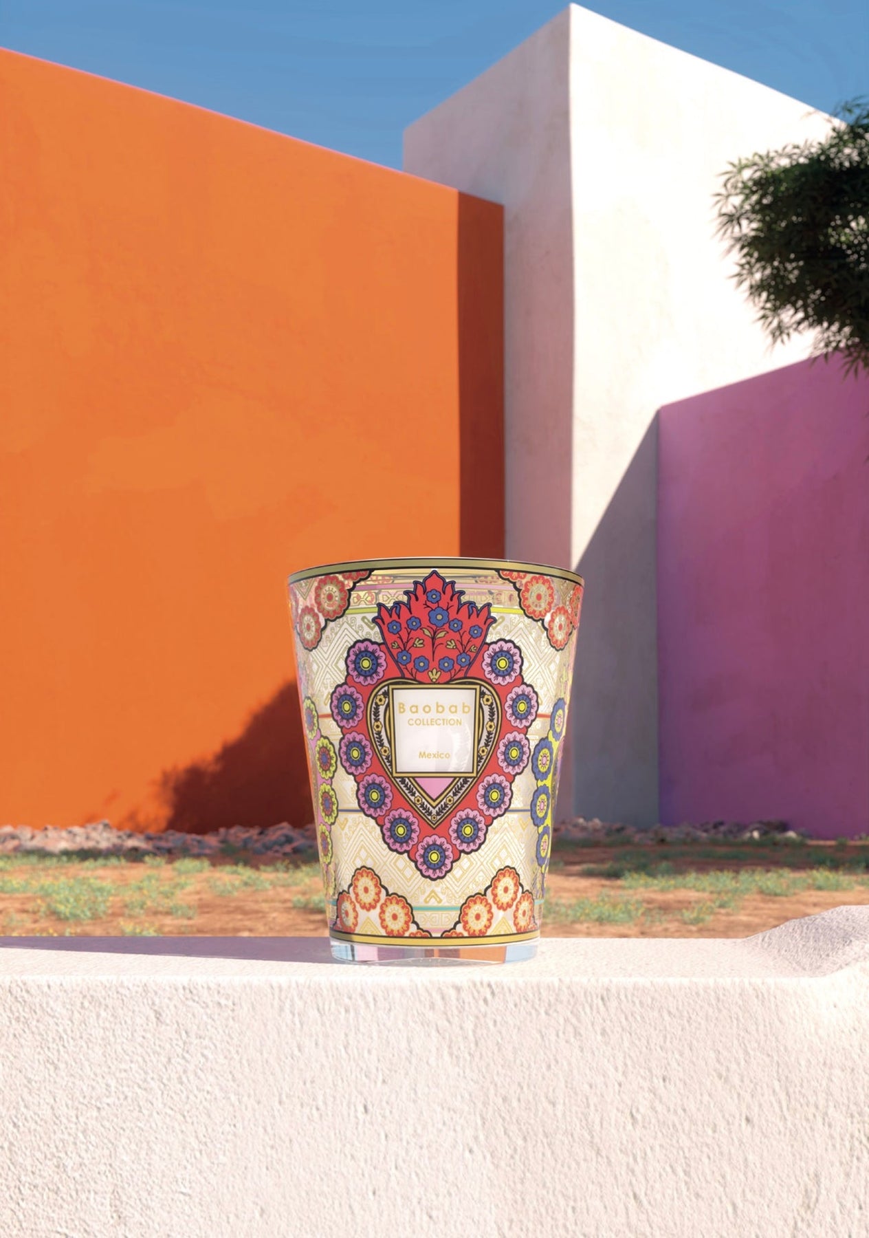 The glass of the Mexico City scented candle is covered in a gold and colorful silk- screen print representing a heart ex-voto, a small object that was spiritually used to address a wish or to thank for the grace that one is granted. These heart motifs are placed around the glass with, at the bottom, a subtle embroidery motif that is found in Mexican crafts and on Frida Kalho’s corsages.