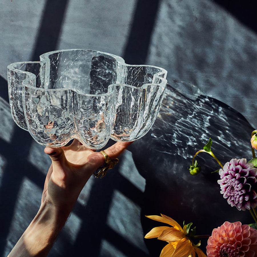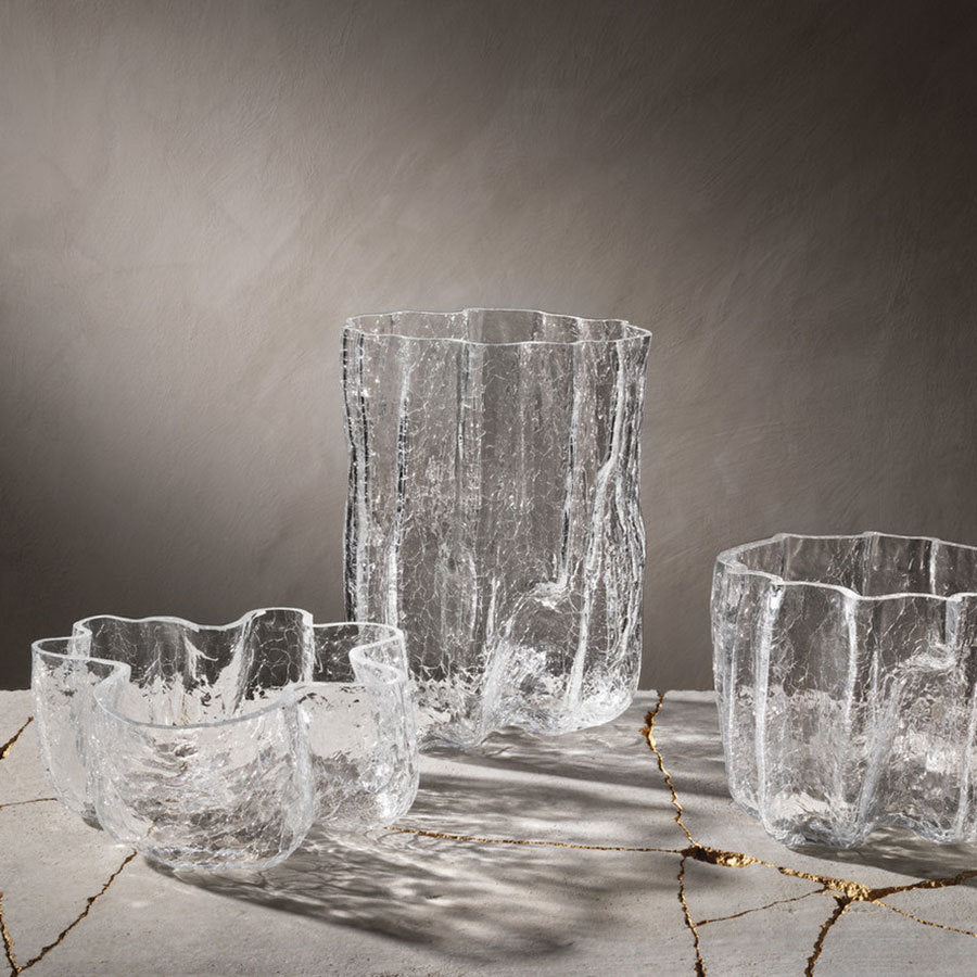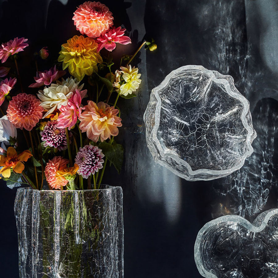 Crackle and thunder – a magical wonder! At Kosta Boda, we marvel at beautifully preserved cracks in glass. The clear glass bowl from the Crackle collection has an expressive, sculptural exterior created using an old handicraft technique where the hot glass is dipped in ice-cold water. The crackled surface reflects daylight and reveals its stories of fire, earth, and water. Design by Åsa Jungnelius.