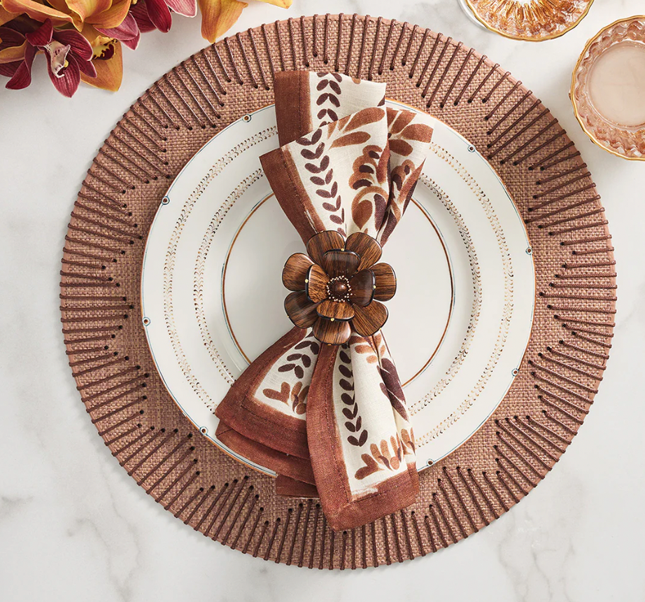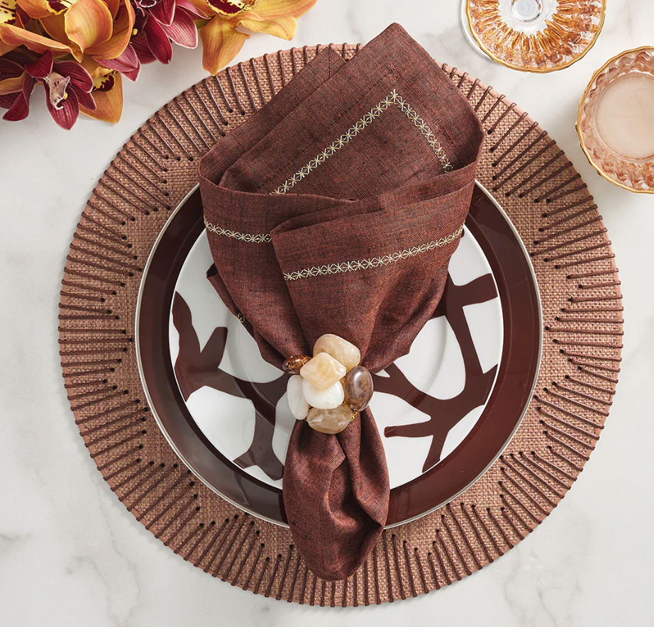 The Dreamweaver Placemat is a must-have favorite, offered in new fashionable colorways. These versatile, warm brown shades blend classic refinement with a carefree sophistication that speaks to any style. The best-selling design has become a Kim Seybert icon.