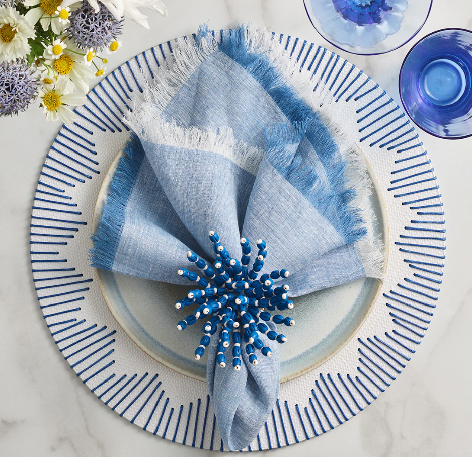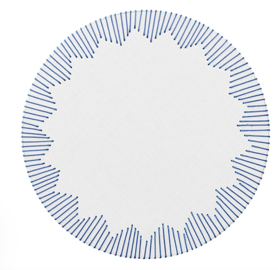 The round Dreamweaver placemat features exquisite cord stitching in blue, elegantly contrasting the white base. The stitching forms a unique chevron-like border. This faux-woven placemat lends a nautical vibe to your dining table, making it the perfect choice for summer parties. Pair it with red accents for Memorial Day and Fourth of July festivities.