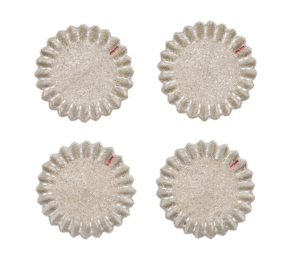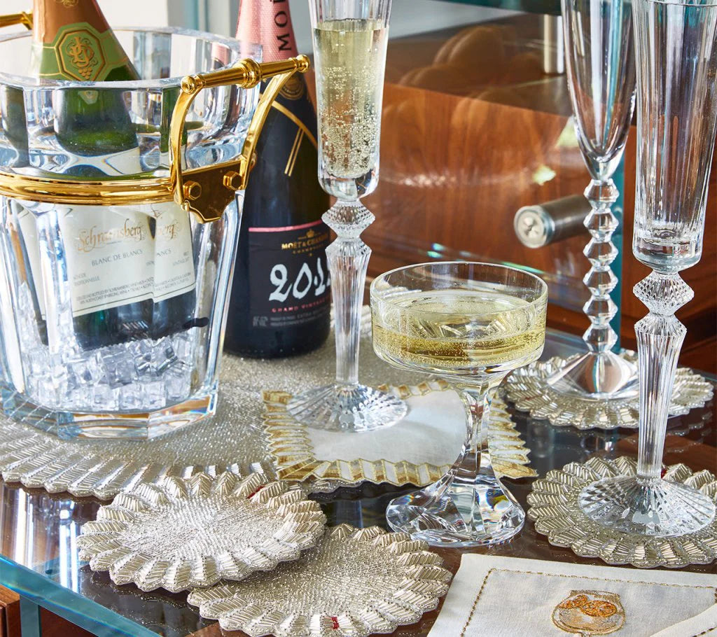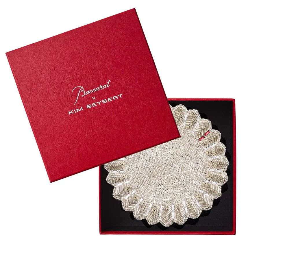 The prismatic quality of Baccarat's Mille Nuits collection inspired the Etoile Coasters, shown in silver. A mixture of glass and gemstones creates a three-dimensional ridged edge reminiscent of the classic dinnerware. Emblematic of Baccarat, a signature red accent gemstone adorns the coaster. Perfect as a hostess gift, the coasters are sold in a gift box as a set of four.