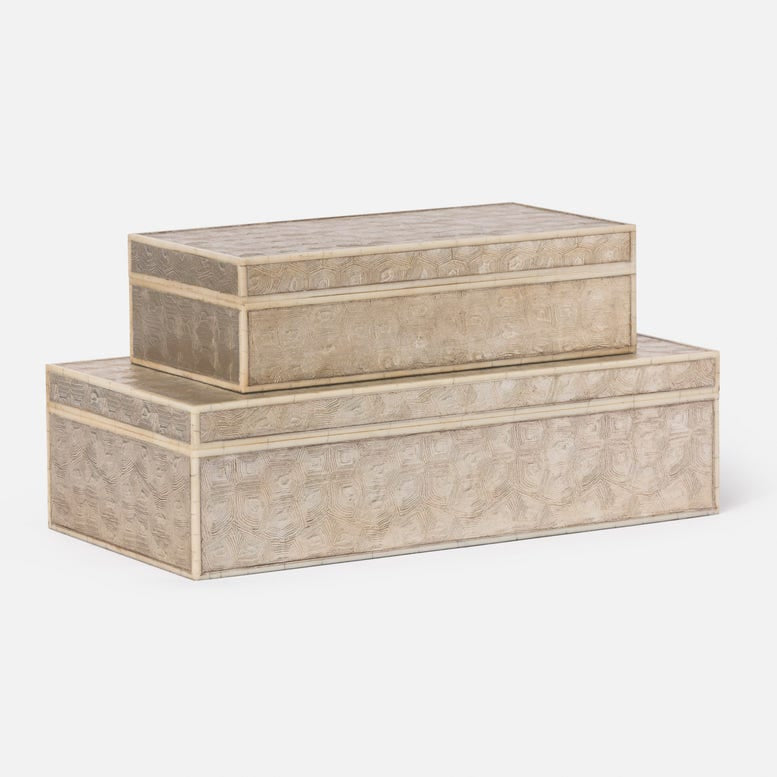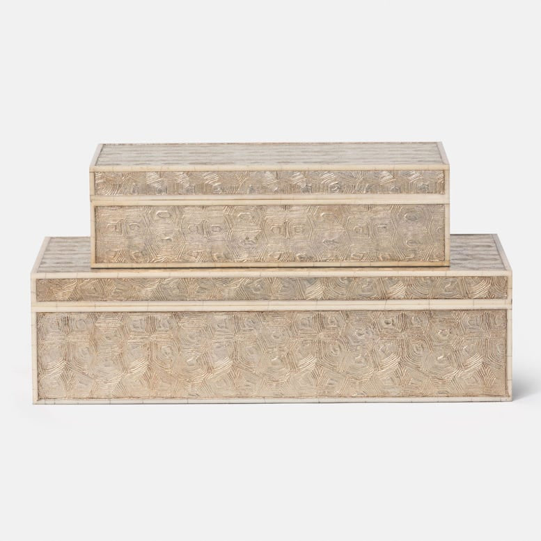 Lavish and handsome, this box set has a gold-like glow and faux aged bone edges. Lined with cream velvet.