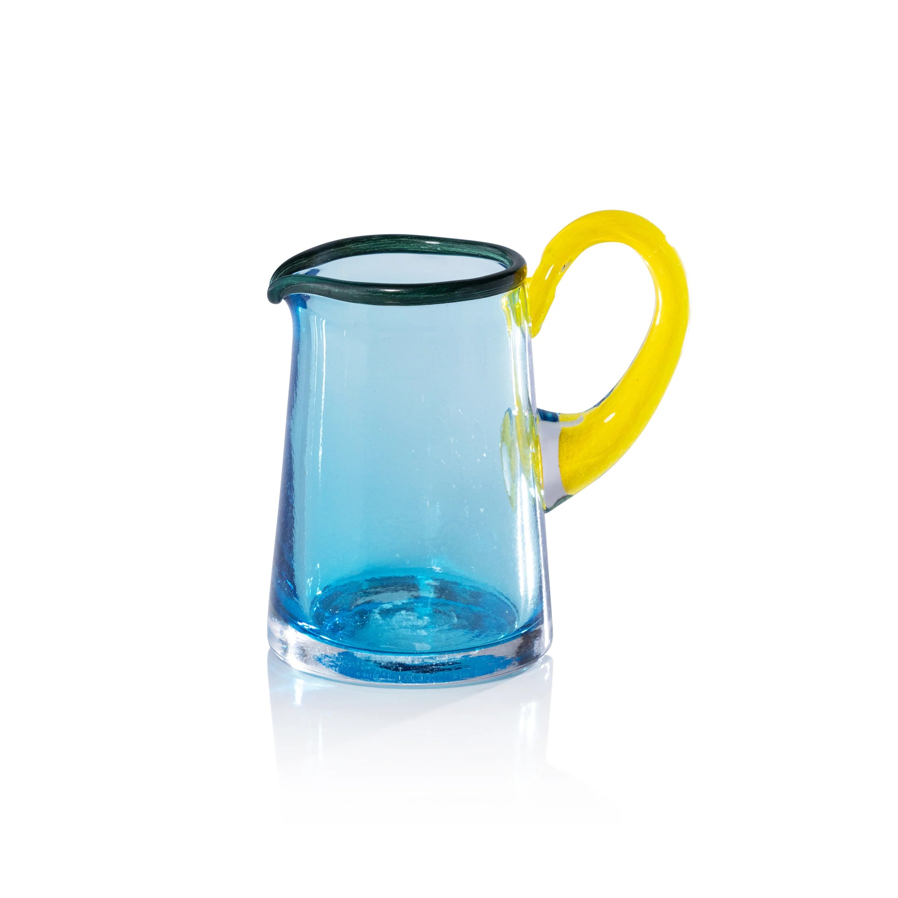 A charming small pitcher made of soda-lime glass, featuring vibrant colors of aqua, green, and yellow. Reminiscent of carefree summers in Spain, it's perfect for serving juice, cocktails, or simply adding a splash of color to your table.