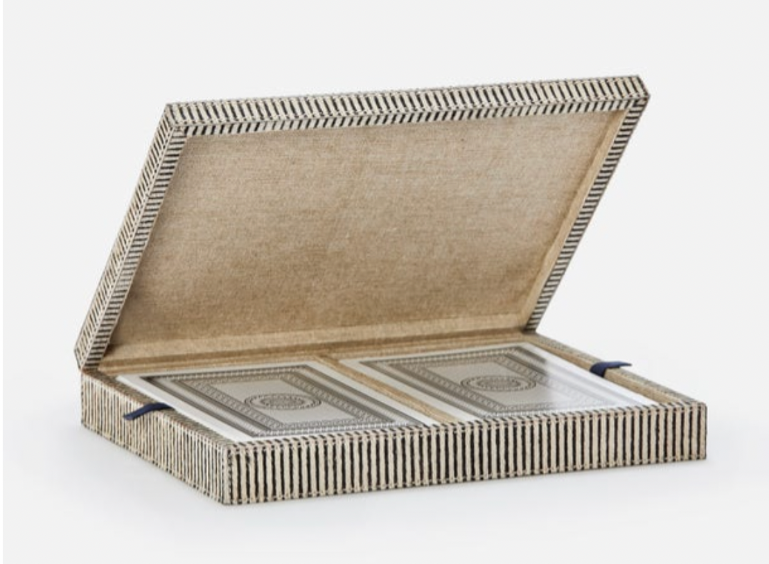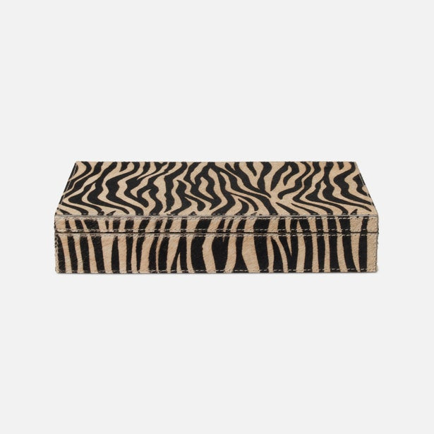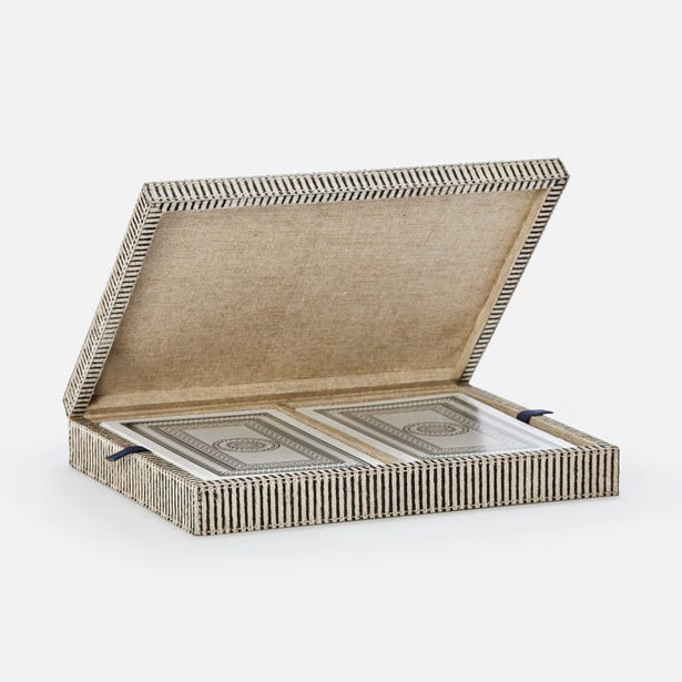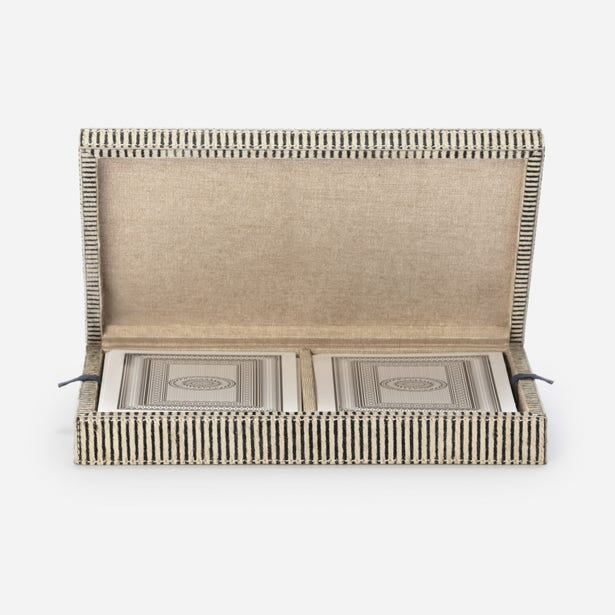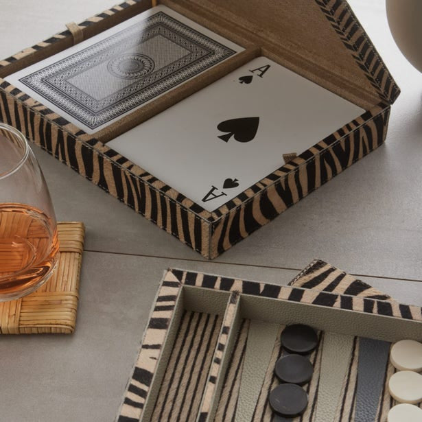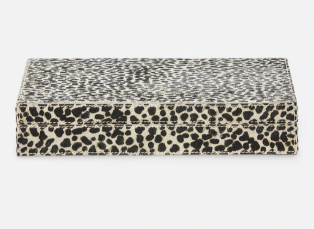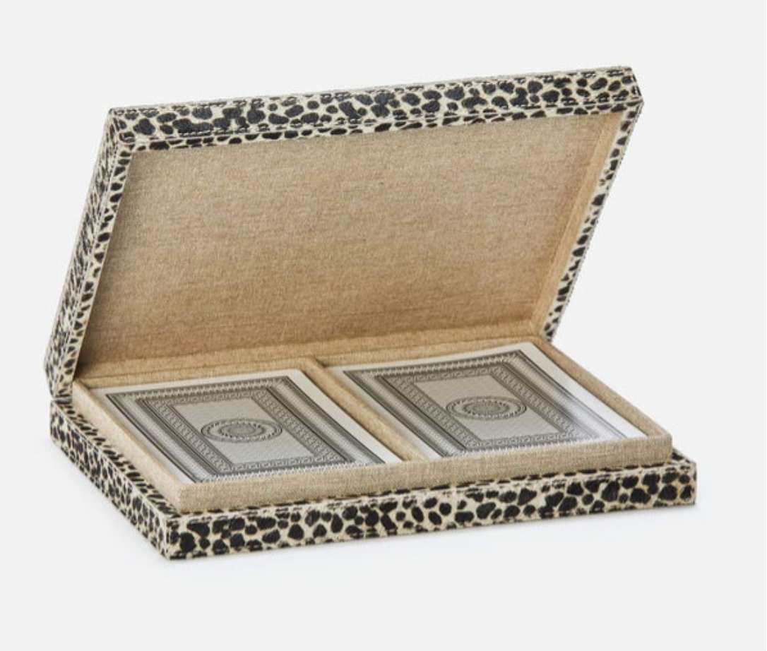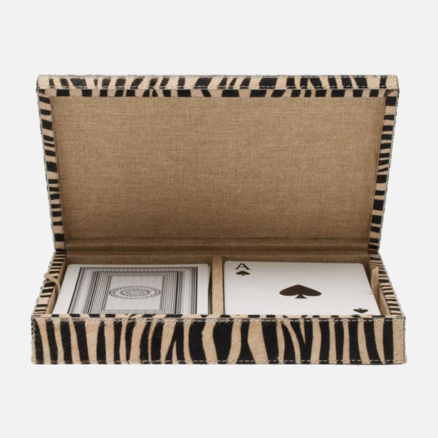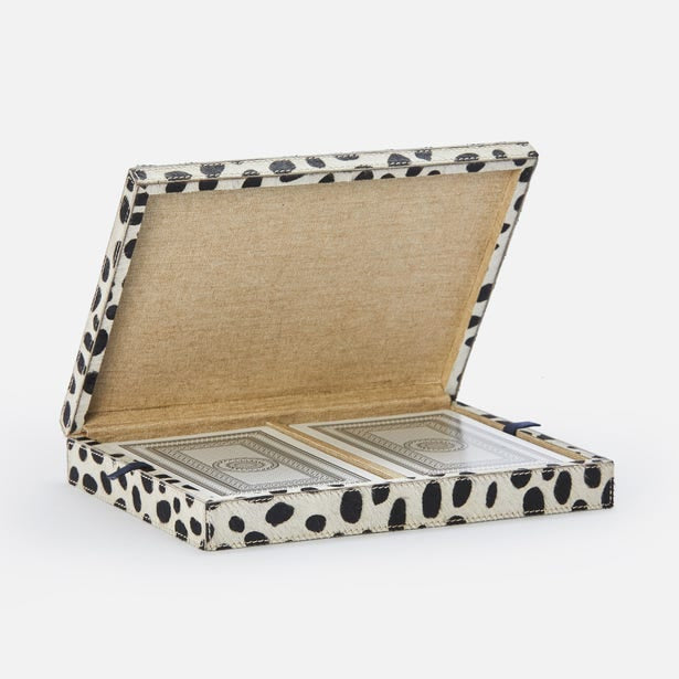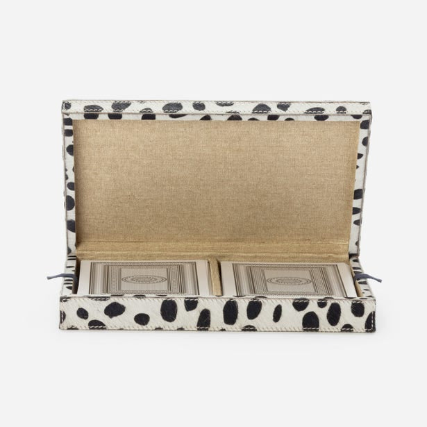 A must-have for people who take risks at the card table-and with style choices. More is more with our Lesten double deck boxes, especially in the playfully oversized option. Available in four spirited hair-on-hide prints.