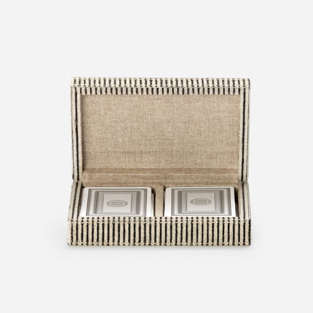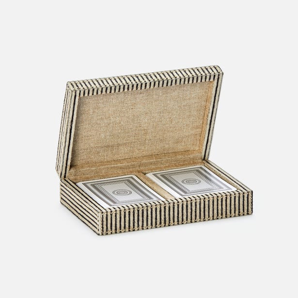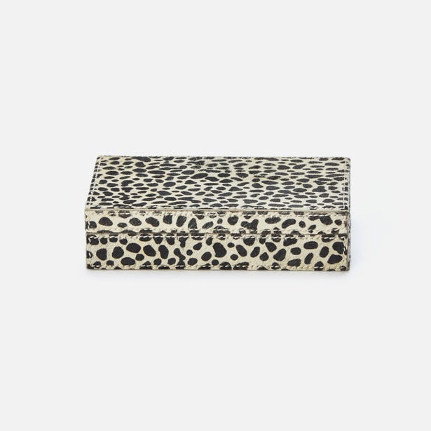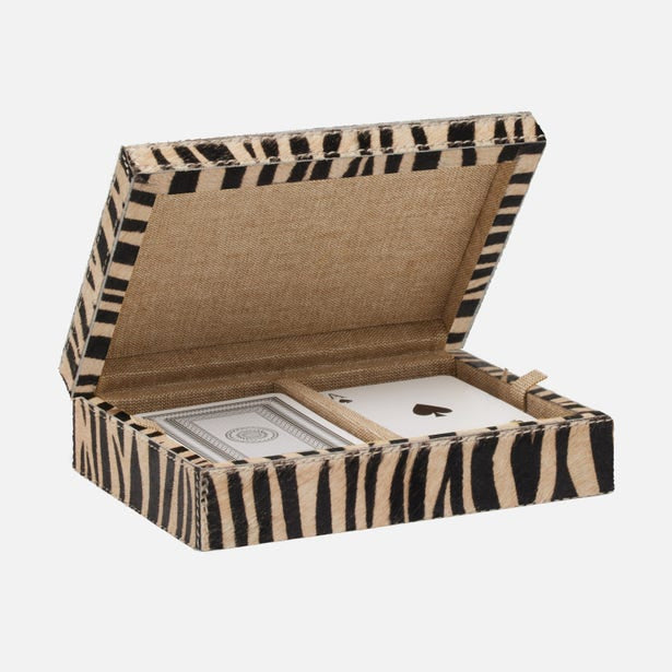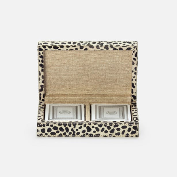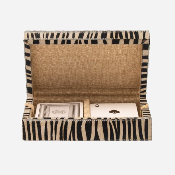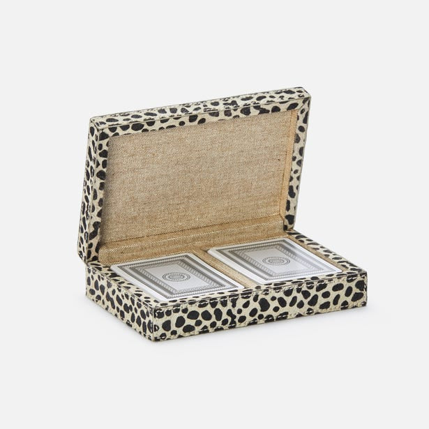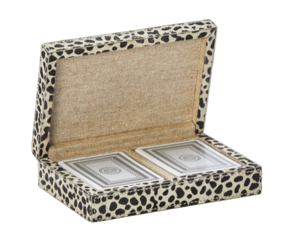 A must-have for people who take risks at the card table-and with style choices. More is more with our Lesten double deck boxes, especially in the playfully oversized option. Available in four spirited hair-on-hide prints.
