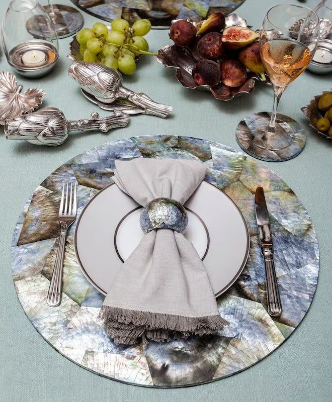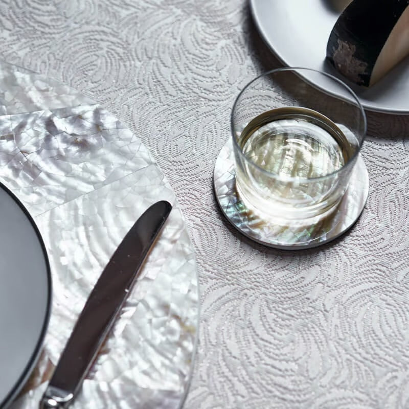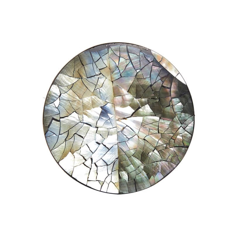 Cracked and layered shells form an eye-catching intricate design in our Pearl Coasters. A full spectrum of colors found in nature—blue, grey, green, black, white, gold, and silver—are all part of this kaleidoscope of color and pattern. Available in two colors in a lacquer holder.
