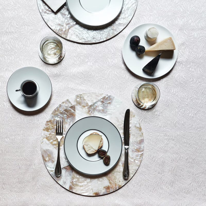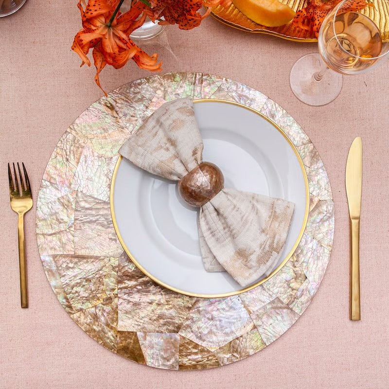 Cracked and layered shells form an eye-catching intricate design in our Pearl Placemats. The variation of natural texture and pattern brings an intriguing dimension to these modern and unique placemats. Shells in a gorgeous variety of warm hues—rose, blush, cream, white, and beige—are laid out in a geometric design. A full spectrum of colors found in nature—blue, grey, green, black, gold, and silver—are all part of this kaleidoscope of color and pattern. Available in three colors.