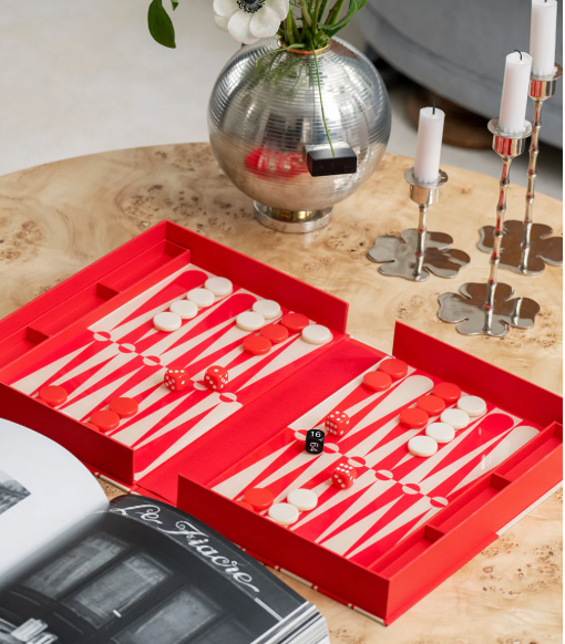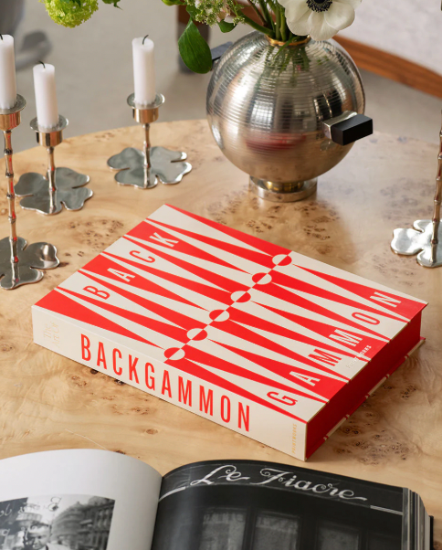 This Art of Backgammon takes on an eclectic twist with expressive patterns, bold red and cream tones, and eye-catching typography. The set opens like a book to reveal a sleek, acrylic playing surface — designed to stand out both in play and on display. Perfect for hours of strategic fun, it also includes easy-to-follow instructions in English, French, and German. Suitable for two players, ages 5 and up.