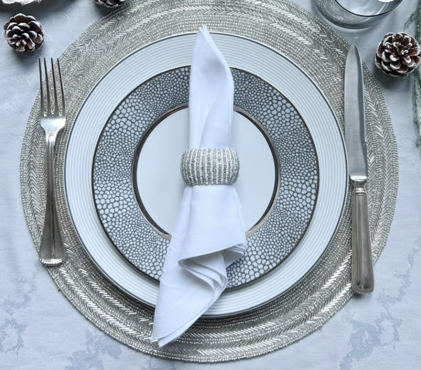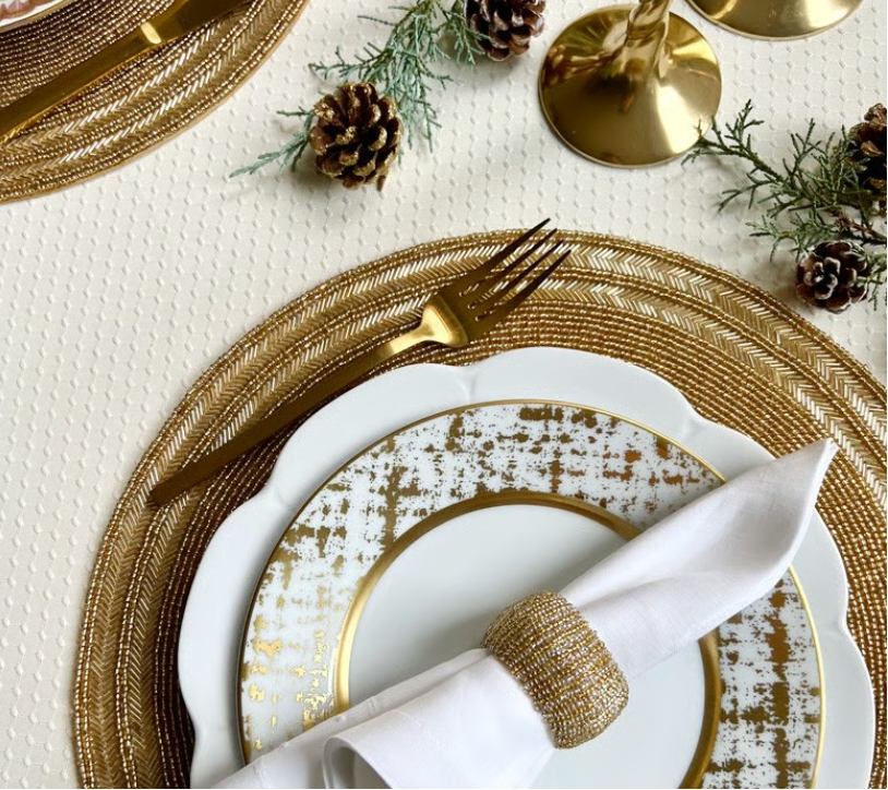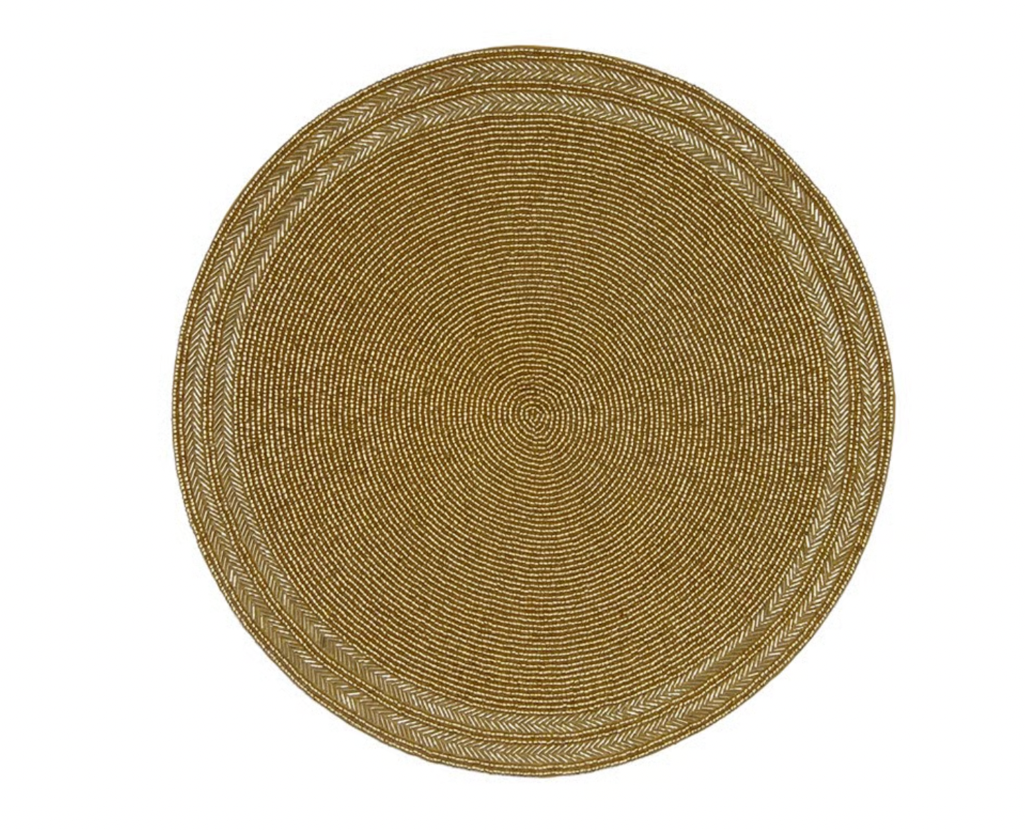 Perfect for year-round entertaining, this stunning hand-beaded Dazzle Placemat mixes luxe beading with an understated elegance. This beaded placemat has just the right amount of detail with side stacked bugle beads around the edge keeping it simple yet fabulous. Play up the gold or silver beading on this round placemat with coordinating gold or silver accents. It is equally gorgeous against pops of bright colors. Available in gold and silver.