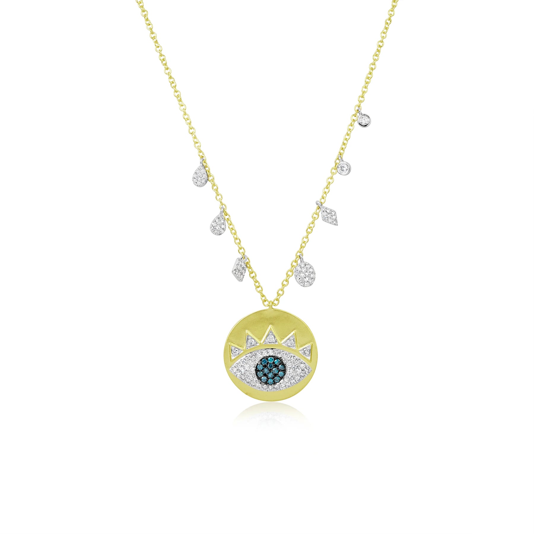 This unique necklace has a 14k yellow gold circle center with a diamond evil eye. Along the chain are multiple diamond charms.